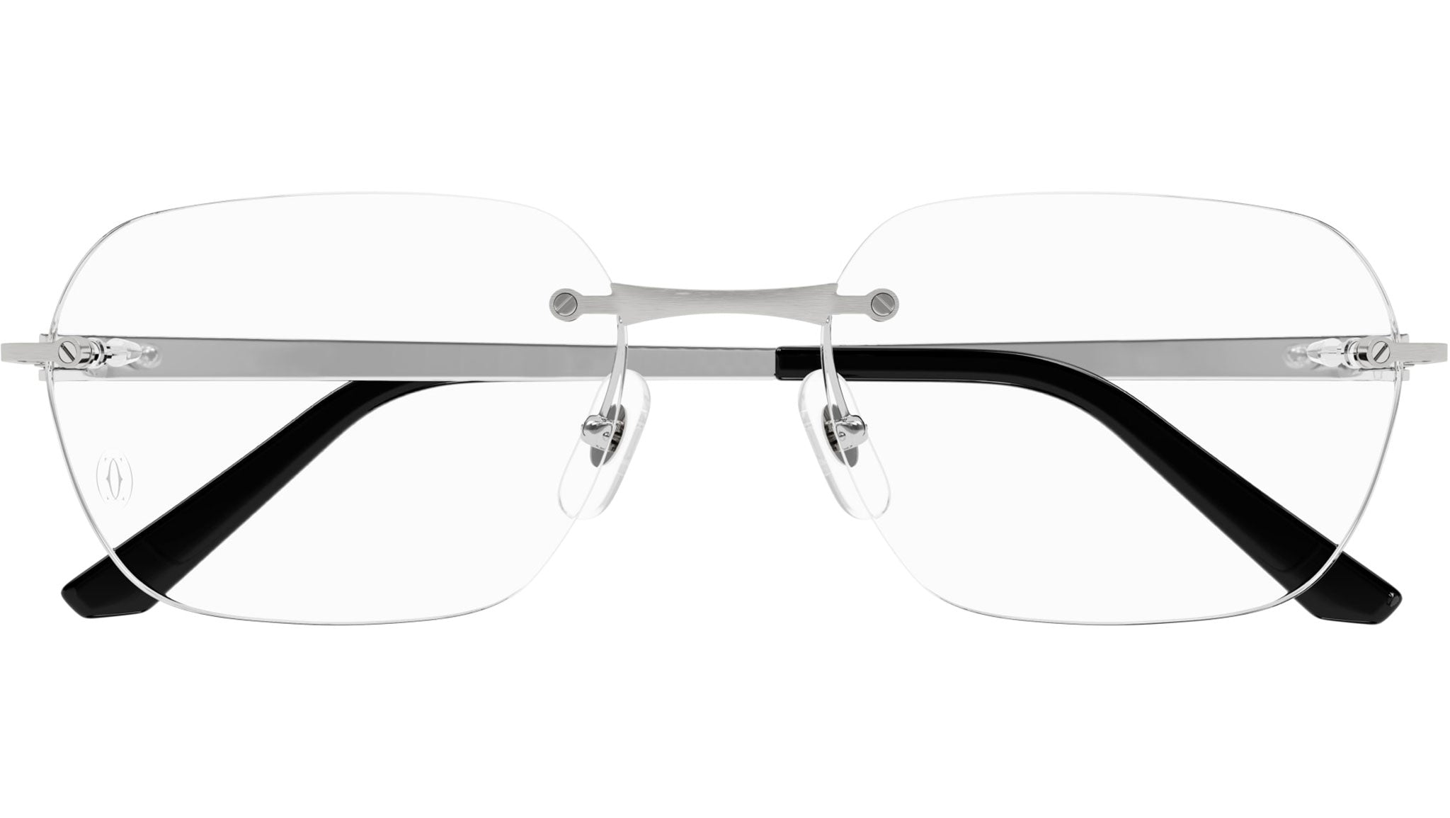 Occhiali da vista Cartier linea Exception modello CT0407O variante colore 002 finish platino levigato con astine color argento.