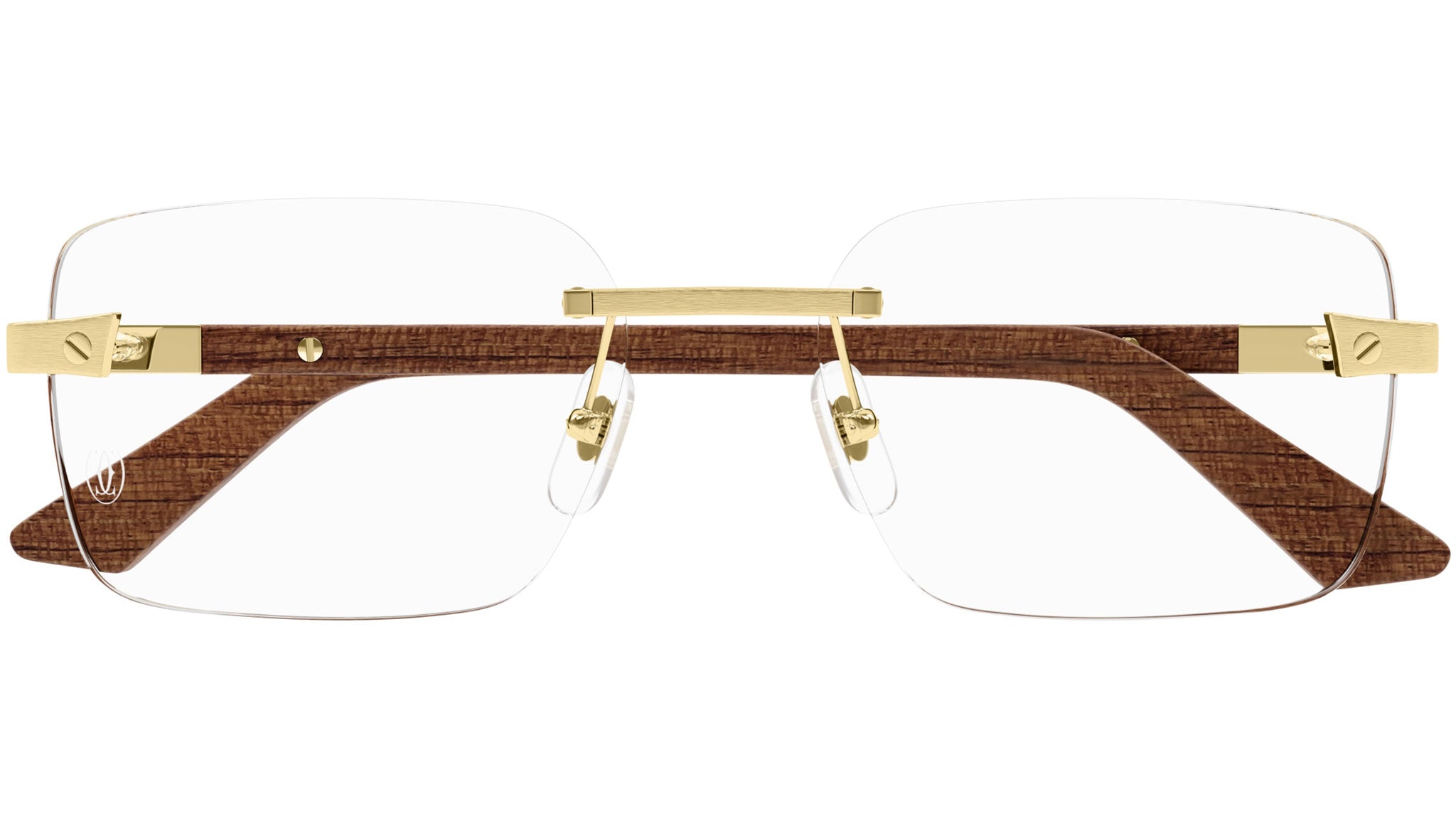 Occhiali da vista Cartier linea Exception modello CT0411O variante colore 002 oro satinato con astine color marrone.