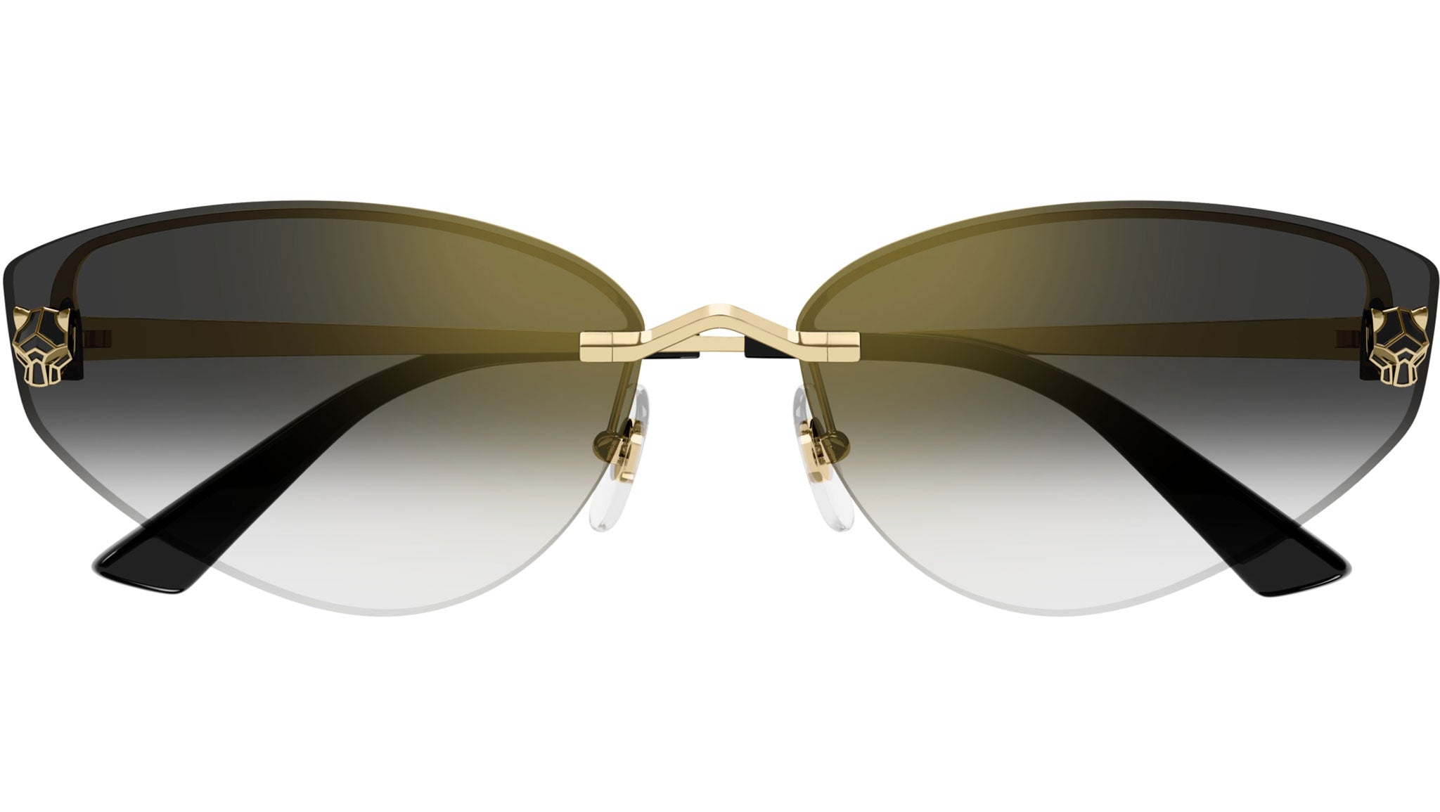 Occhiali da sole Cartier linea Core Range modello CT0431S cat eye in metallo codice colore 001 oro finitura smooth con aste oro e lenti color grigio sfumato con flash dorato.