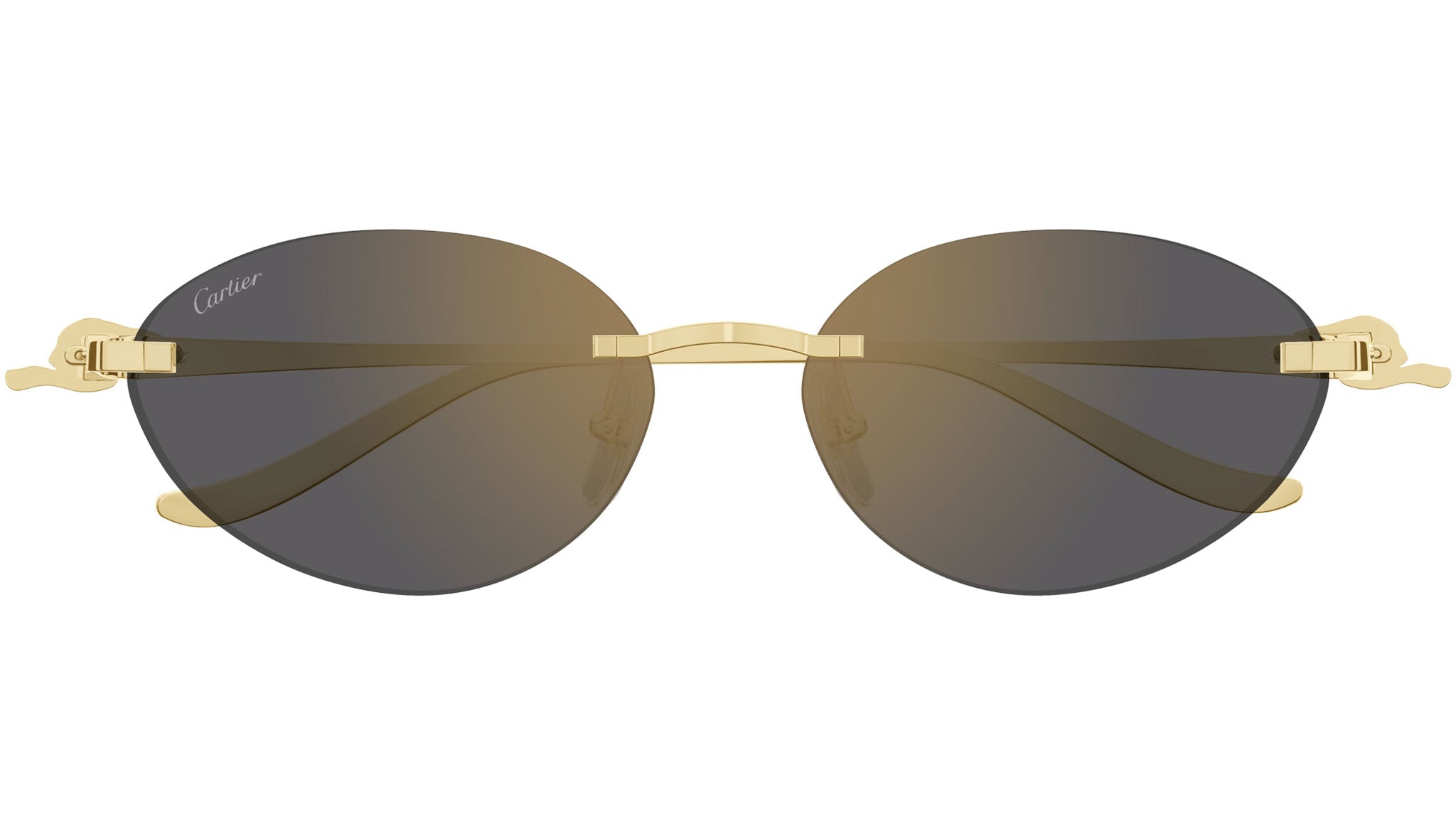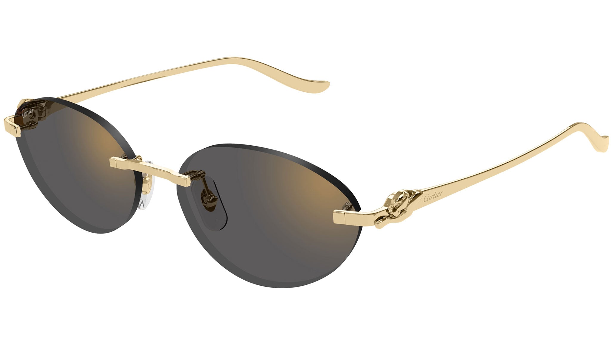 Occhiali da sole Cartier linea Core Range modello CT0504S in metallo a gatto codice colore 001 oro finitura smooth con aste color oro e lenti color grigio con flash oro.