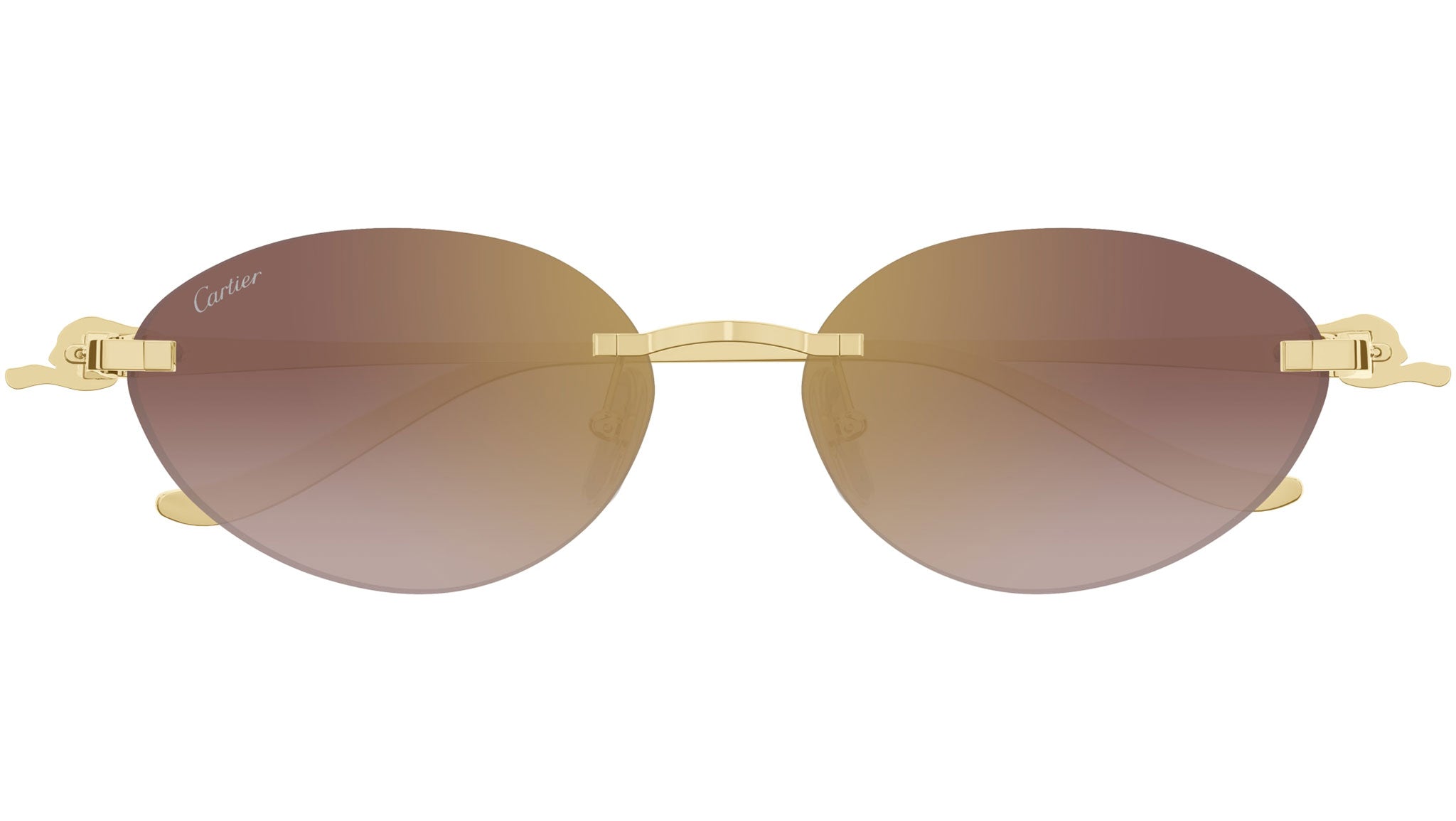 Occhiali da sole Cartier linea Core Range modello CT0504S in metallo a gatto codice colore 002 oro finitura smooth con aste color oro e lenti color bordeaux sfumato con flash oro.