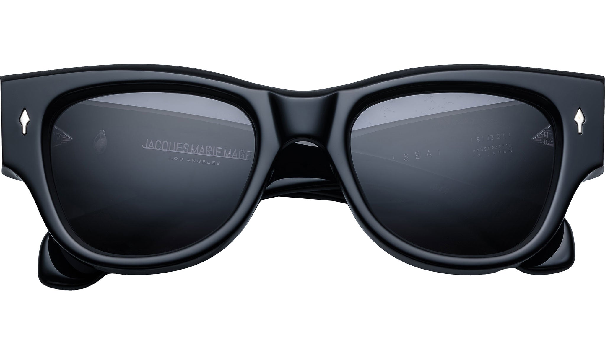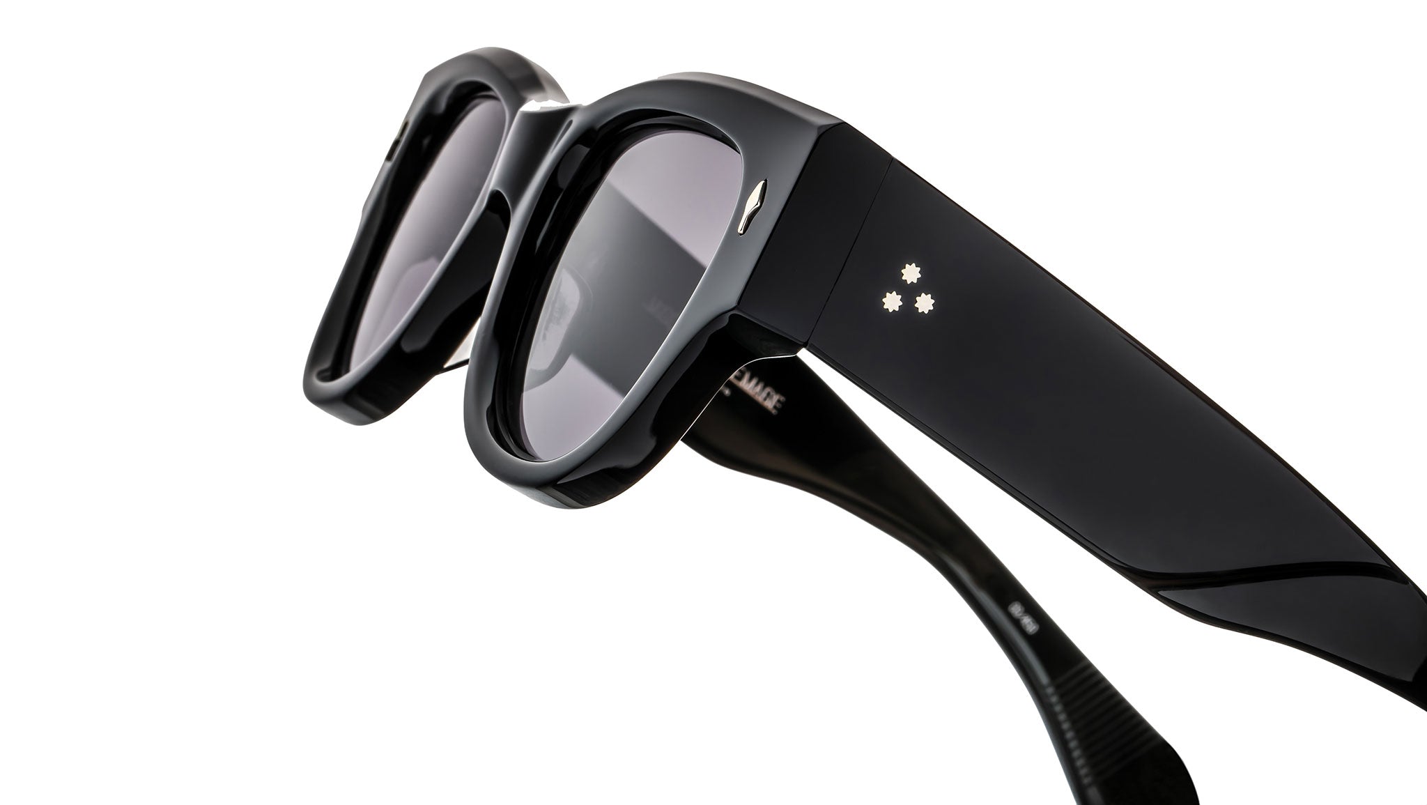 Black 10mm cured cellulose acetate frame with custom double-laminated acetate temples, enhanced by precious metal hardware and black lenses. Features a sterling silver signature arrowhead front pin, silver cantilever wirecore, and a silver tension-secured custom 7-barrel hairline hinge. Fitted with jet CR-39 4 base lenses with backside anti-reflective treatment.