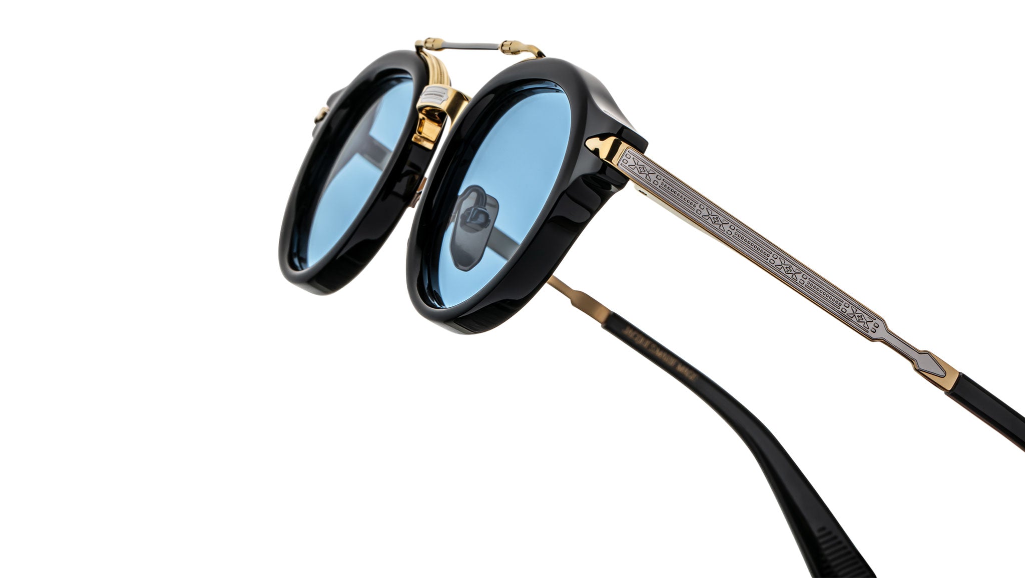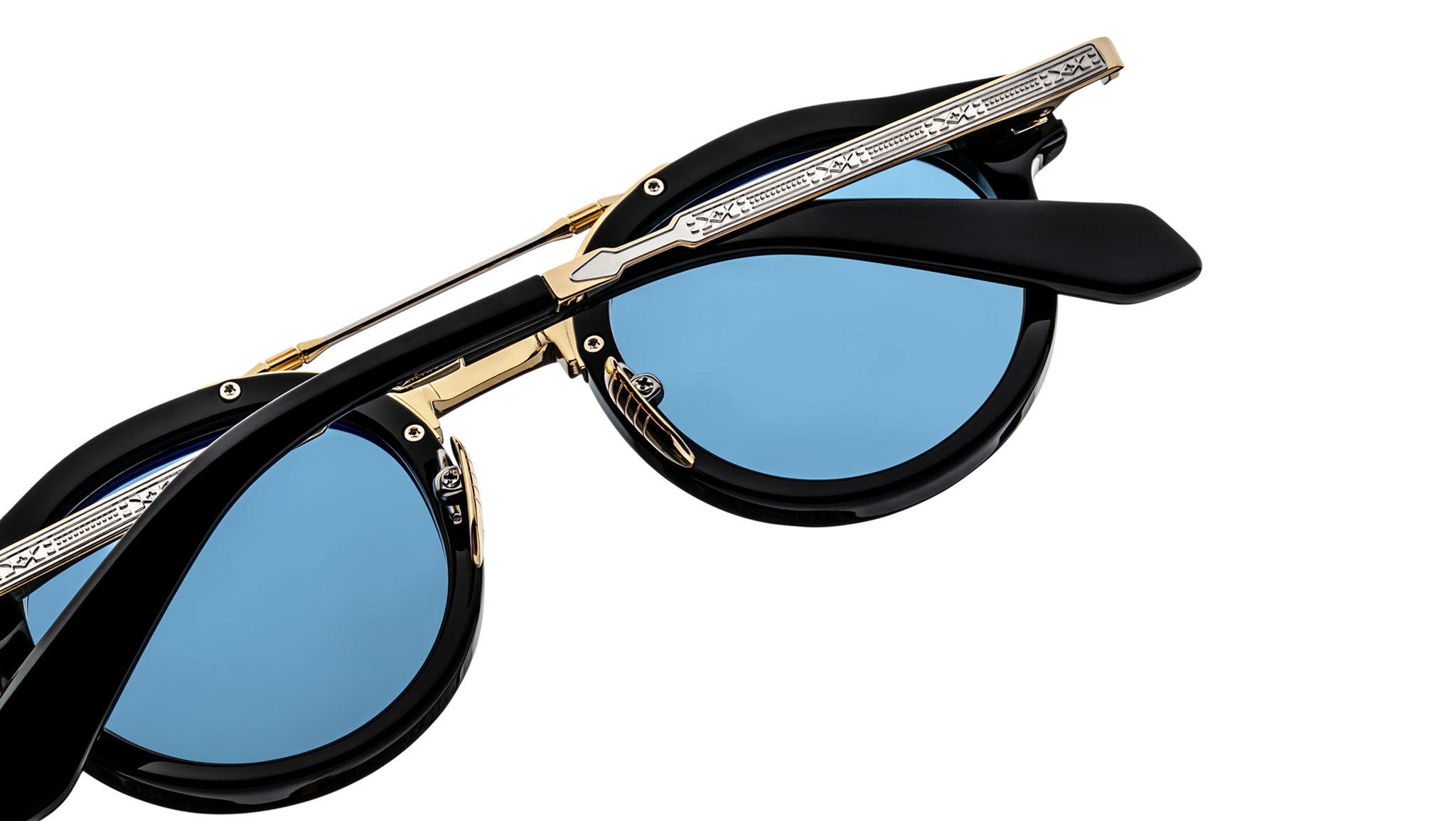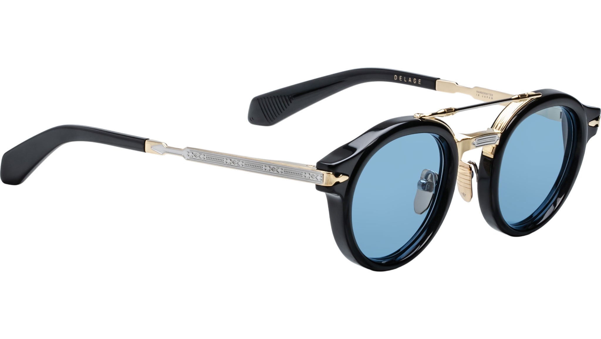 Moon gold 100% beta titanium frame with sterling silver accents, black cured cellulose acetate details and blue lenses, moon gold engraved titanium temples with acetate tips, sterling silver tension-secured custom arrowhead monoblock hinge, black cellulose acetate components, custom nose pads with logo and hairline engraving, Azul CR-39 2-base lenses with backside anti-reflective treatment.