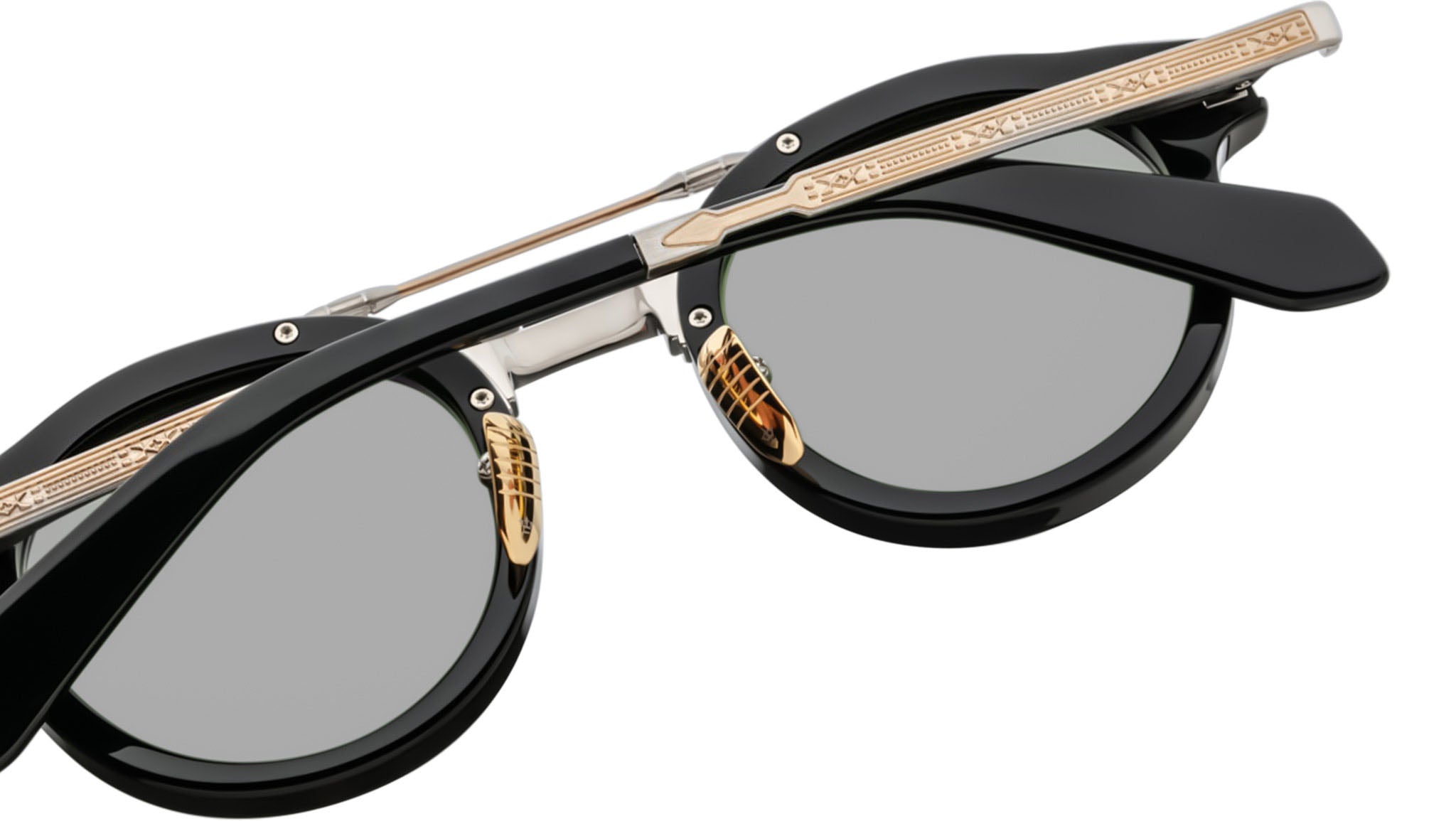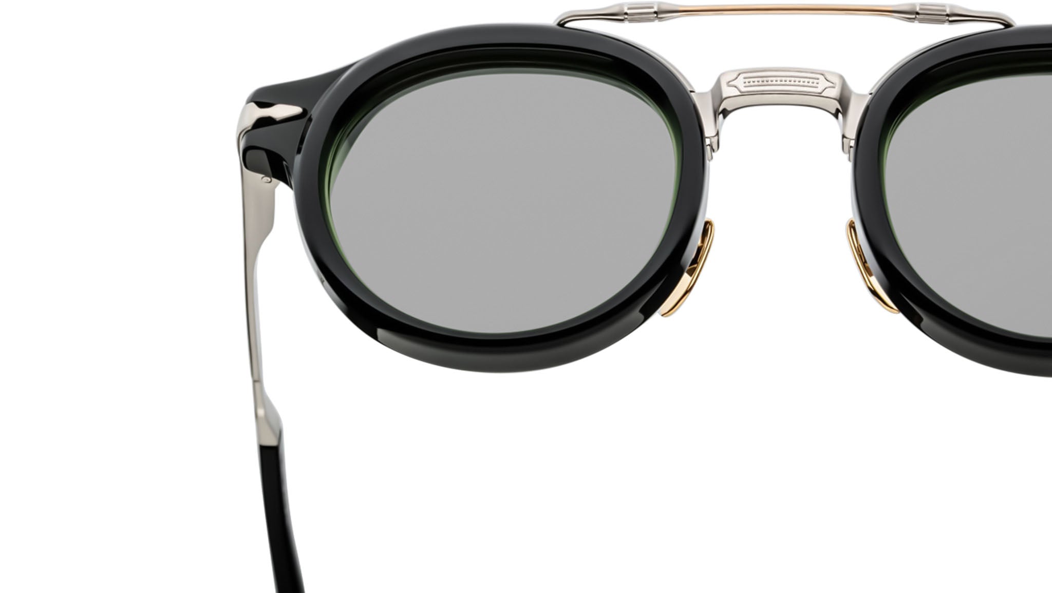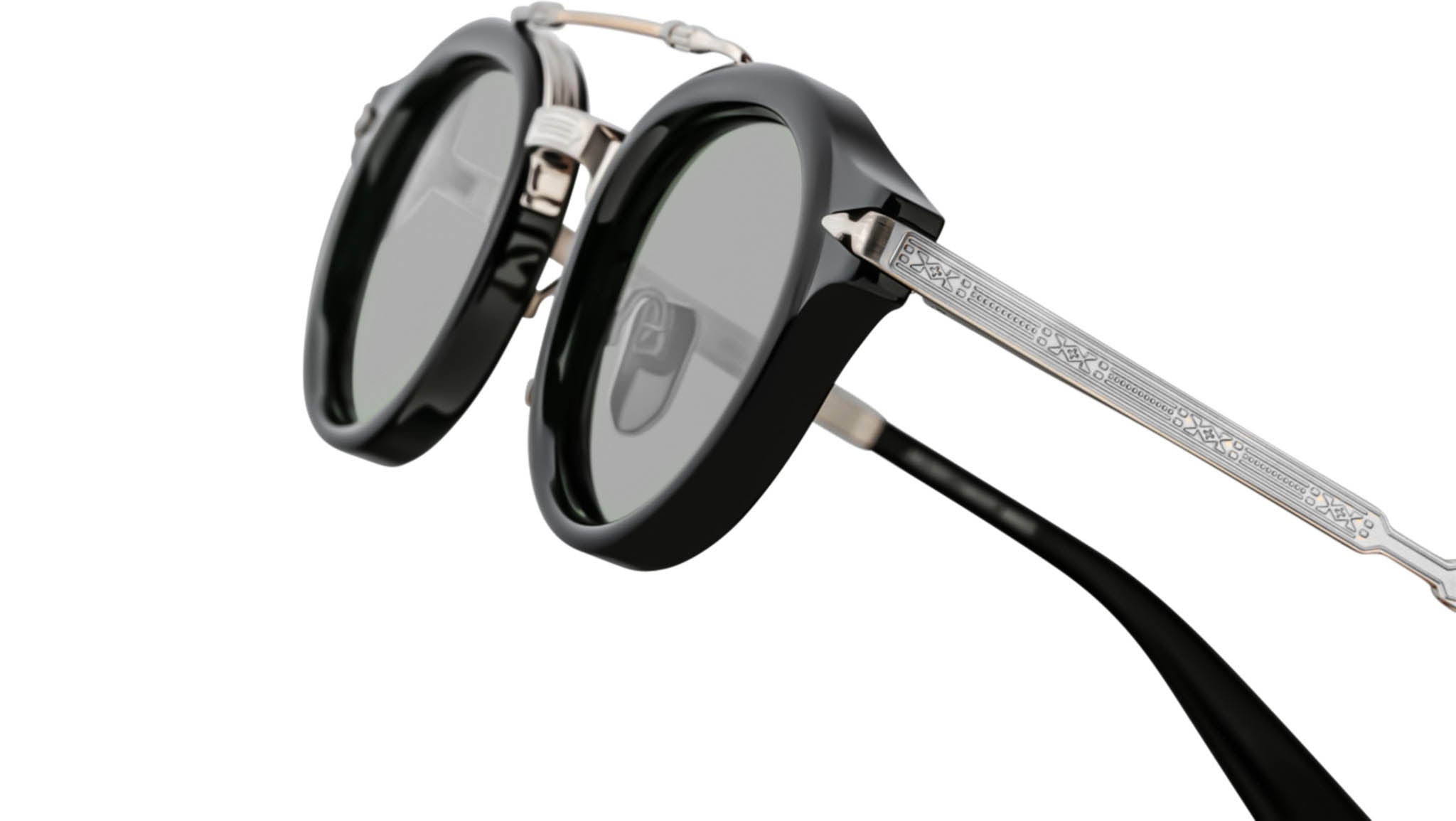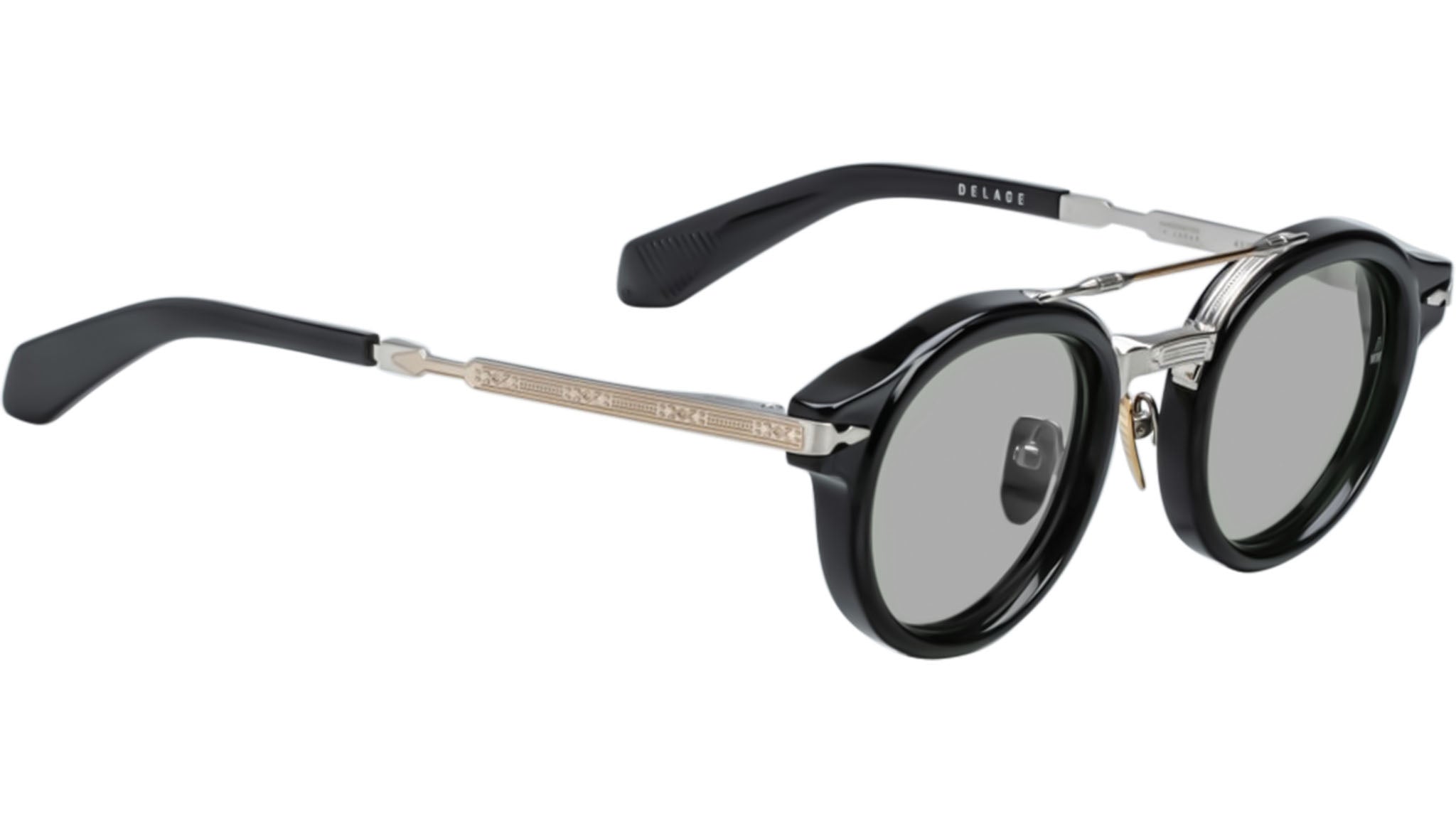 The Jacques Marie Mage Delage spectacles are elegant circular frames inspired by the sophisticated styles of the 1950s. Combining a bold acetate lens shape with a distinct titanium brow bar, these combo spectacles exude timeless charm. Featuring the brand's signature arrowhead monoblock hinge and finely engraved temples with a unique arrowhead motif, the Delage seamlessly blends Art Deco fluidity and embellishments with modern refinement. Perfect for the confident wearer, these frames embody a subtle old-world sensibility reimagined for contemporary city life.