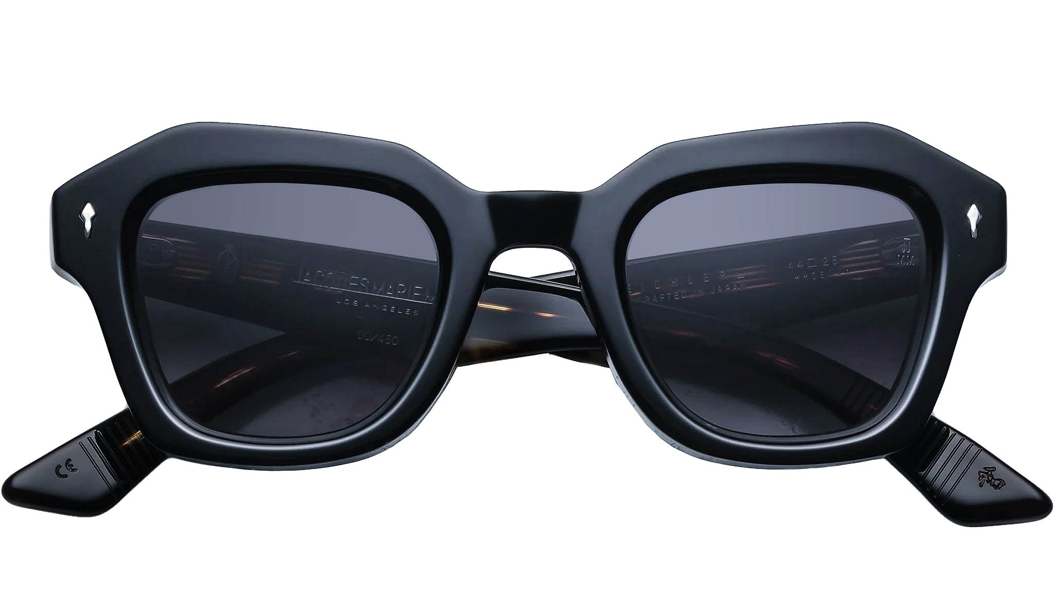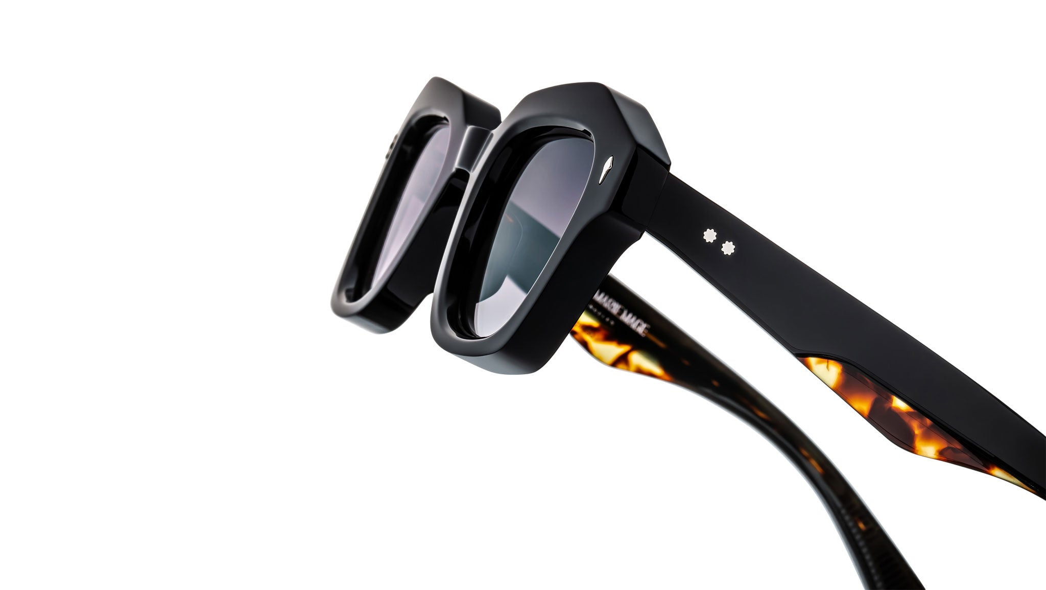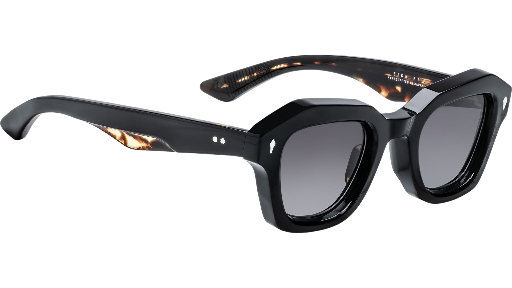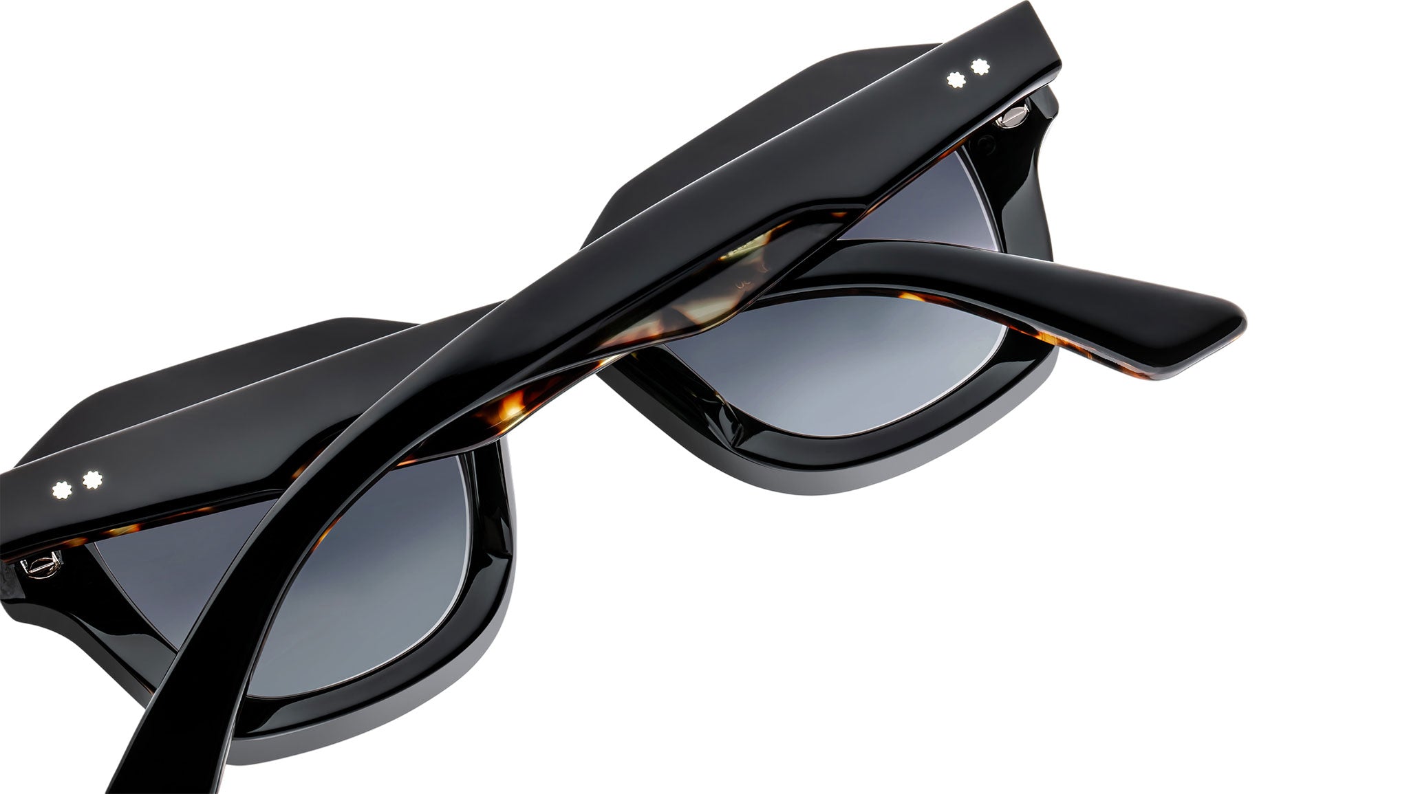 Black 10mm cured cellulose acetate frame with custom double-laminated acetate temples featuring precious metal hardware and black gradient lenses, sterling silver arrowhead front pin, hidden silver lever wirecore, silver tension-secured custom ball hinge, jet gradient CR-39 2-base lenses with backside anti-reflective treatment.