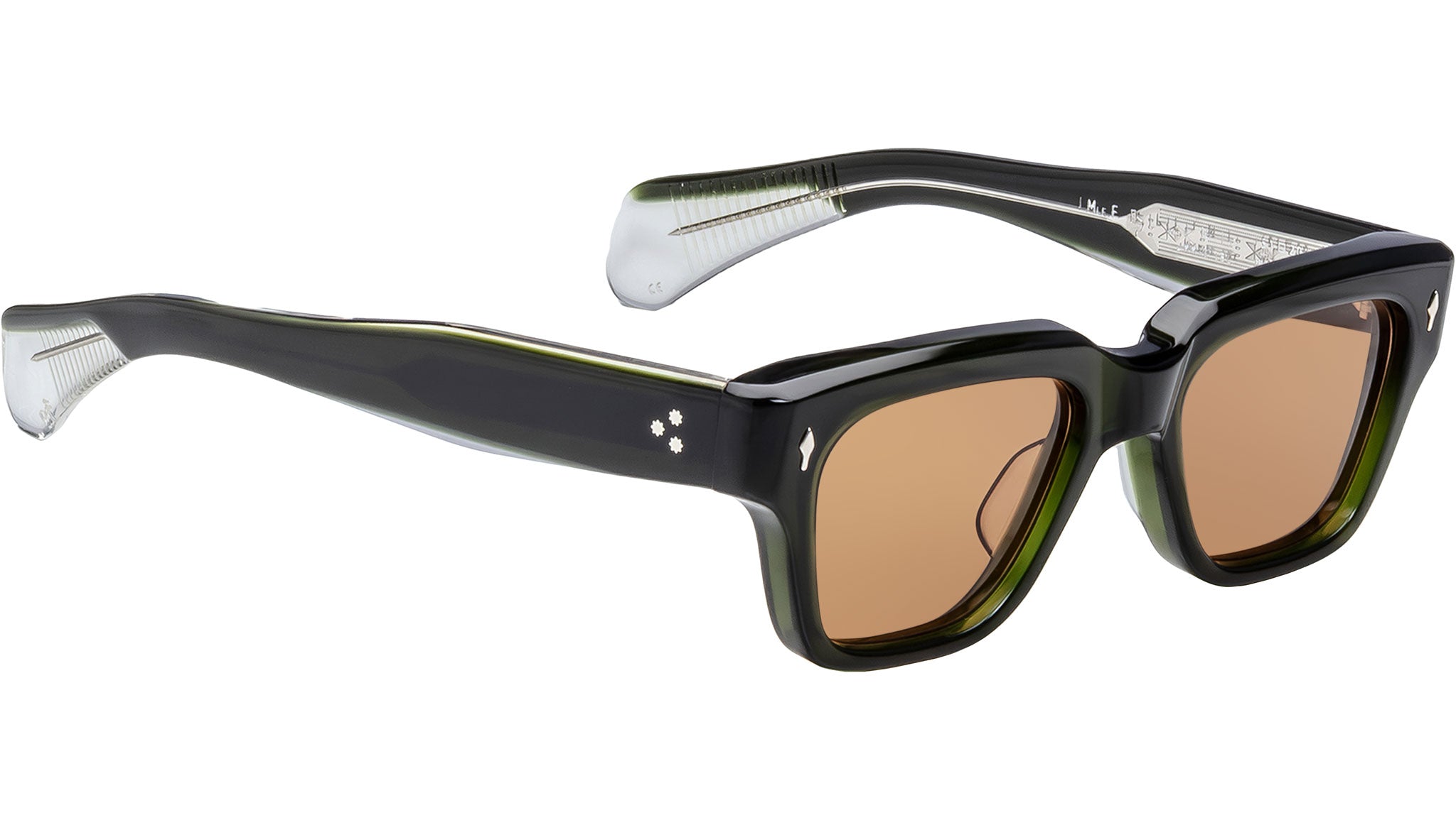 Green 10mm cured cellulose acetate frame with custom double-laminated acetate temples and orange lenses, sterling silver signature arrowhead front pin, exposed inner temple with silver custom hairline-engraved wirecore, sterling silver tension-secured custom 9-barrel hinge with silver gold spur-shaped rivets, orange CR-39 4-base lenses with backside anti-reflective treatment.