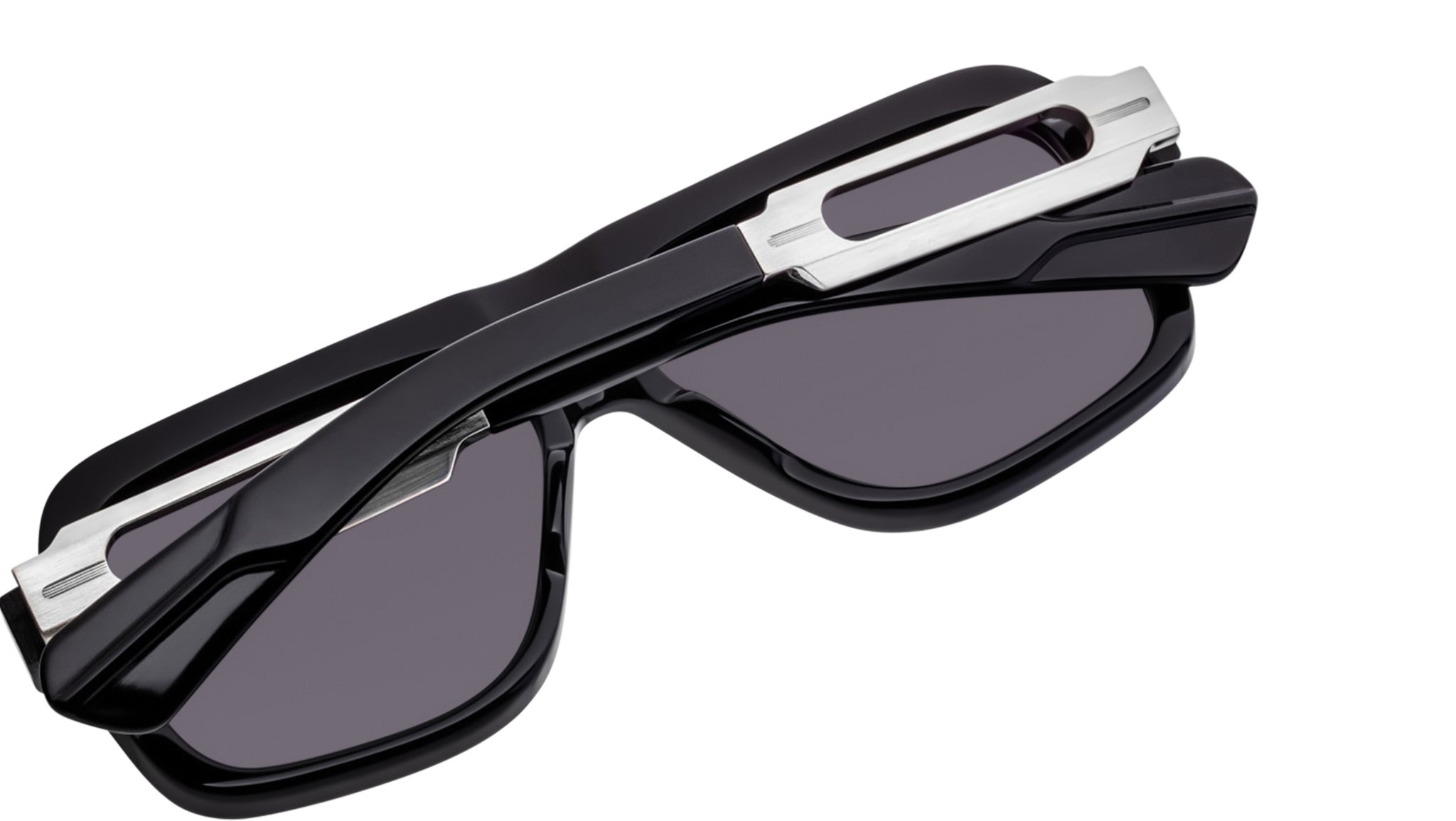 Black 10mm cured cellulose acetate frame with silver 100% beta titanium temples featuring black cellulose acetate temple tips and black lenses. Sterling silver signature arrowhead front pin. Combo temples with silver hardware and black cellulose acetate. Silver tension-secured custom monoblock hinge. Jet CR-39 4-base lenses with backside anti-reflective treatment. 100% UV protection.