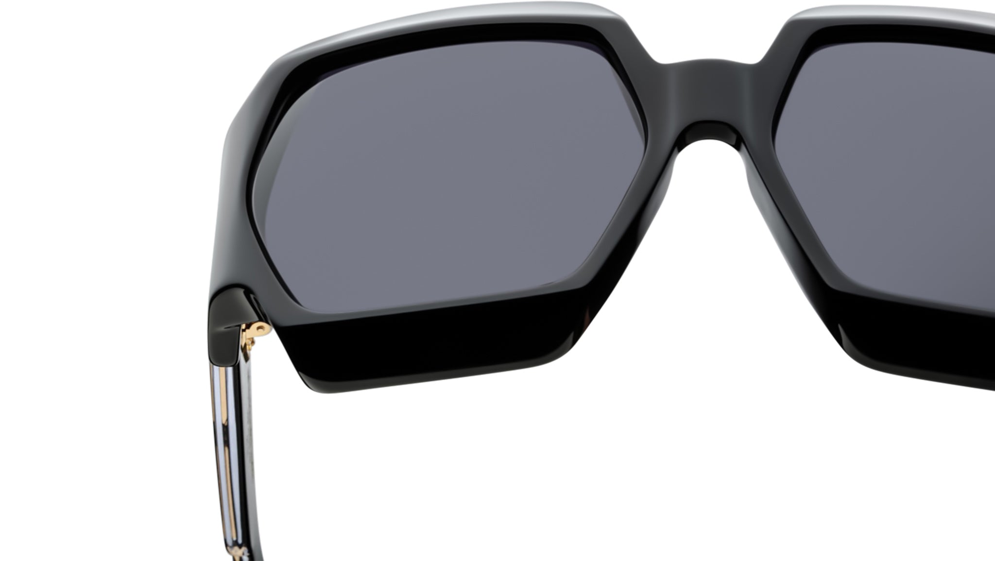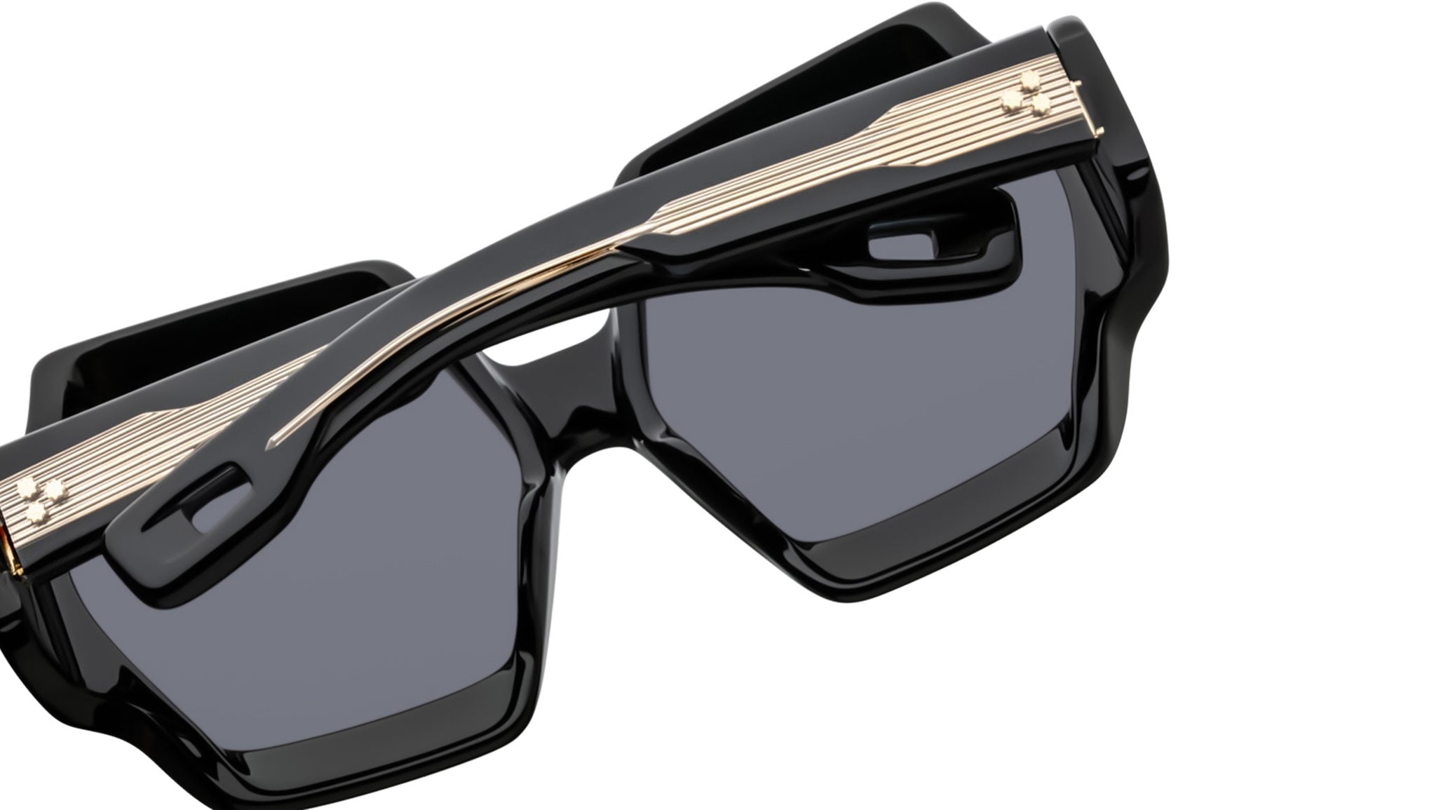 Black 9mm cured cellulose acetate frame with custom double-laminated acetate temples featuring precious metal hardware and black lenses. Exposed dark gold cantilever wirecore, dark gold tension-secured custom 7-barrel hairline hinge, and black CR-39 6-base lenses with backside anti-reflective treatment. Includes a custom eyewear chain. Rectangular frame shape with 100% UV protection. *Not suitable for use when driving.* Frame total width: mm.