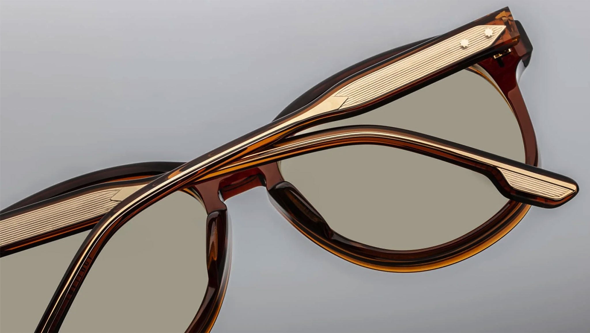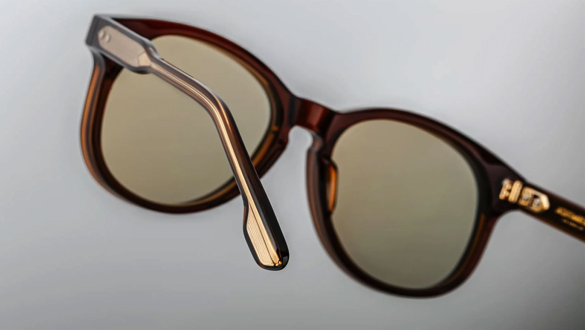 Brown 10mm cured cellulose acetate frame with custom double-laminated acetate temples, complemented by dark gold precious metal hardware and khaki glass lenses. Featuring a dark gold signature arrowhead front pin, exposed Vauxhall wirecore, and a tension-secured custom 5-barrel hairline hinge. The 4-base lenses include a backside anti-reflective treatment, ensuring 100% UV protection. Frame total width: mm.