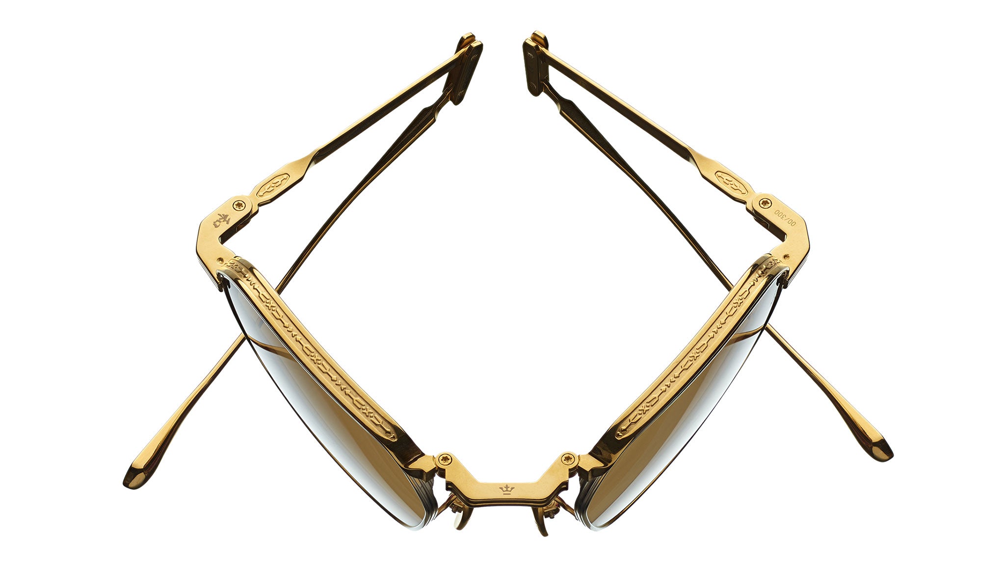 Moon gold and silver 100% beta titanium frame with moon gold and silver folding titanium temples, silver eyerim, and a moon gold folding top bar, featuring a moon gold tension-secured custom hinge and custom gold nose pads with logo and hairline engraving. Fitted with sepia gradient Armorlite 4-base lenses with backside anti-reflective treatment for enhanced clarity and comfort.