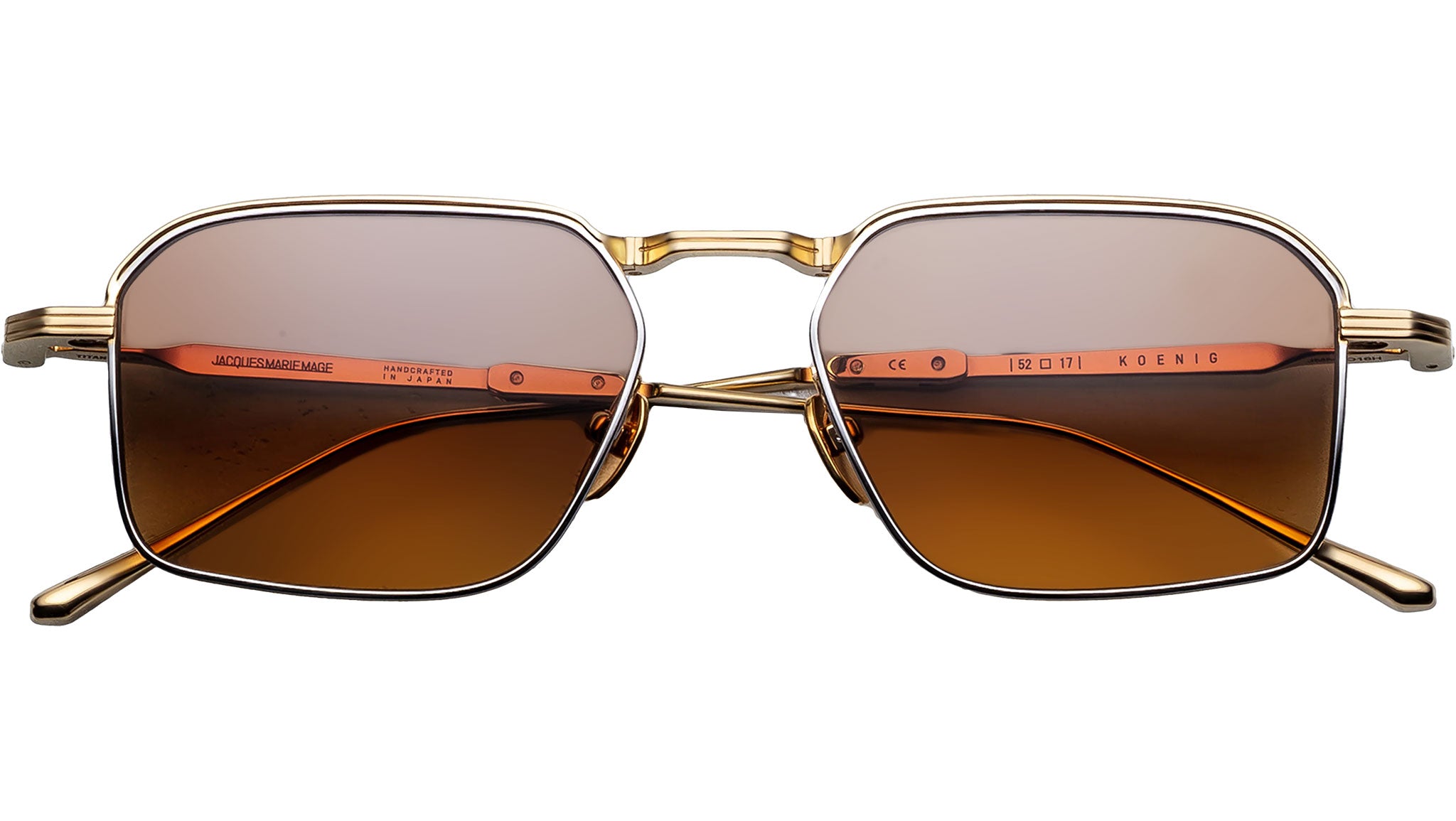 The Jacques Marie Mage Koenig is a refined, '60s-inspired folding frame handcrafted in Japan from 100% beta titanium, featuring a sophisticated rectangular silhouette with a medium fit. Part of the limited-edition Éditions Pliables collection, this innovative design folds at the bridge and temple tips for compact, pocketable portability—a feat of engineering developed over two years. Characterized by hairline-engraved wire rims that transition from 2mm at the eye to 4mm at the brow, the frame also includes custom monoblock hinges, pill-shaped nose pads with beveled detailing, and tailfin-shaped temple tips with recessed volumes. Finished with polished metal and epoxy accents, the Koenig reflects a union of modernist style and mechanical precision, accompanied by a new travel-sized top-loading eyewear case.