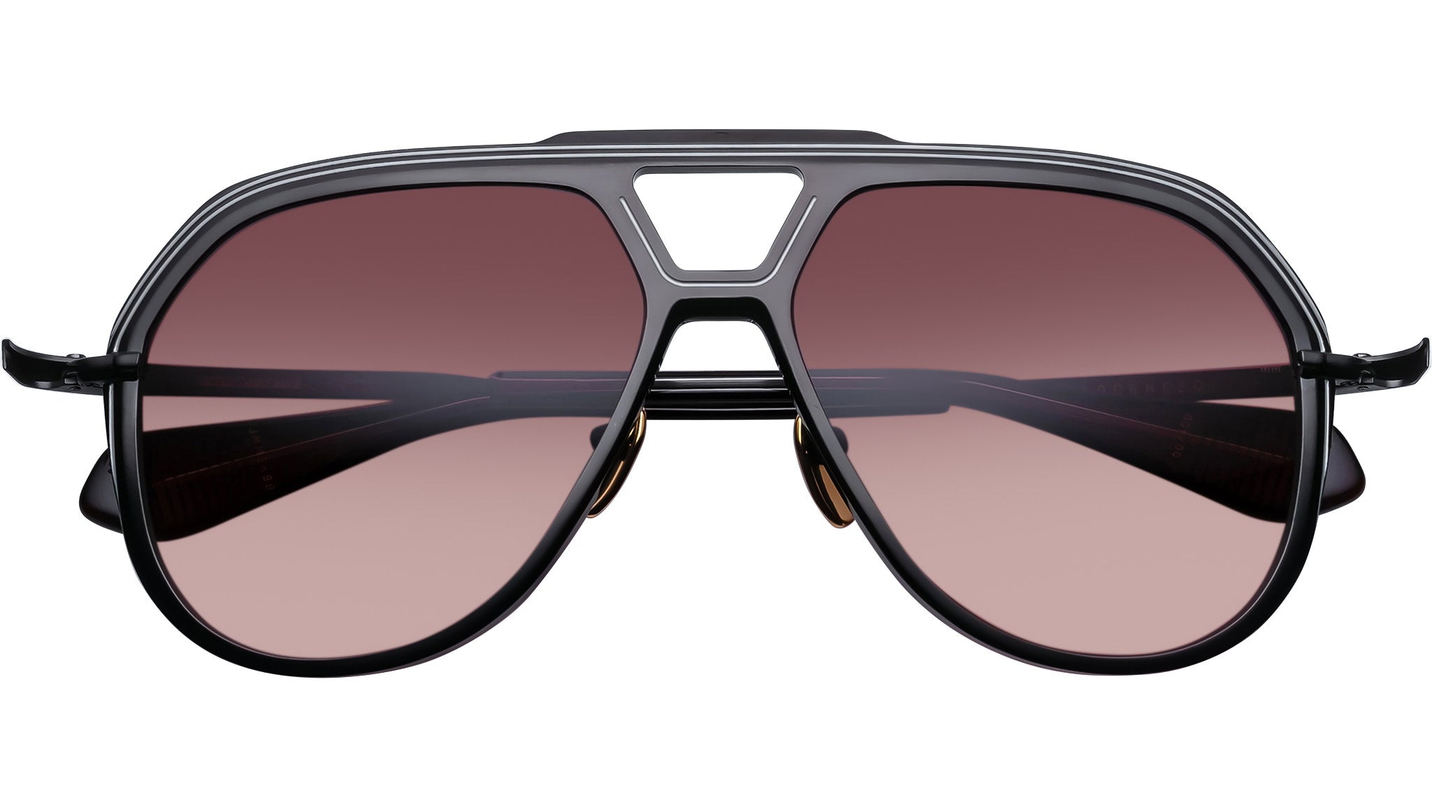 Black 100% beta titanium frame with purple lenses. Black engraved titanium temples with color acetate temple tips. Black tension-secured custom hidden hinge. Custom nose pads with logo and hairline engraving. Mahogany strike gradient CR-39 4-base lenses with backside anti-reflective treatment. 100% UV protection.