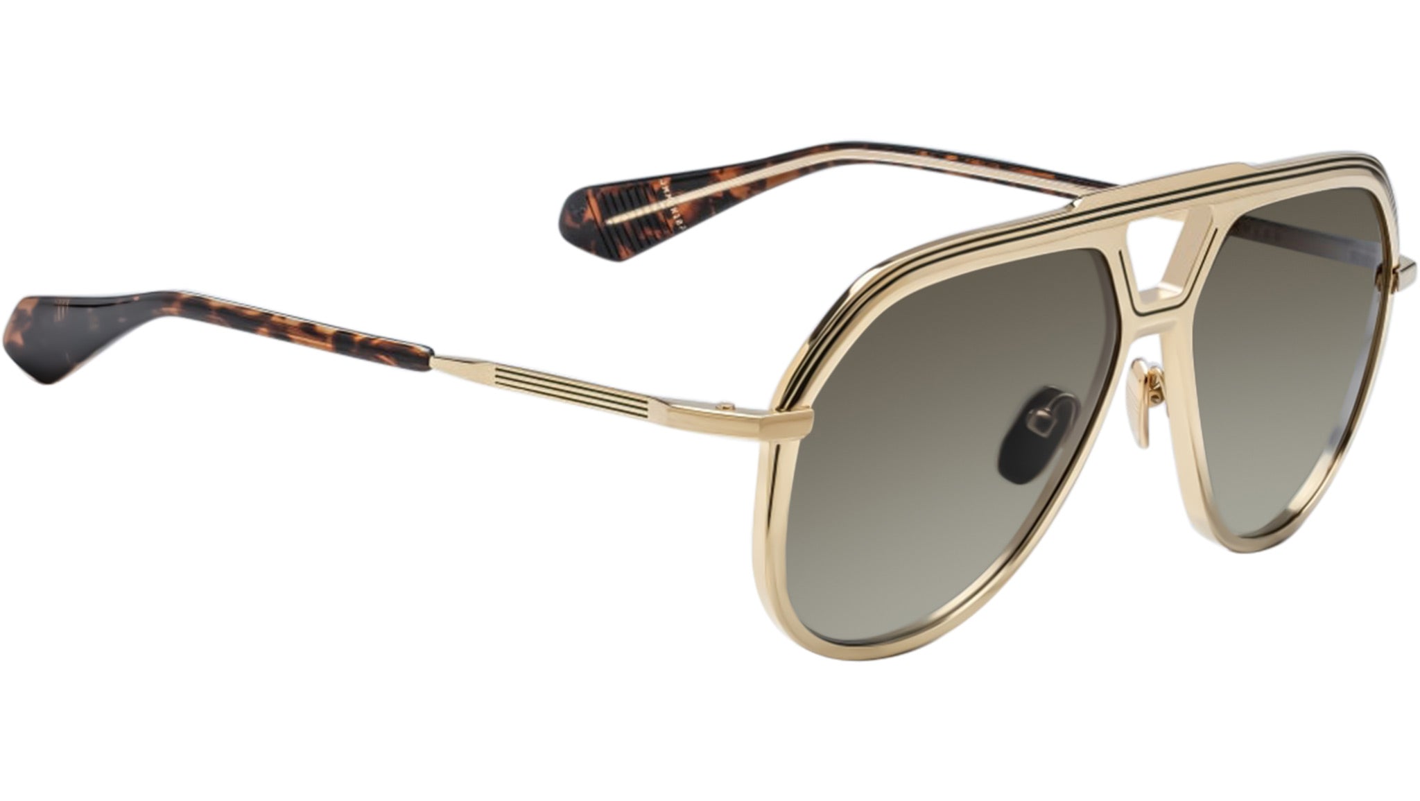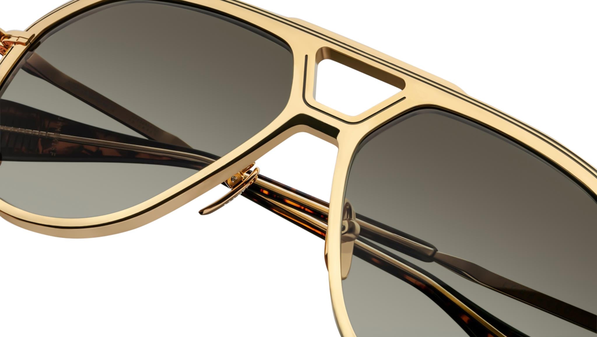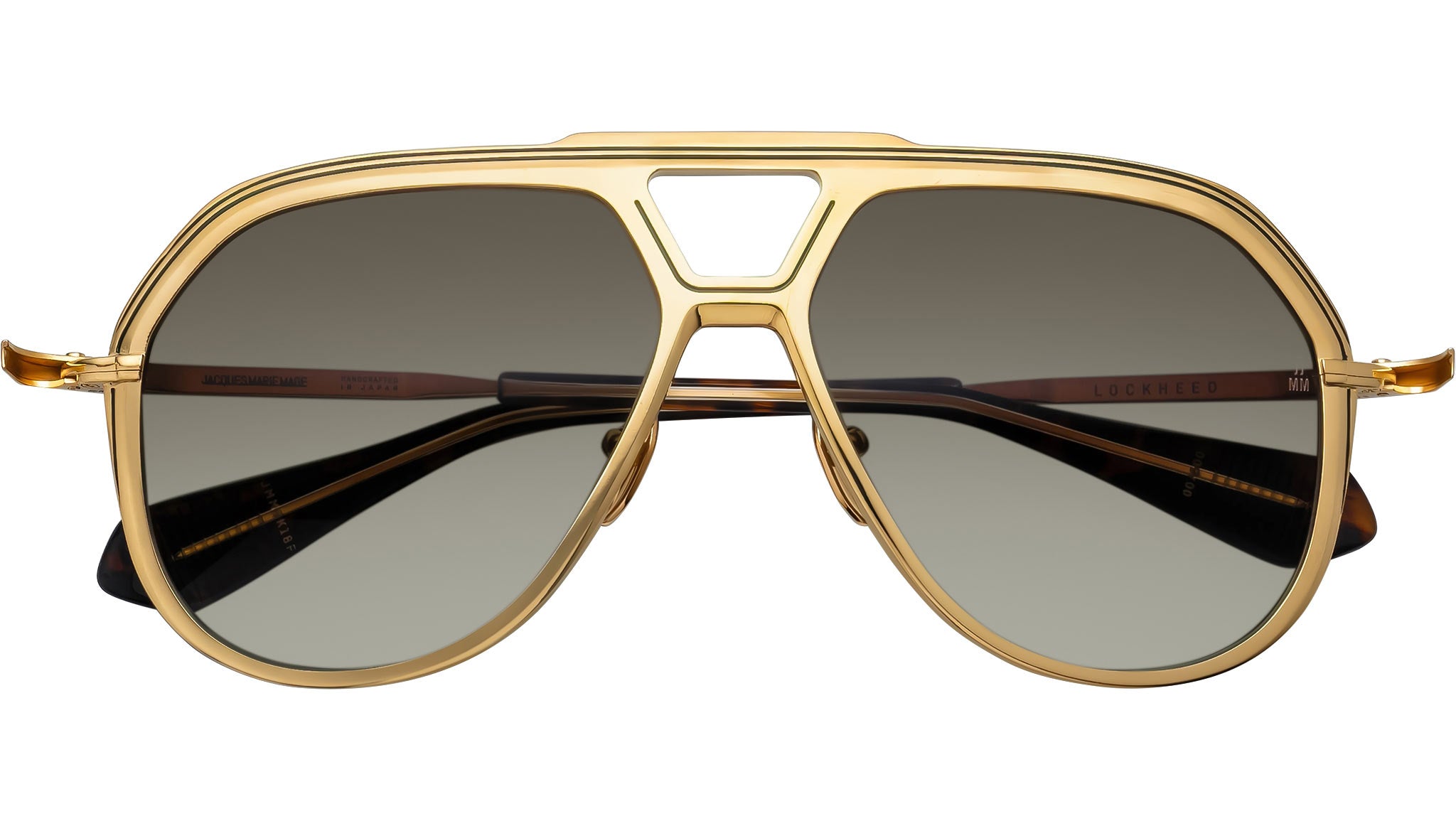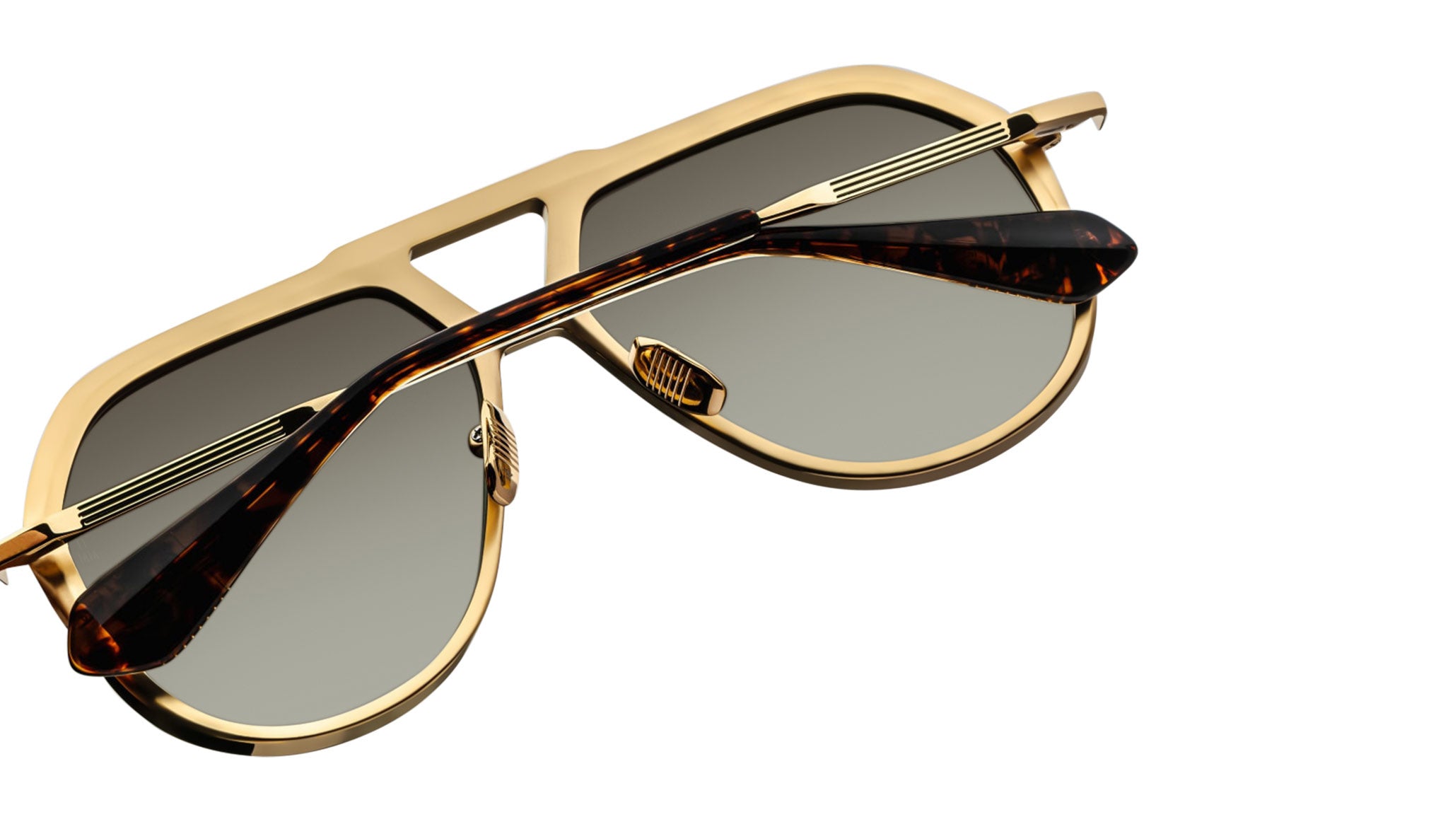 Jacques Marie Mage Lockheed sunglasses are classic, late-‘70s-inspired aviators crafted from titanium, featuring sculptural acetate temple tips. The design is defined by a V-shaped profile, a distinctive double-bridge, and temples with dual-tone embellishments and hairline epoxy details. These limited-edition aviators, handcrafted in Japan using 100% beta titanium, offer a streamlined, refined aesthetic, embodying the pinnacle of executive elegance and timeless sophistication.