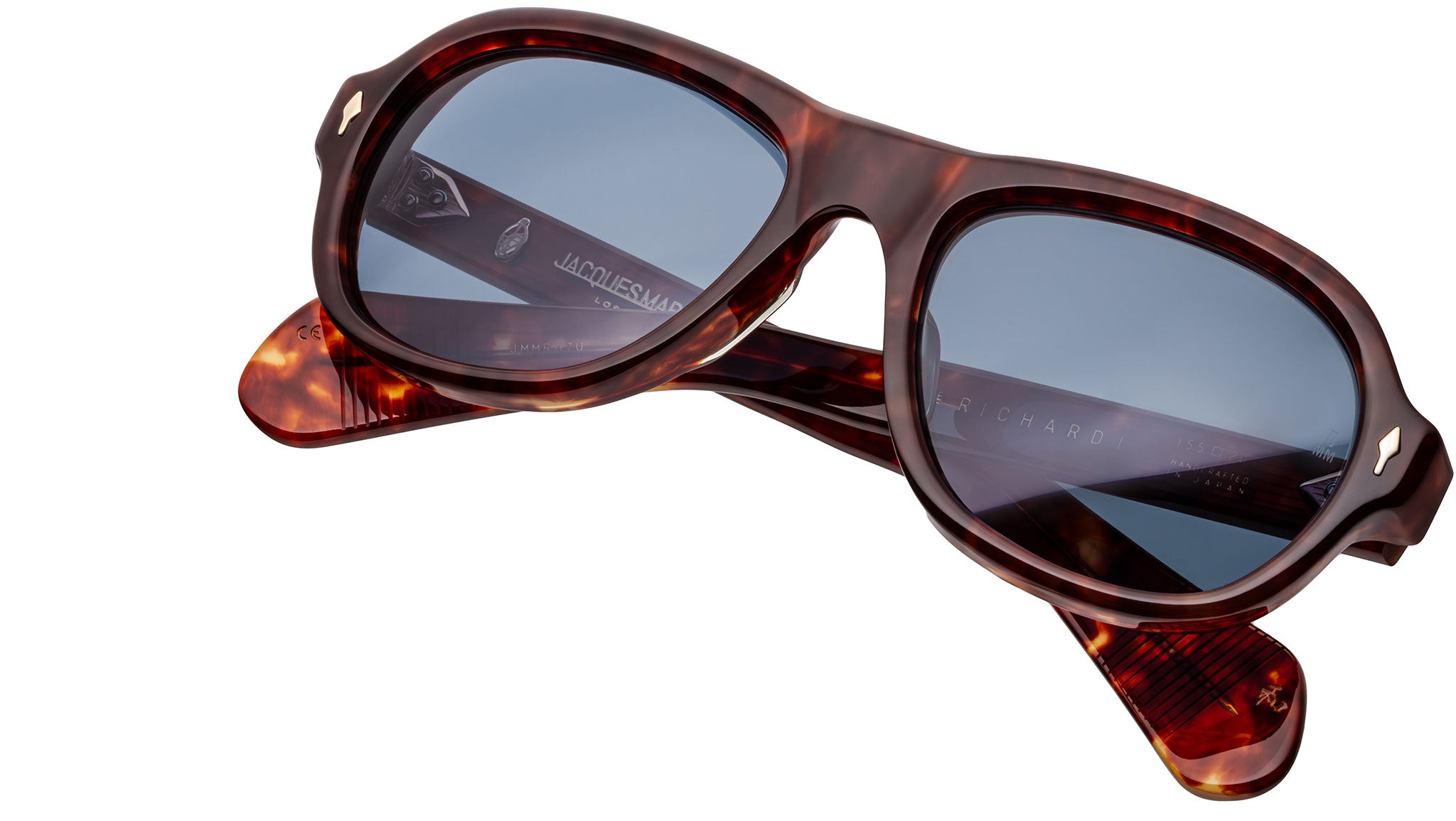 The Jacques Marie Mage Richard sunglasses are mid-sized, handcrafted frames featuring a modern aviator shape, distinguished by signature double-arrowhead front pins and comfortable spatula temples. Inspired by the artistry and resourcefulness of modern fashion photography, these limited-edition spectacles embody self-assured expression and timeless sophistication. Meticulously crafted, the Richard offers a refined balance of bold design and enduring elegance, making a statement that speaks volumes.