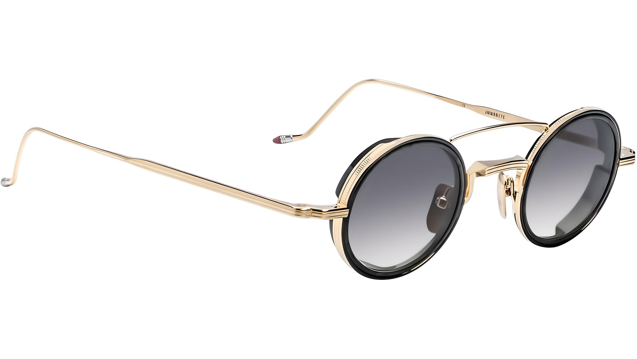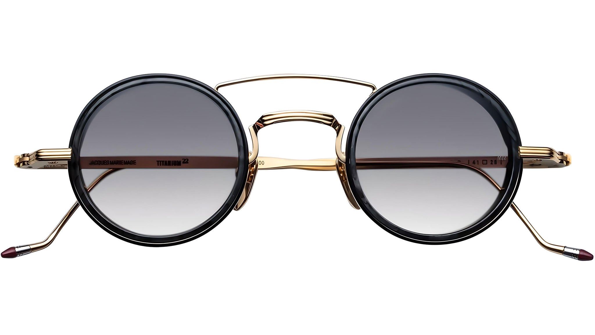 LIMITED PRODUCTION BATCH OF 500 PIECESMoon gold 100% beta titanium frame with black gradient lenses. Features a custom moon gold hairline hinge, burgundy epoxy temple tips, and black burlwood acetate eyerim inserts. Custom nose pads with logo and hairline engravings add a refined touch. Sunrise gradient 2 base lenses with backside anti-reflective treatment ensure clarity and comfort. Frame shape: circular. Provides 100% UV protection.