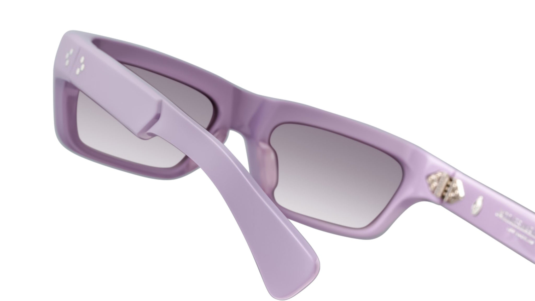 Purple 8mm cured cellulose acetate frame with custom double-laminated acetate temples featuring precious metal hardware and purple lenses. Hidden silver lever wirecore and silver tension-secured custom 7-barrel hairline hinge. Wine gradient CR-39 2 base lenses with backside anti-reflective treatment ensure clarity and comfort. Frame shape: square. Provides 100% UV protection.