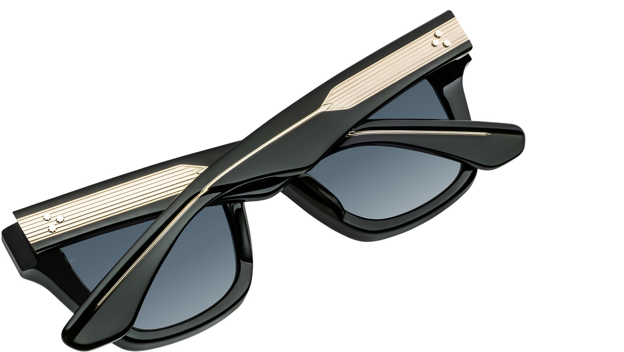 10mm cured cellulose acetate frame in polished green with custom double-laminated temples composed of clear beige exteriors and polished green interiors, complemented by Armorlite 6-base lenses in midnight gradient with backside anti-reflective treatment, Kubrick arrowhead front pins in sterling silver, exposed 'Classic' wirecores plated in silver palladium, custom 9-barrel hinges with refined hairline details plated in silver palladium, spur-shaped rivets plated in silver palladium, inner-temple hallmarks foil-stamped in silver.