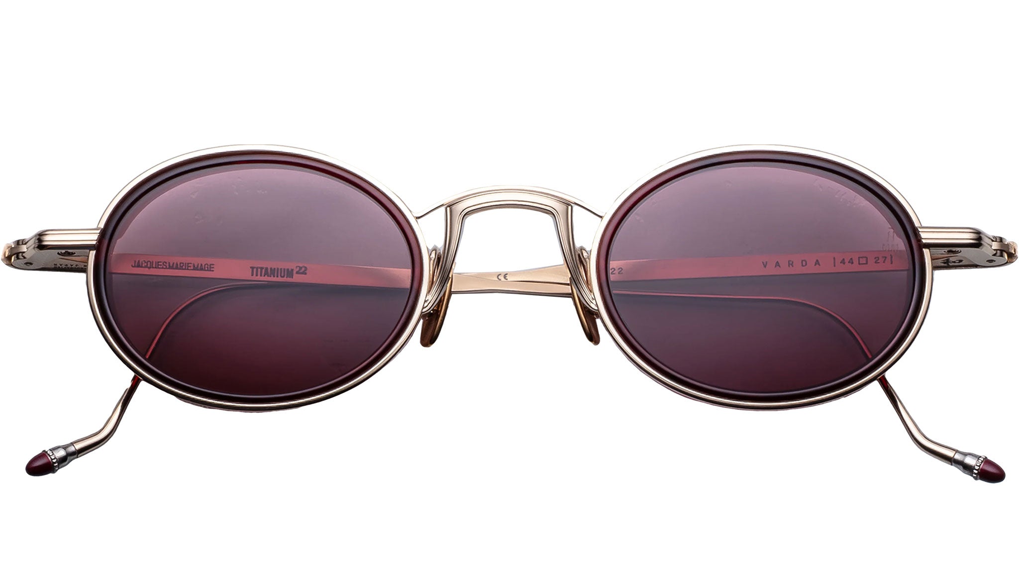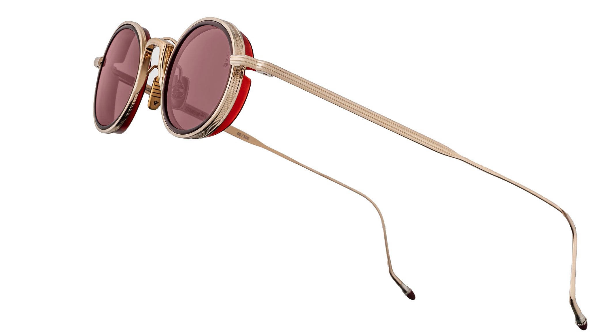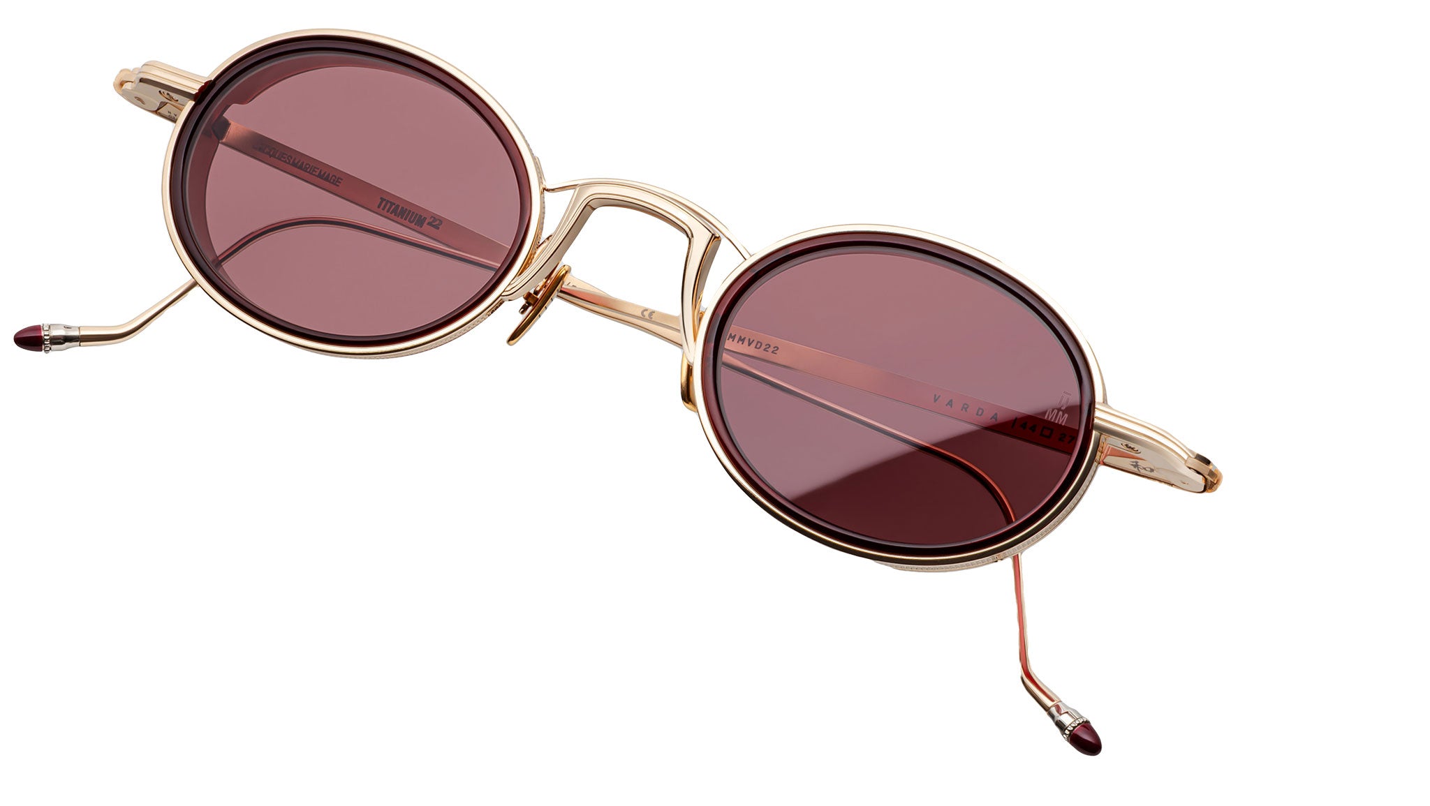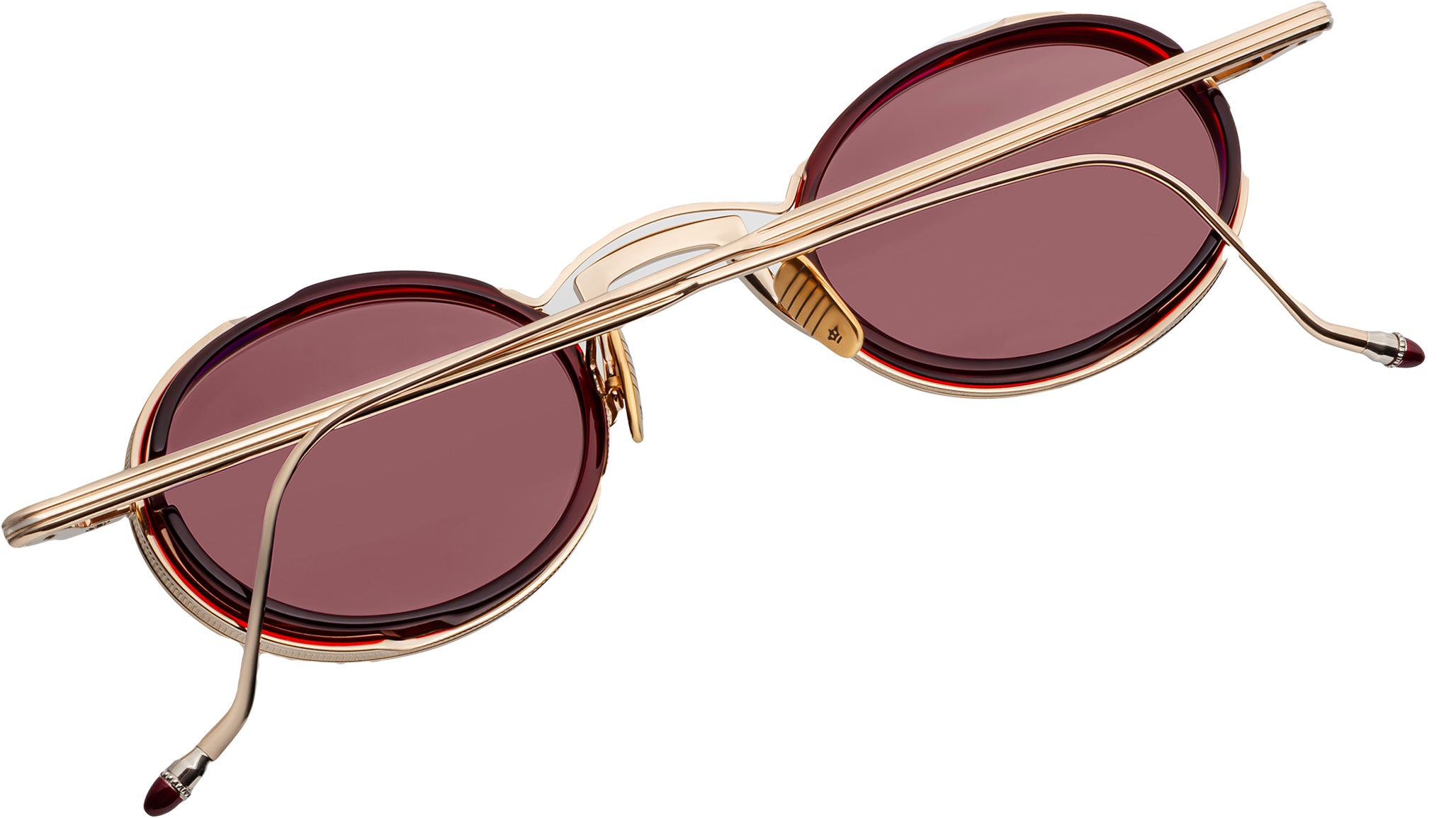 Light gold-finished 100% beta titanium frame with 8mm crystal burgundy cured cellulose acetate eye-rim inserts and mahogany Armorlite 2-base lenses with backside anti-reflective treatment, featuring titanium light gold-finished eye rims with coined edges, temples with Art Deco hairline details and hand-painted epoxy tips in signature Bordeaux Empire color. Completed with custom titanium light gold-finished monoblock hinges, luster gold-finished custom nose pads with logo and hairline engravings.