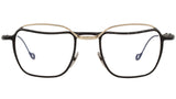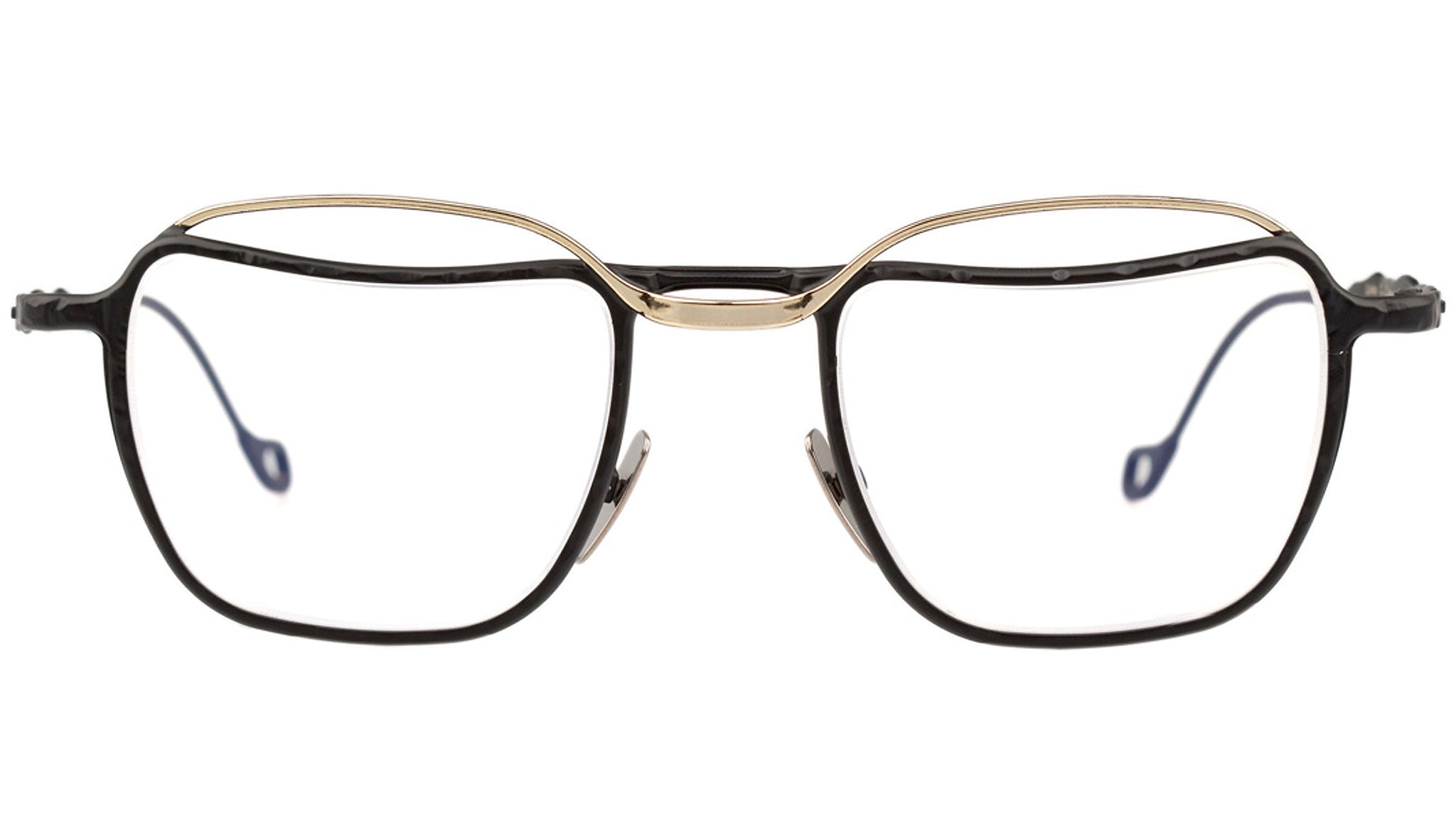 Kuboraum are masks that are designed on the face of its wearers to highlight their personality and character. Mask is synonymous with mockery and game. Kuboraum masks are synonymous with protection and shelter; they are cubical rooms where we shelter ourselves, free to live our intimacy and look at the world through two lenses. All masks are entirely dreamed in Berlin and handmade in Italy. H71 is a square frame shape made with metal 100% made in Italy. Gold and black frame with clear lenses.