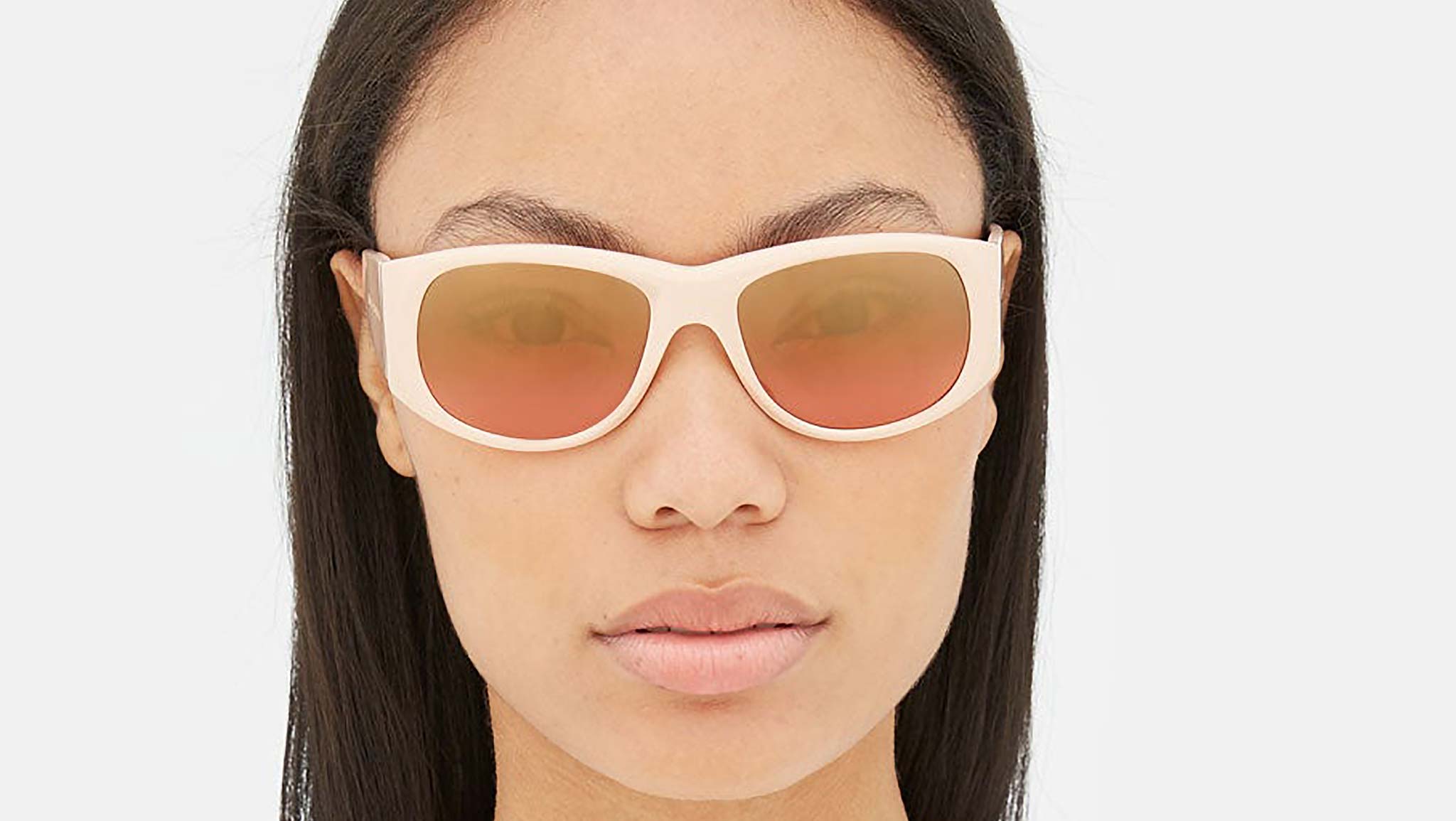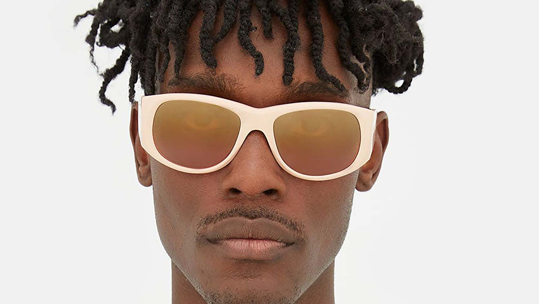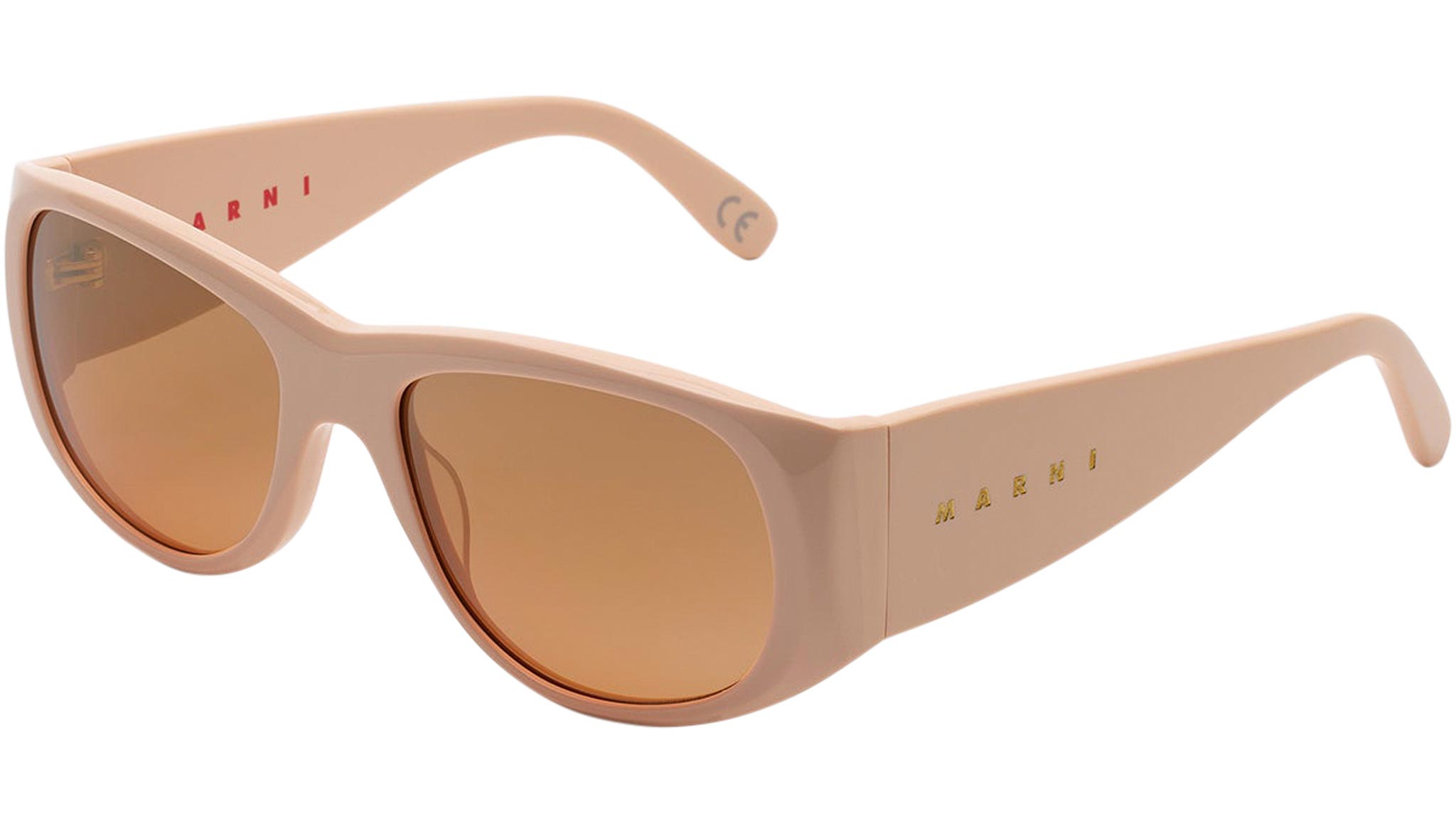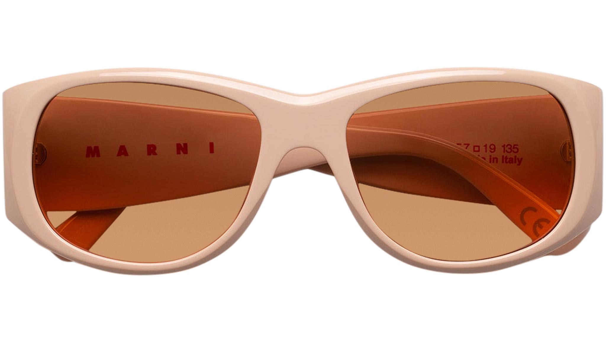 Designed exclusively for Marni, Orinoco River is an oversized shape that re-imagines 1990s grunge aesthetics for a fluid vision of contemporary style. The silhouette features a wide, horizontal geometry characterized by thick temples and broad rounded lenses. The upper line forms a distinctive V-shape, constructing a compact nose-bridge for a perfect fit. This model blends the boundaries between Marni’s eclectic style and an uncompromising modern aesthetics. This version comes with a light peach acetate and orange tinted lenses. Sizes: R Lens Width: 57 mm. Frame Front: Frame Side: 135 mm. Product Code Size R: 0EF