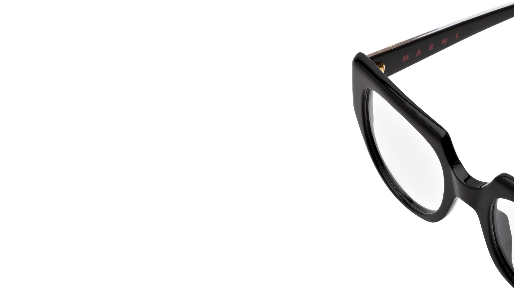 Designed exclusively for Marni, Uluru is a sturdy Optical silhouette characterised by unique geometries and asymmetrical design features. The model blends squared detailing with carefully rounded curves for an innovative aesthetics. Different thicknesses are placed in strategic areas for extra strength, a strong brow-piece is matched by slender rims on the lower part of the frame. This is a sophisticated model that captures Marni’s quirky approach to style. This version is available in shiny black acetate. Sizes: R / R Lens Width: 53 mm. Frame Front: Frame Side: 145 mm. Product Code Size R: 0M5 Product Code Size R: 2XX