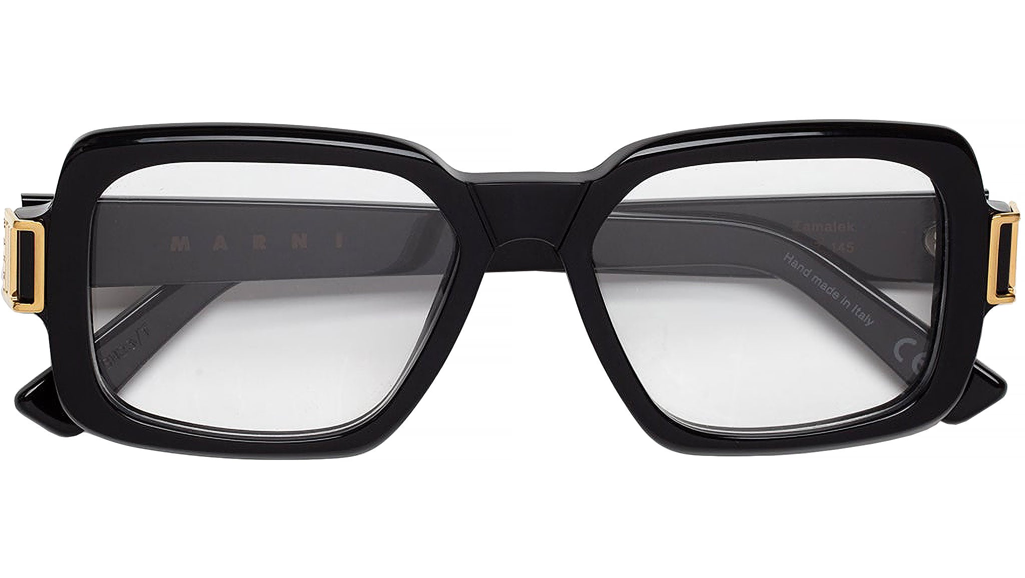 Designed exclusively for Marni, Zamalek is a squared silhouette inspired by the 1970s aesthetics. An optical version of a popular Sun model, this shape features an oversized fit, characteristic low nose-bridge and thick rims that have been chiselled and adapted for everyday use. Zamalek features a unique décor on the temples with the Marni logo and comes in a shiny black acetate. Sizes: R / R Lens Width: 54 mm. Frame Front: Frame Side: 145 mm. Product Code Size R: C7W Product Code Size R: GAW