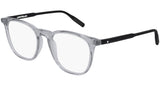 Montblanc Eyewear model MB0010O 009 featuring shiny transparent cool grey frame and black temple. Montblanc revolutionized the culture of writing with breakthrough innovations. Today, the Maison continues to push boundaries and evolve the expression of fine craftsmanship across each of its product categories: the pinnacle of luxury writing instruments, timepieces, leather goods, accessories, fragrances and eyewear.