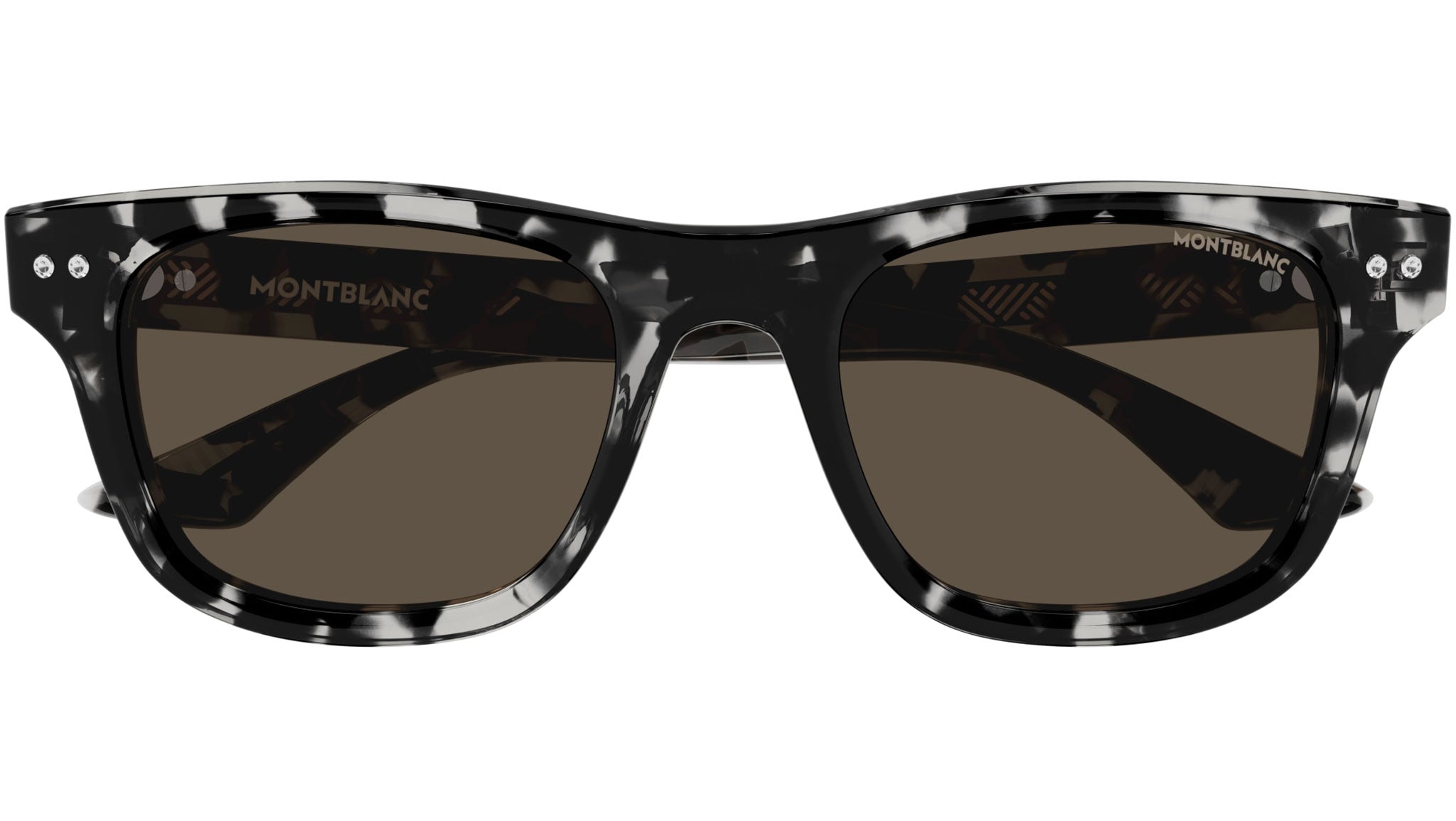 Occhiali da sole Montblanc Snowcap modello MB0254S in acetato riciclato rettangolare, codice colore 008 avana striata nero lucido con aste in nero e lenti color marrone freddo solido. Rivenditore autorizzato Montblanc online. Gli occhiali vengono consegnati con custodia e accessori originali e sono coperti dalla garanzia ufficiale di 12 mesi del produttore.