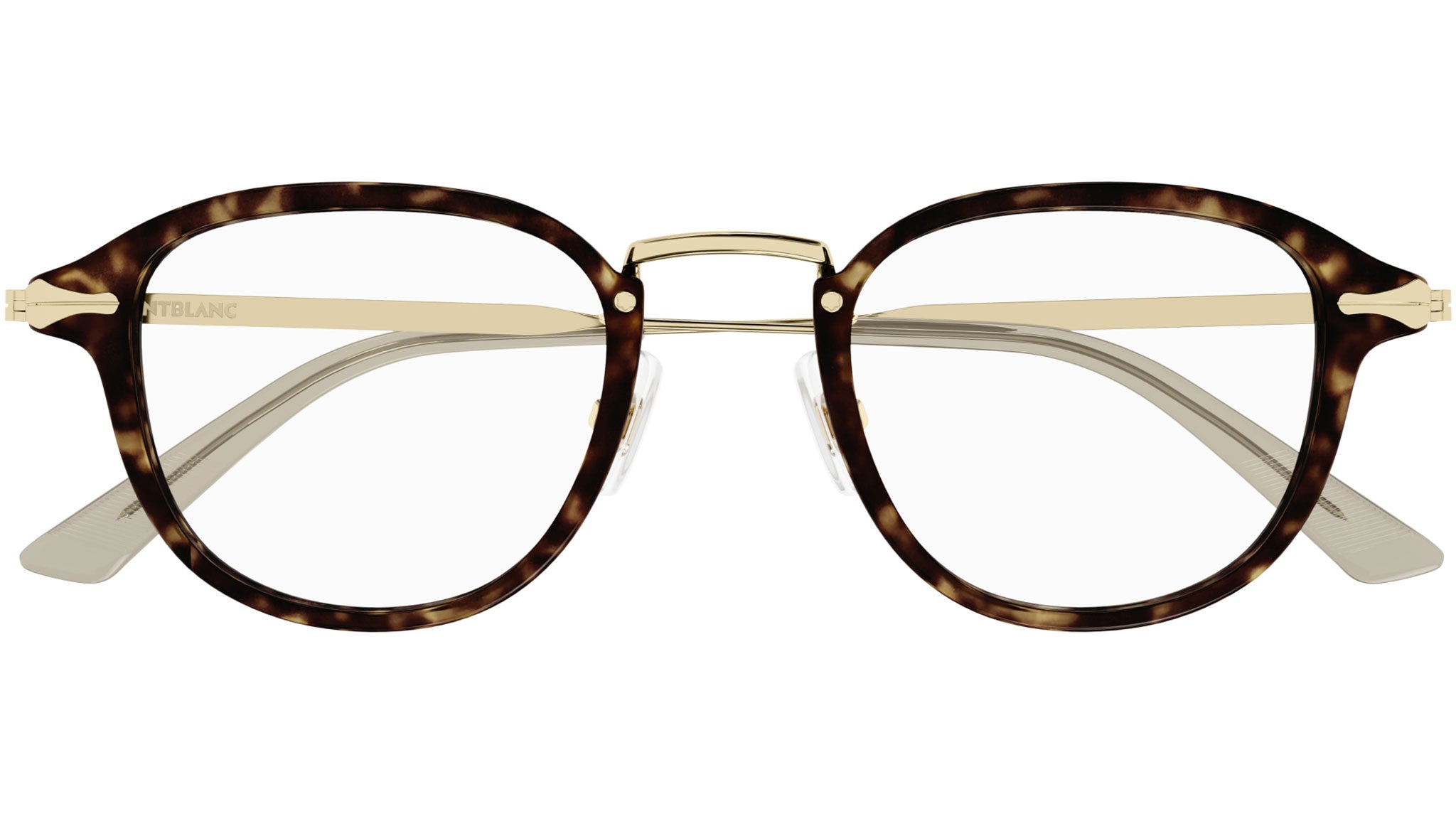 Occhiali da vista Montblanc modello MB0336O linea Nib forma panto in iniettato, colore tartaruga scuro lucido con aste color oro e lenti demo.