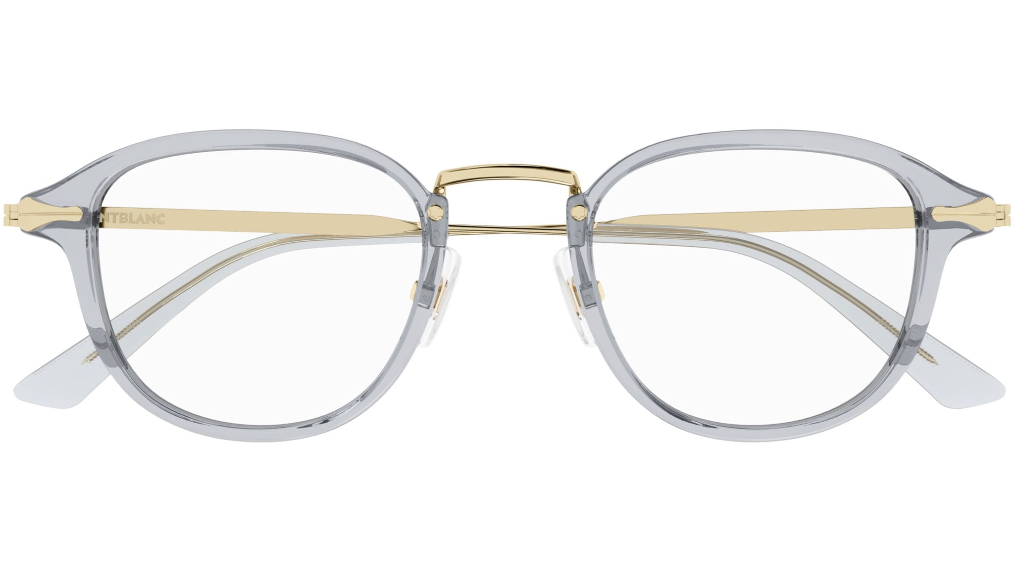 Occhiali da vista Montblanc modello MB0336O linea Nib forma panto in iniettato, colore grigio chiaro trasparente lucido con aste color oro e lenti demo.