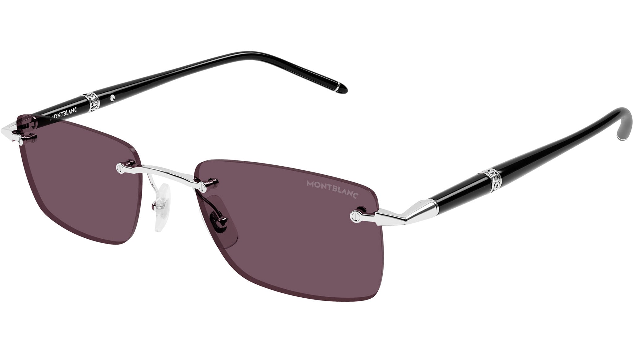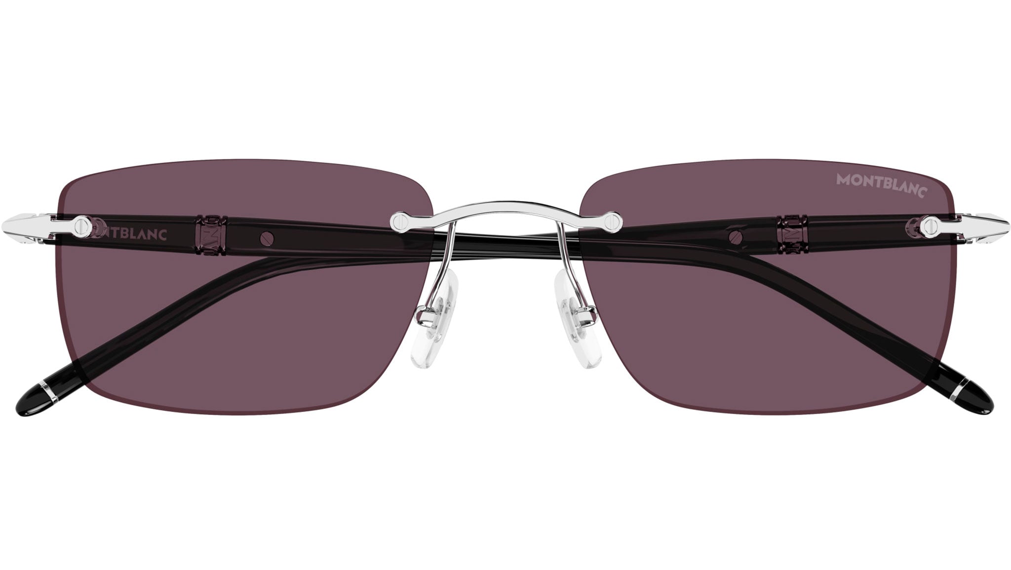 Occhiali da sole Montblanc modello MB0344S linea Meisterstück forma rettangolare in metallo, codice colore 002 argento lucido con aste color nero e lenti color viola scuro solido.