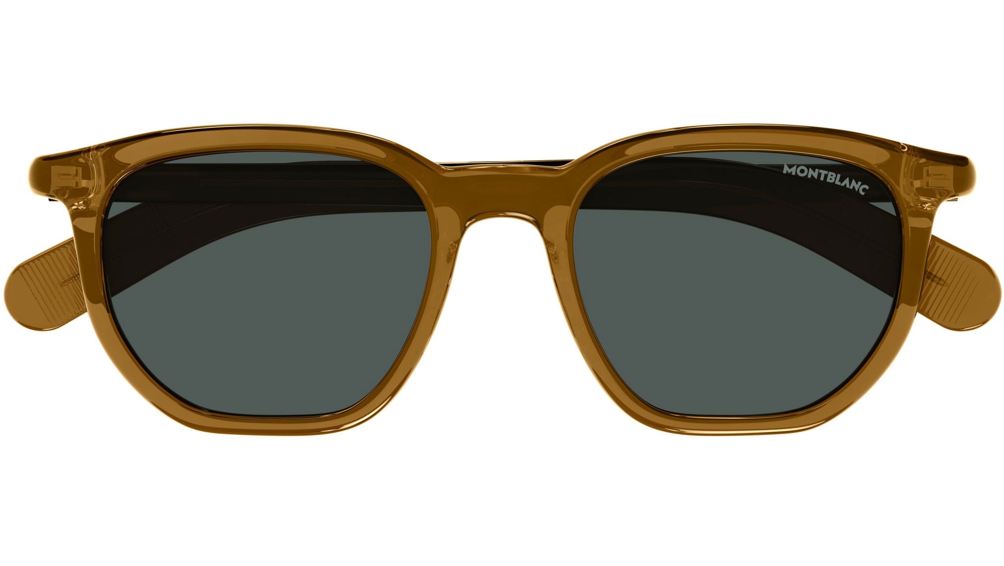Occhiali da sole Montblanc Snowcap modello MB0352S in acetato iniettato riciclato rettangolare, codice colore 002 marrone scuro trasparente lucido con aste in marrone e lenti color verde tinta unita. Rivenditore autorizzato Montblanc online. Gli occhiali vengono consegnati con custodia e accessori originali e sono coperti dalla garanzia ufficiale di 12 mesi del produttore.