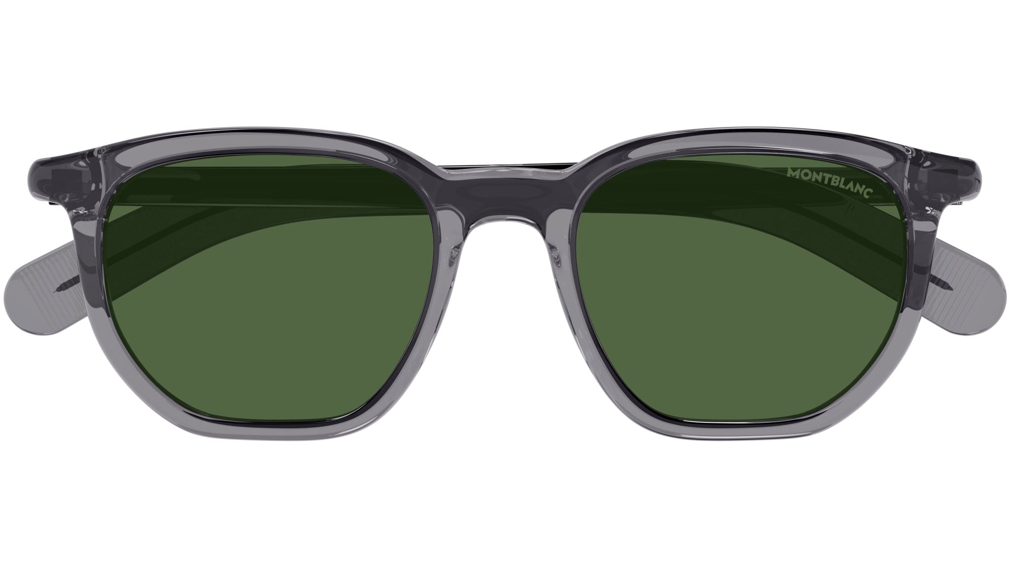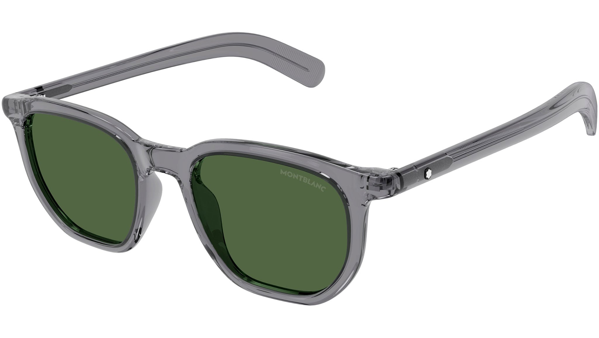 Occhiali da sole Montblanc Snowcap modello MB0352S in acetato iniettato riciclato rettangolare, codice colore 003 grigio trasparente lucido con aste in grigio e lenti color verde solido. Rivenditore autorizzato Montblanc online. Gli occhiali vengono consegnati con custodia e accessori originali e sono coperti dalla garanzia ufficiale di 12 mesi del produttore.