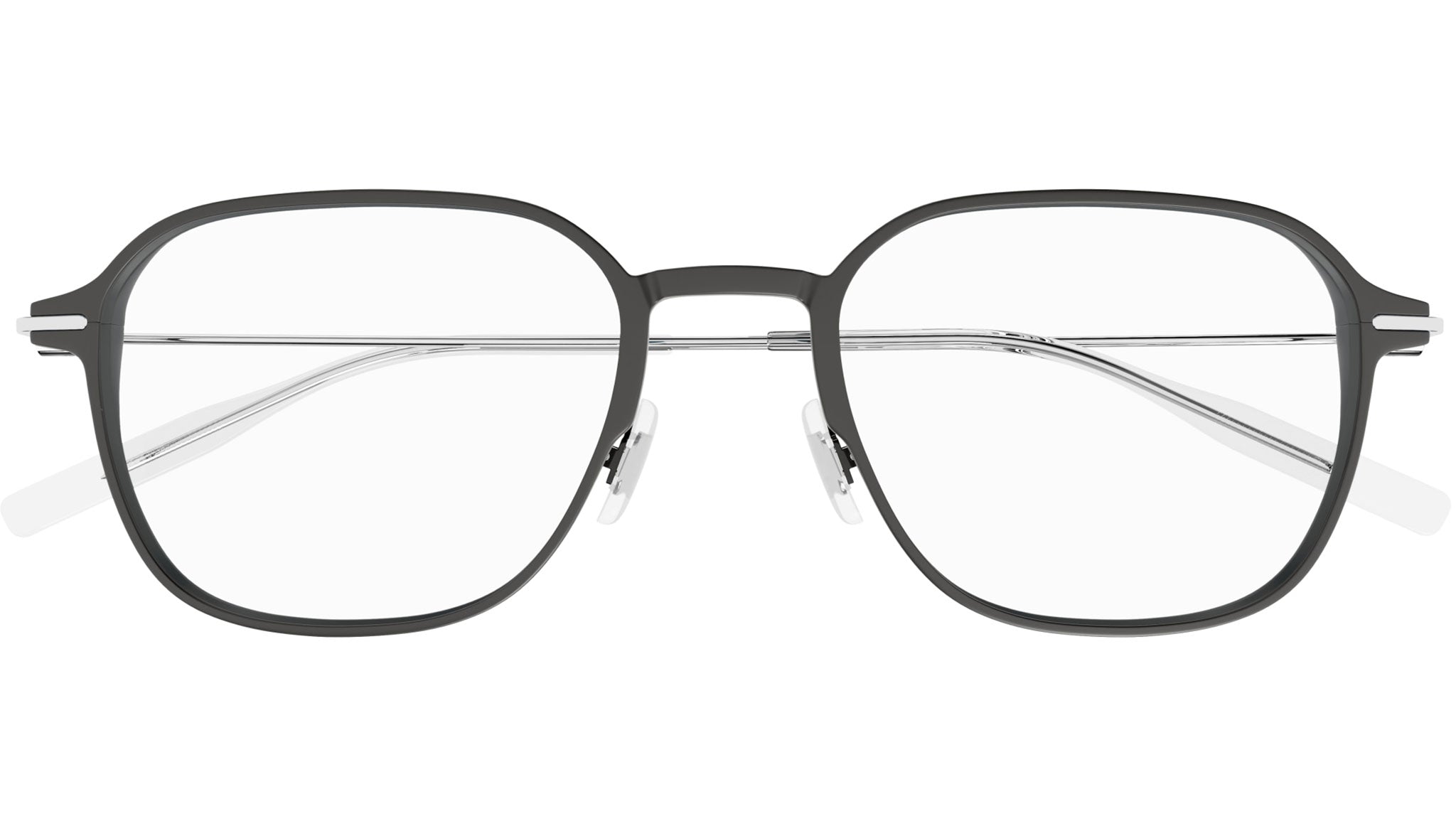 Occhiali da vista Montblanc Snowcap modello MB0358O in alluminio rettangolare grigio scuro semiopaco con aste in argento e lenti demo. Rivenditore autorizzato Montblanc online. Gli occhiali vengono consegnati con custodia e accessori originali e sono coperti dalla garanzia ufficiale di 12 mesi del produttore.