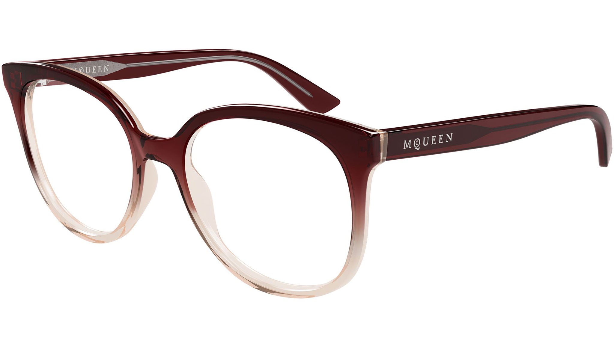 Occhiali da vista Alexander McQueen Logo modello AM0540O in acetato riciclato cat eye codice colore 006 rosso sfumato trasparente con aste rosso e lenti demo. Rivenditore autorizzato Alexander McQueen online. Gli occhiali vengono consegnati con custodia e accessori originali e sono coperti dalla garanzia ufficiale di 12 mesi del produttore.