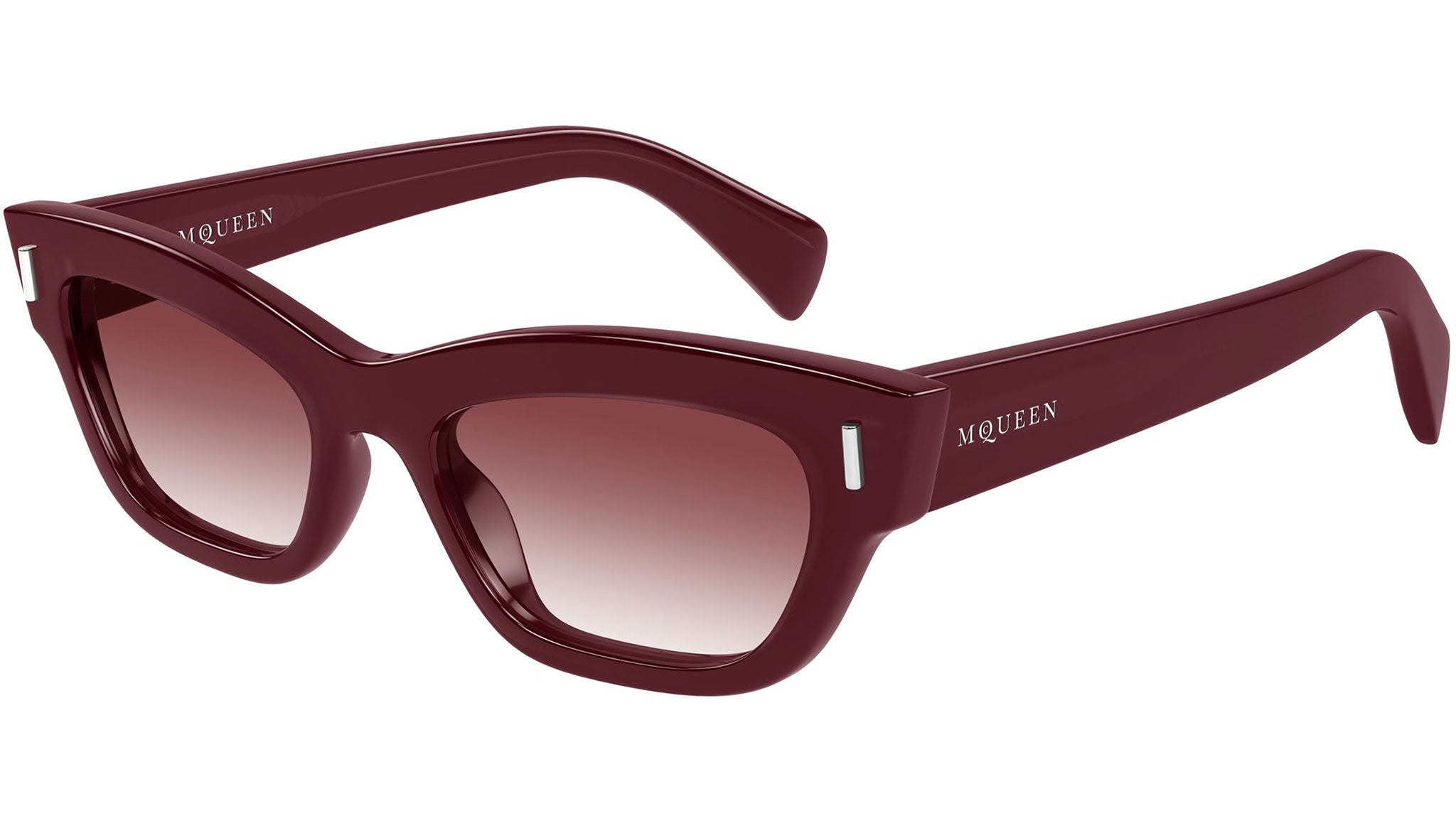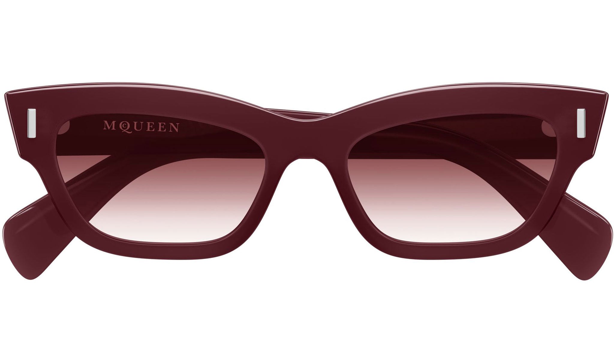 Occhiali da sole Alexander McQueen AM0548S 003 donna con montatura cat eye in acetato riciclato borgogna opalino lucido e lenti borgogna sfumato chiaro. Linea: T-Bar. Codice modello: AM0548S. Codice colore: 003. Made in Italy. Rivenditore autorizzato Alexander McQueen online. Gli occhiali vengono consegnati con custodia e accessori originali e sono coperti dalla garanzia ufficiale di 12 mesi del produttore.