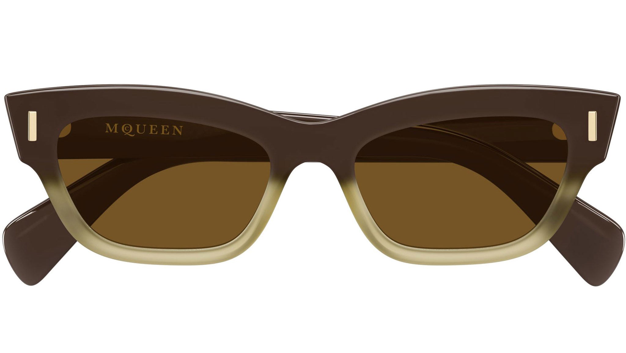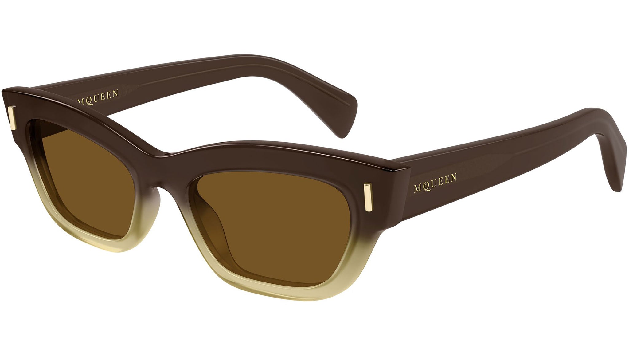 Occhiali da sole Alexander McQueen AM0548S 004 donna con montatura cat eye in acetato riciclato marrone opalino sfumato a miele opalino lucido e lenti marrone tinta unita. Linea: T-Bar. Codice modello: AM0548S. Codice colore: 004. Made in Italy. Rivenditore autorizzato Alexander McQueen online. Gli occhiali vengono consegnati con custodia e accessori originali e sono coperti dalla garanzia ufficiale di 12 mesi del produttore.