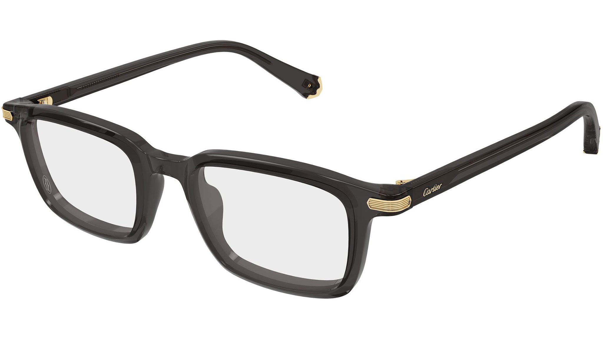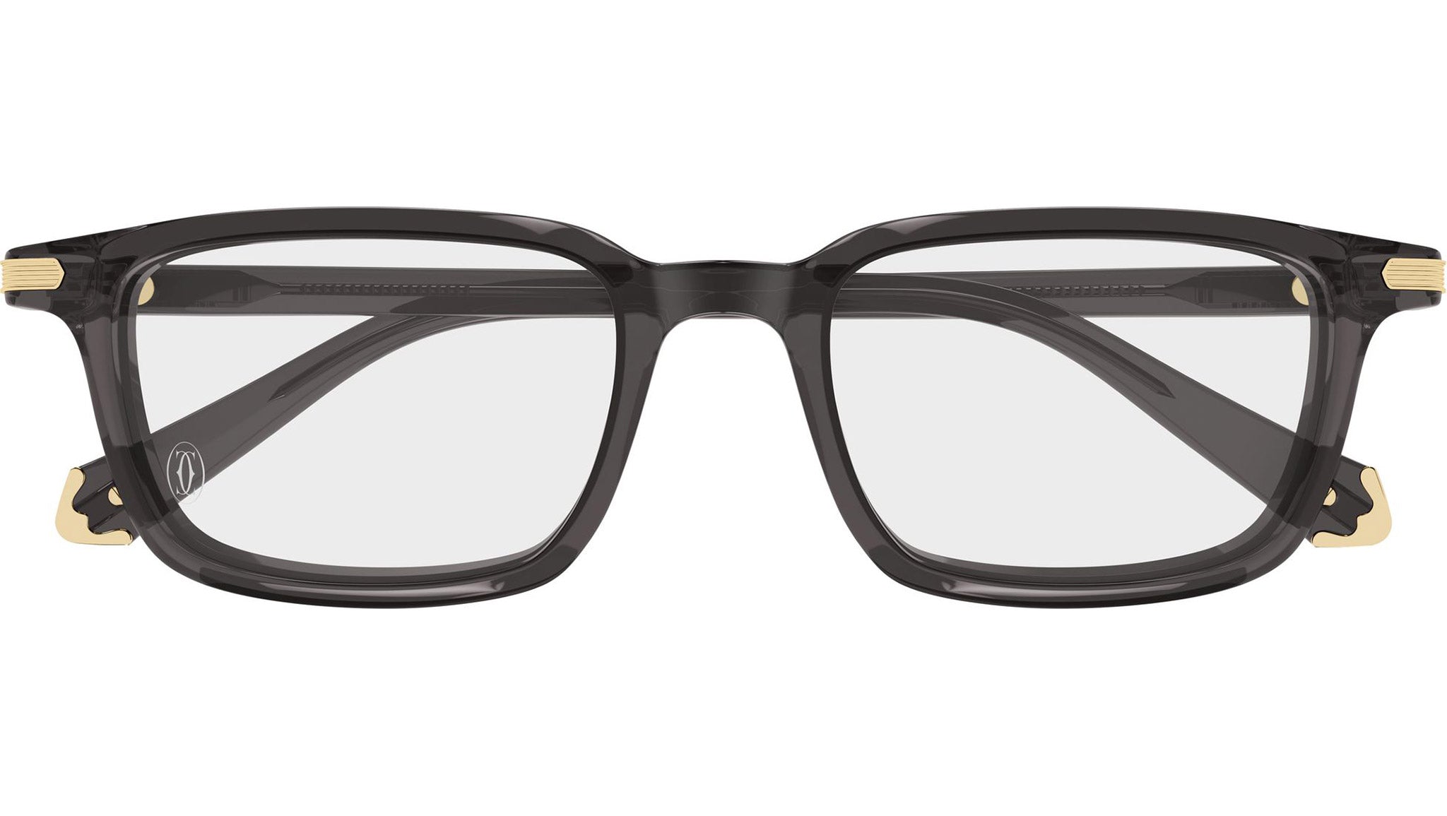 Occhiali da vista Cartier CT0586O uomo con montatura rettangolare in acetato riciclato grigio scuro trasparente e lenti demo. Linea: Contemporary. Codice modello: CT0586O. Codice colore calibro 53: 008. Calibro 56: 001. Made in Italy. Rivenditore autorizzato Cartier online. Gli occhiali vengono consegnati con custodia e accessori originali e sono coperti dalla garanzia ufficiale di 12 mesi del produttore.