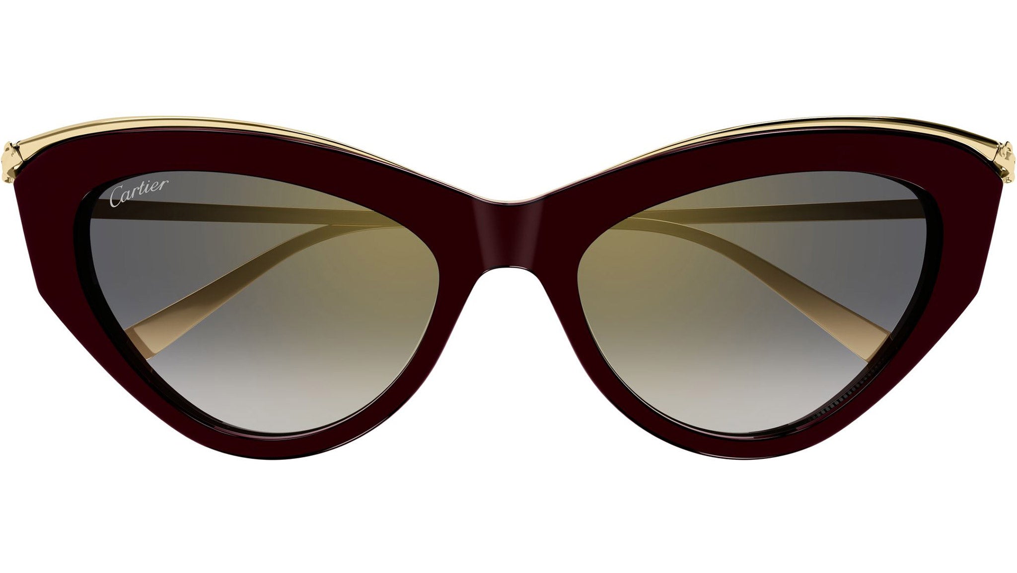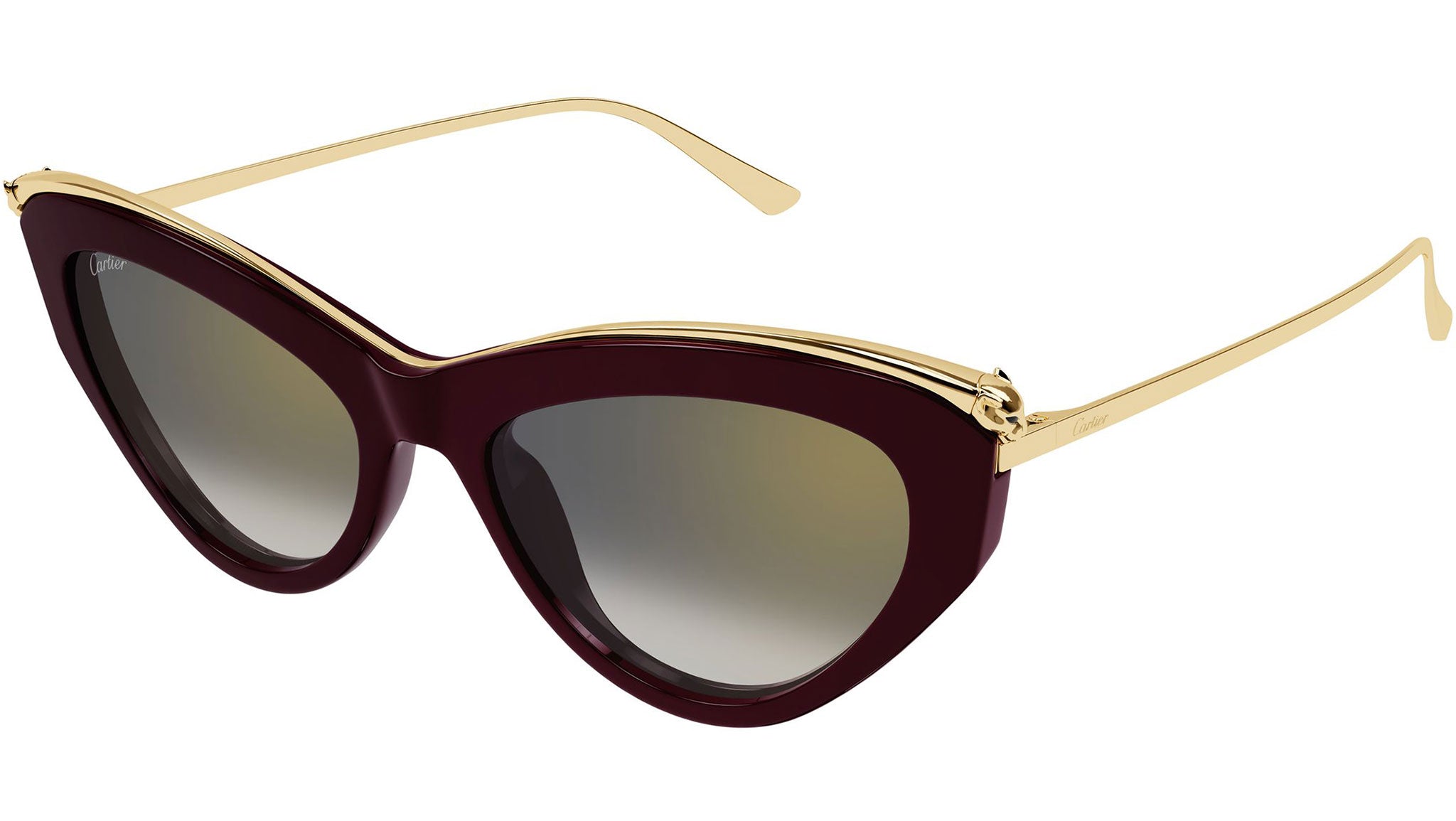 Occhiali da sole Cartier CT0596S 004 donna con montatura cat eye in acetato riciclato color bordeaux e lenti grigio sfumato con flash dorato. Linea: Core Range. Codice modello: CT0596S. Codice colore: 004. Made in Italy. Rivenditore autorizzato Cartier online. Gli occhiali vengono consegnati con custodia e accessori originali e sono coperti dalla garanzia ufficiale di 12 mesi del produttore.