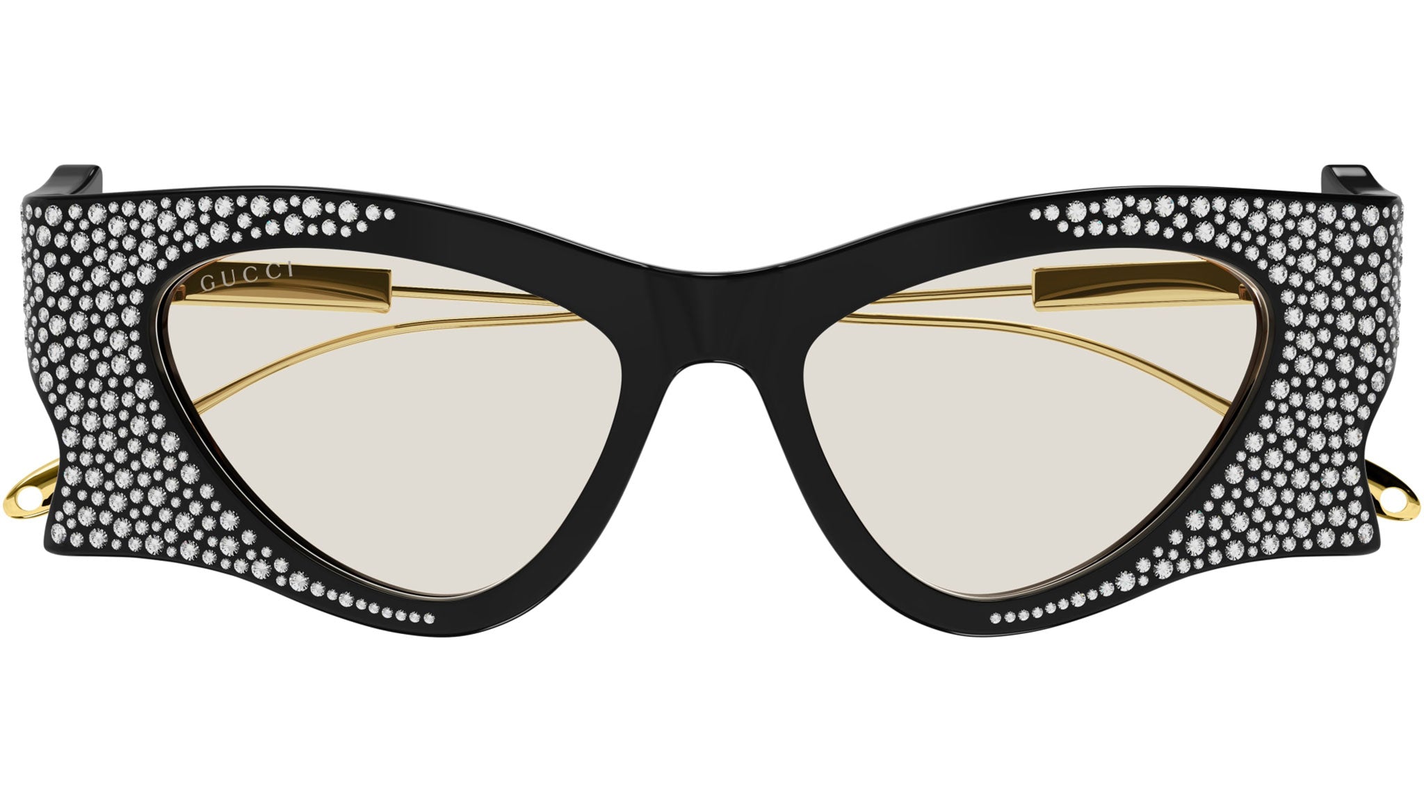 Occhiali da sole Gucci linea Seasonal Icon modello GG1328S variante colore 004 nero tinta unita e strass con lenti color oro.