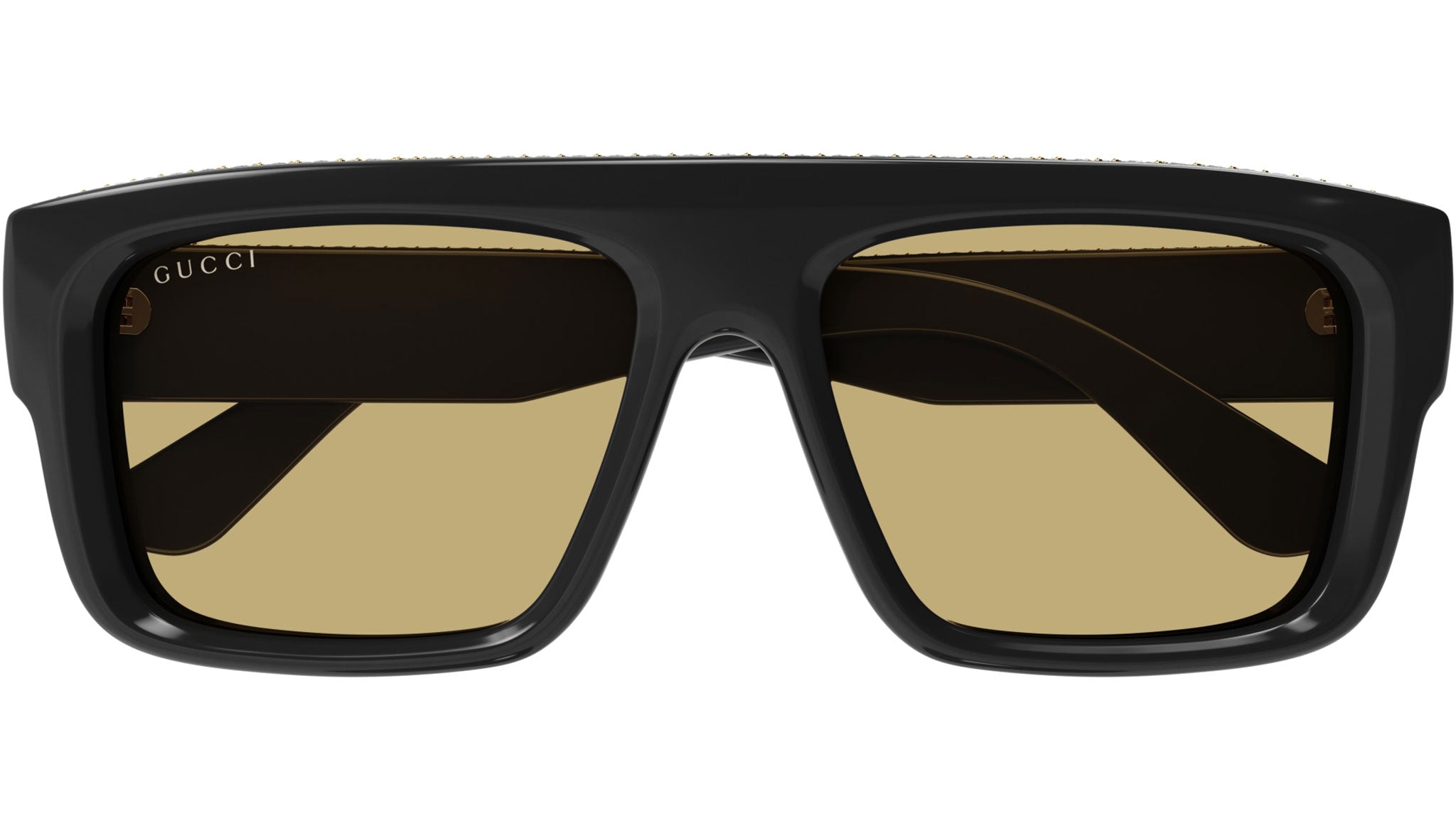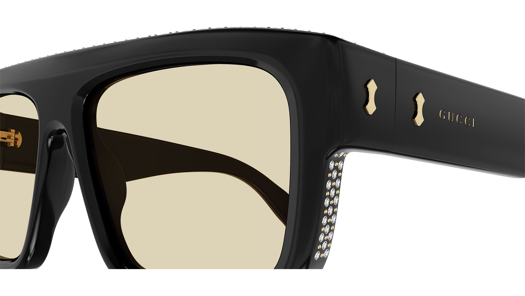 Occhiali da sole Gucci linea Rivets modello GG1461S 004 in acetato riciclato nero lucido con strass con aste color nero e lenti beige nicotine tinta unita.