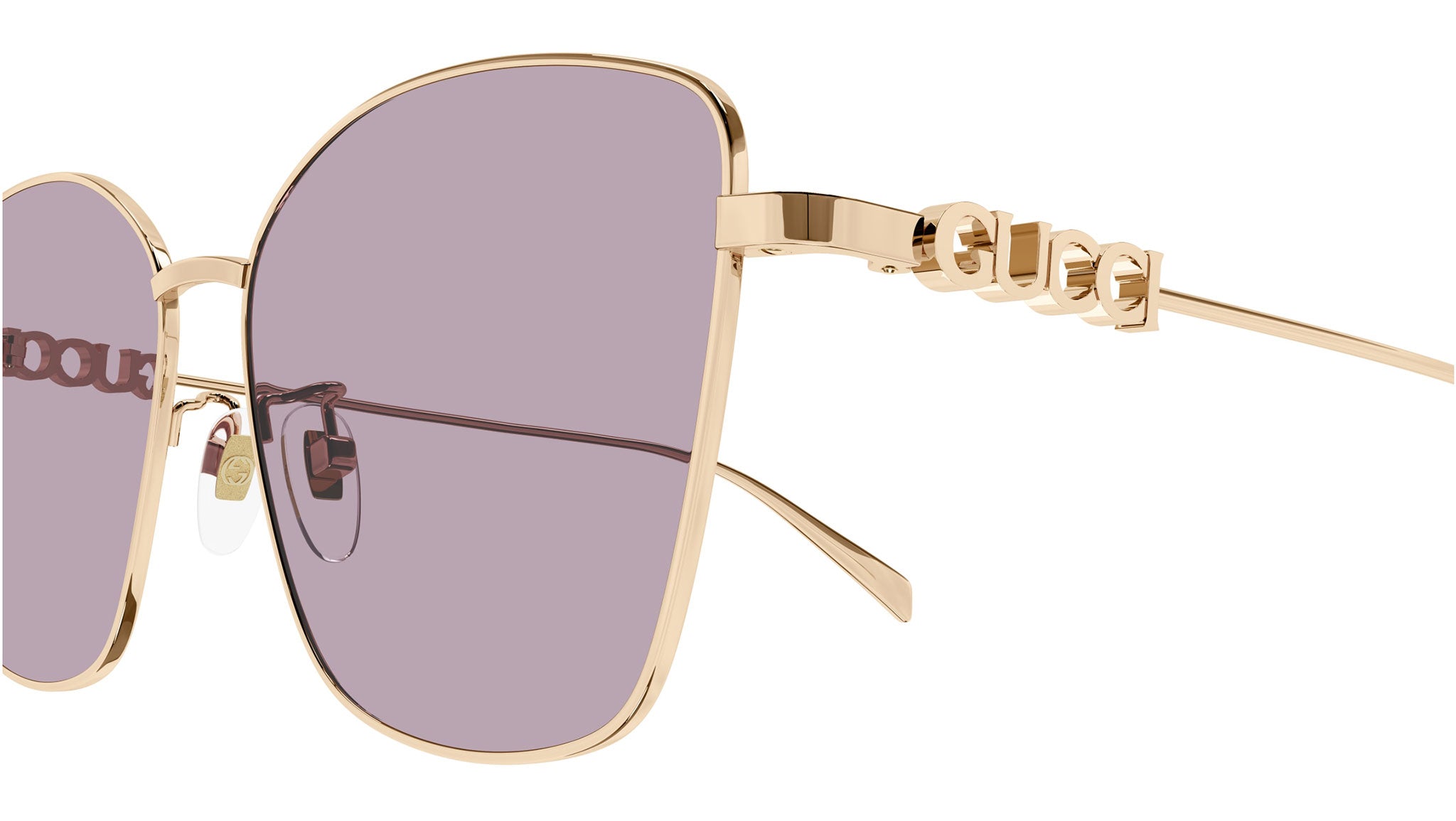 Occhiali da sole Gucci GG1805SA 003 donna con montatura butterfly in metallo oro rosa e lenti viola tinta unita. Linea: Lettering. Codice modello: GG1805SA. Codice colore: 003. Made in Japan. Rivenditore autorizzato Gucci online. Gli occhiali vengono consegnati con custodia e accessori originali e sono coperti dalla garanzia ufficiale di 12 mesi del produttore.