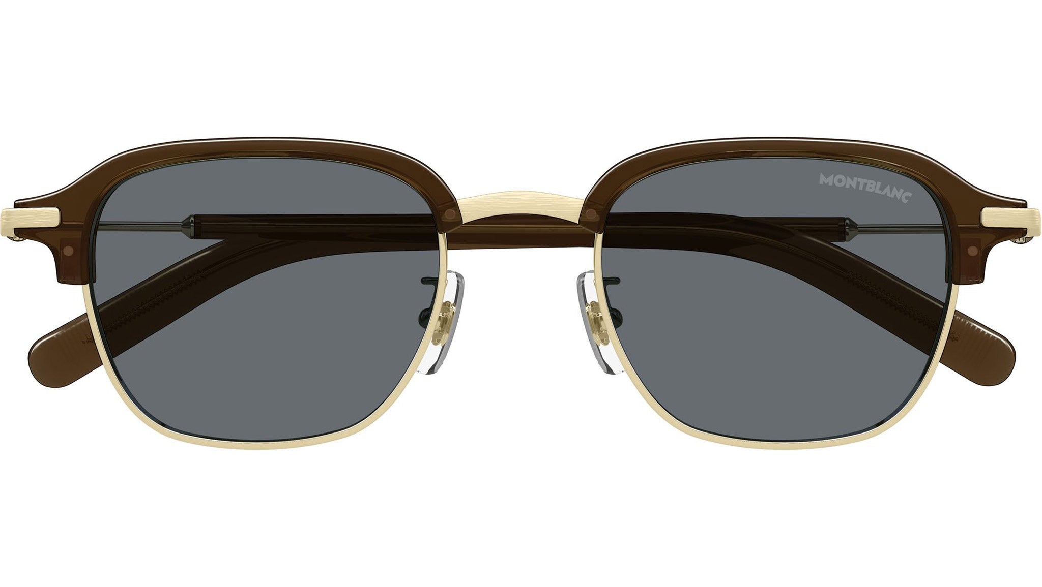 Occhiali da sole Montblanc MB0390S 005 uomo con montatura rettangolare in metallo oro chiaro lucido / cigliare marrone ruggine trasparente lucido e lenti grigio tinta unita. Linea: Snowcap. Codice modello: MB0390S. Codice colore: 005. Made in Japan. Rivenditore autorizzato Montblanc online. Gli occhiali vengono consegnati con custodia e accessori originali e sono coperti dalla garanzia ufficiale di 12 mesi del produttore.