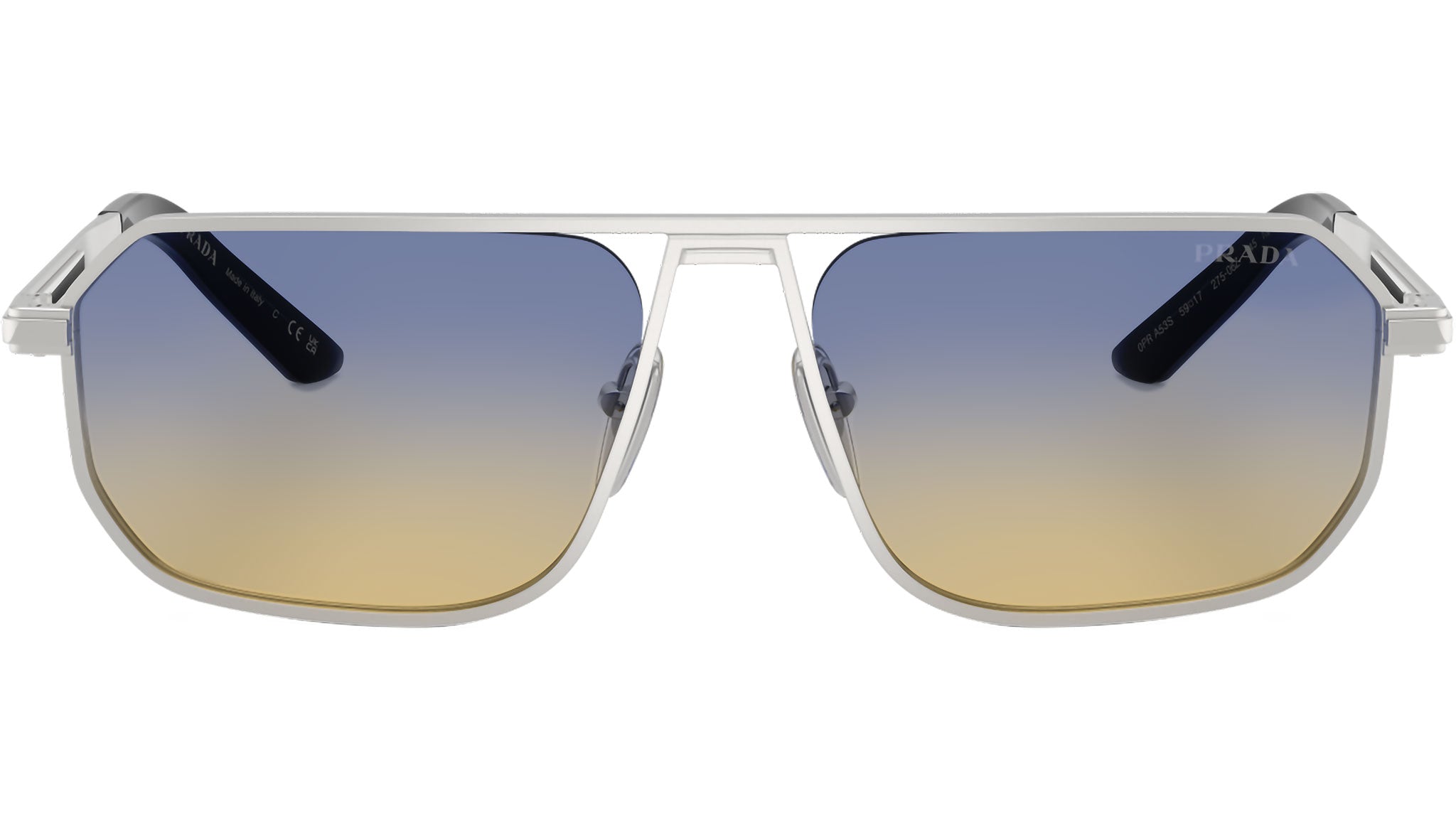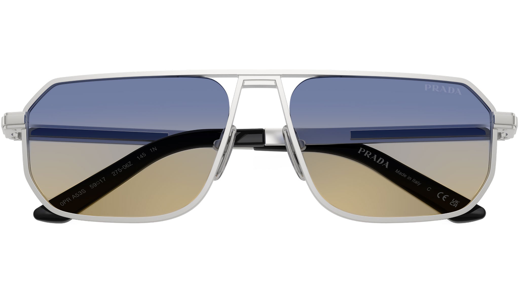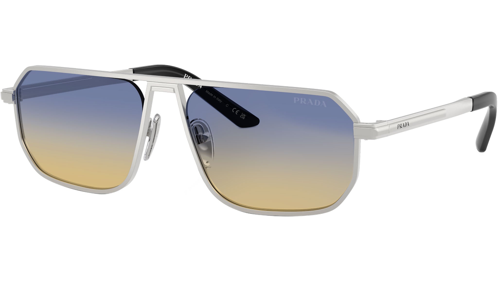 Occhiali da sole Prada PR A53S 27506Z uomo con montatura d-frame in acciaio argento opaco e lenti in bio poliammide color giallo / blu scuro. Naselli regolabili. Linea: Signature. Codice modello: PRA53S. Codice colore: 27506Z. Made in Italy. Rivenditore autorizzato Prada online. Gli occhiali vengono consegnati con custodia e accessori originali e sono coperti dalla garanzia ufficiale di 12 mesi del produttore.