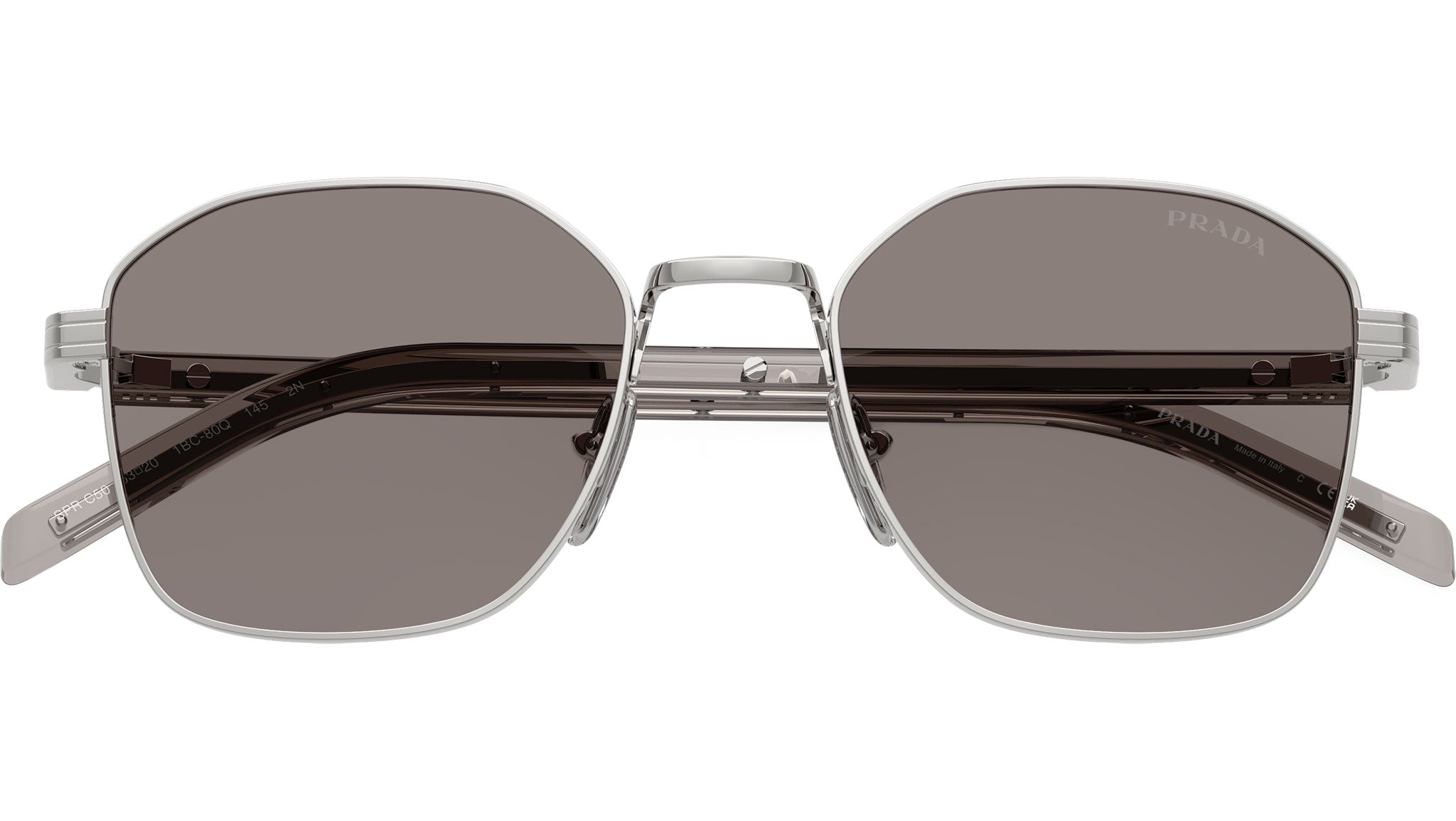 Occhiali da sole Prada PR C50S 1BC80Q uomo con montatura squadrata in acciaio argento e lenti in bio poliammide color grigio scuro. Naselli regolabili. Linea: Heritage. Codice modello: PRC50S. Codice colore: 1BC80Q. Made in Italy. Rivenditore autorizzato Prada online. Gli occhiali vengono consegnati con custodia e accessori originali e sono coperti dalla garanzia ufficiale di 12 mesi del produttore.