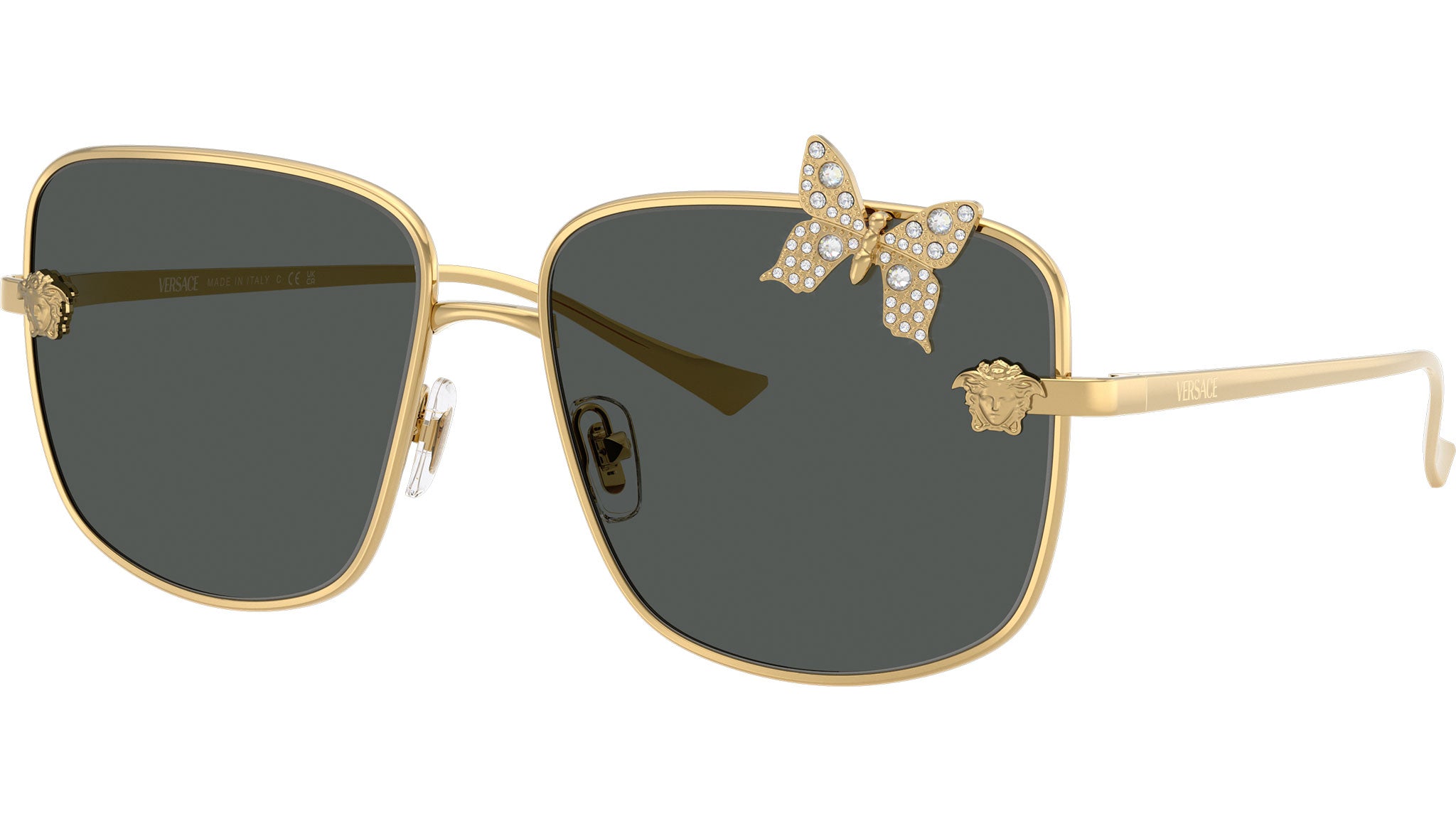 Occhiali da sole Versace donna modello VE2282 100287 con montatura squadrata in metallo oro e lenti base 4 in bio poliammide grigio scuro. Naselli regolabili. Linea: Fashion ID. Codice Brand: 0VE2282. Codice colore: 100287. Rivenditore autorizzato online Versace Eyewear. Ogni prodotto Versace viene consegnato con astuccio originale e accessori ed è coperto da garanzia del produttore di 12 mesi.