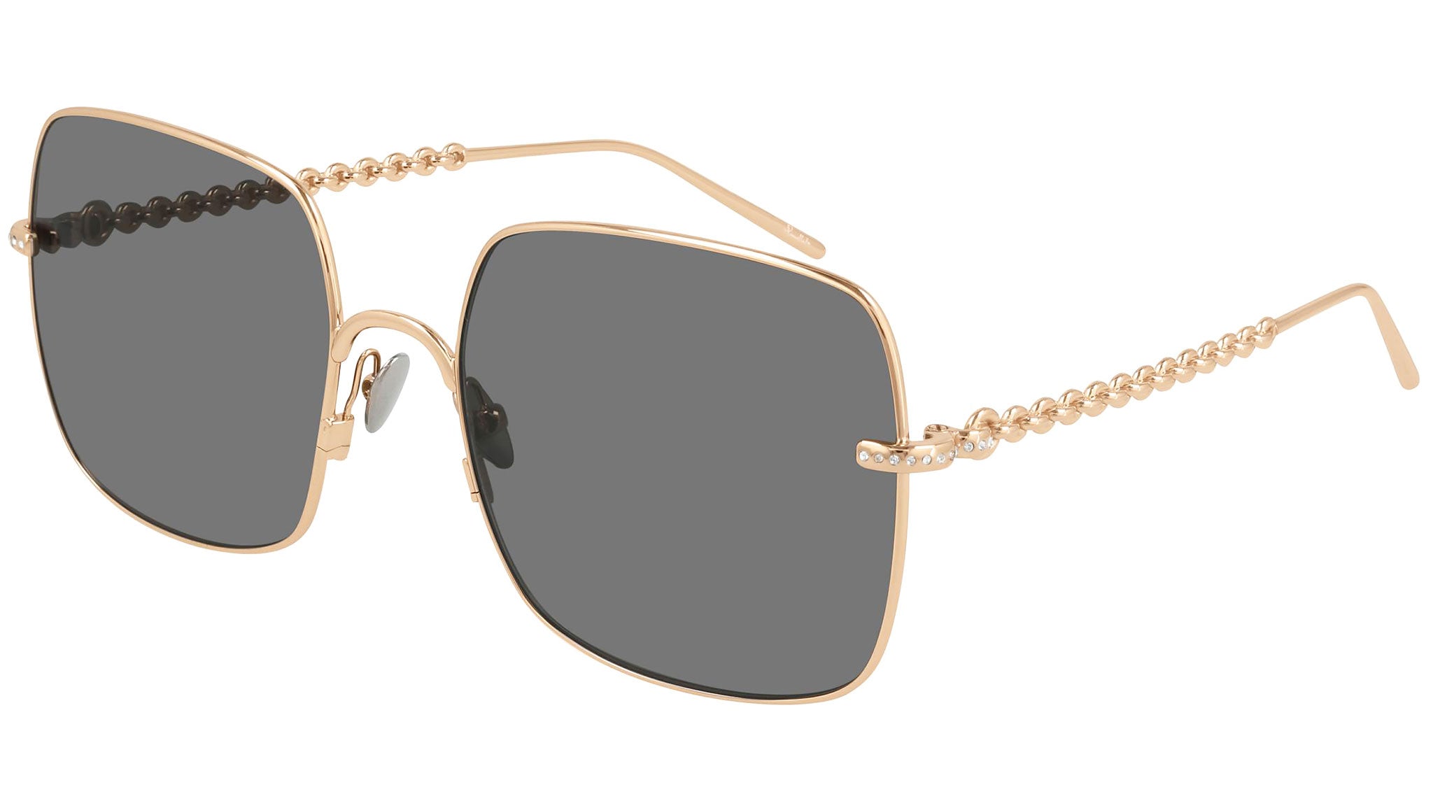Occhiali da sole Pomellato modello PM0102S 001, variante colore oro rosa lucido Pomellato con lenti color grigio tinta unita. La collezione sole Pomellato riflette l'estetica iconcica, piena di colore e non convenzionale della Maison, reinterpretando le linee voluttuose e i dettagli preziosi in una invidiabile selezione di forme, in equilibrio impeccabile tra precisione arigianale e eleganza senza tempo.