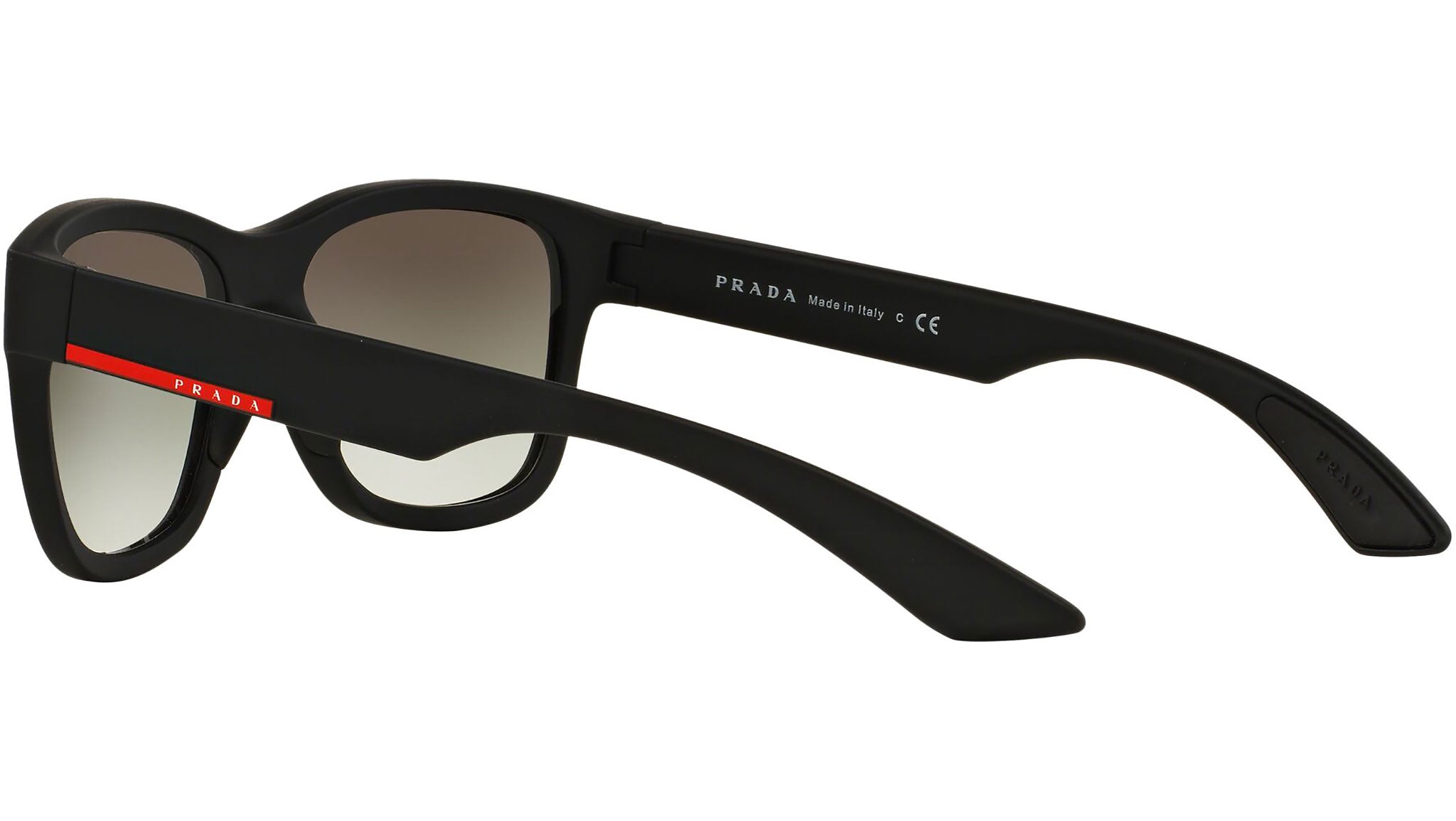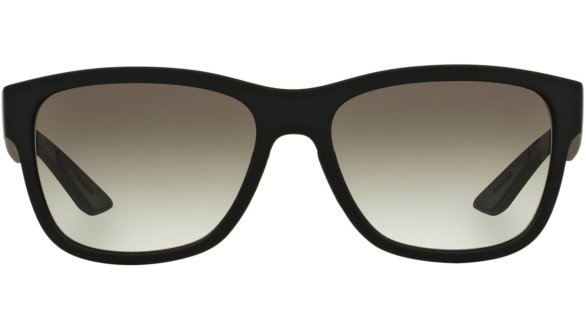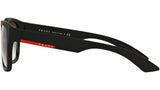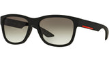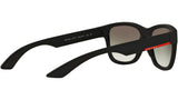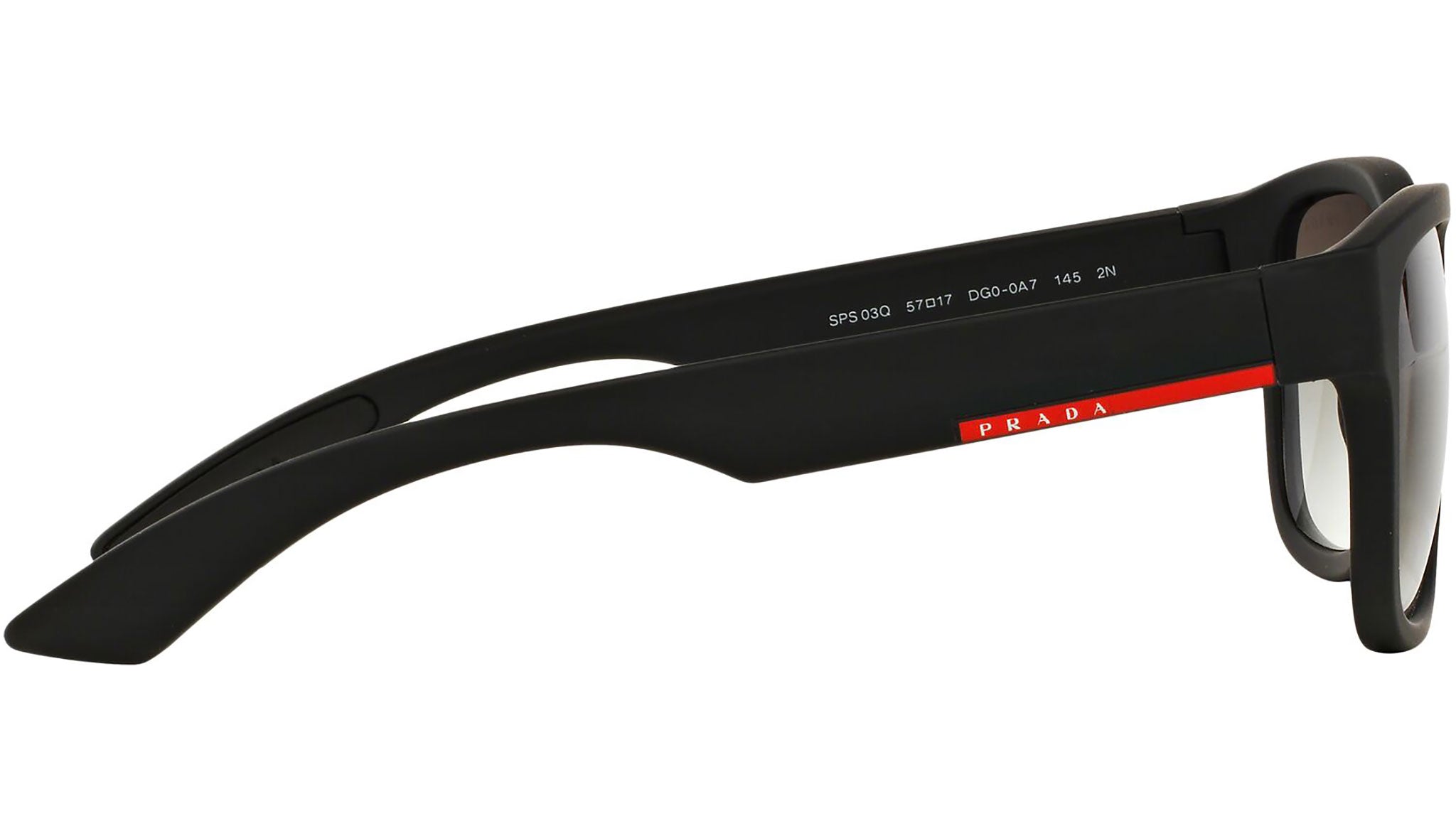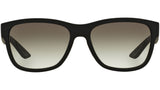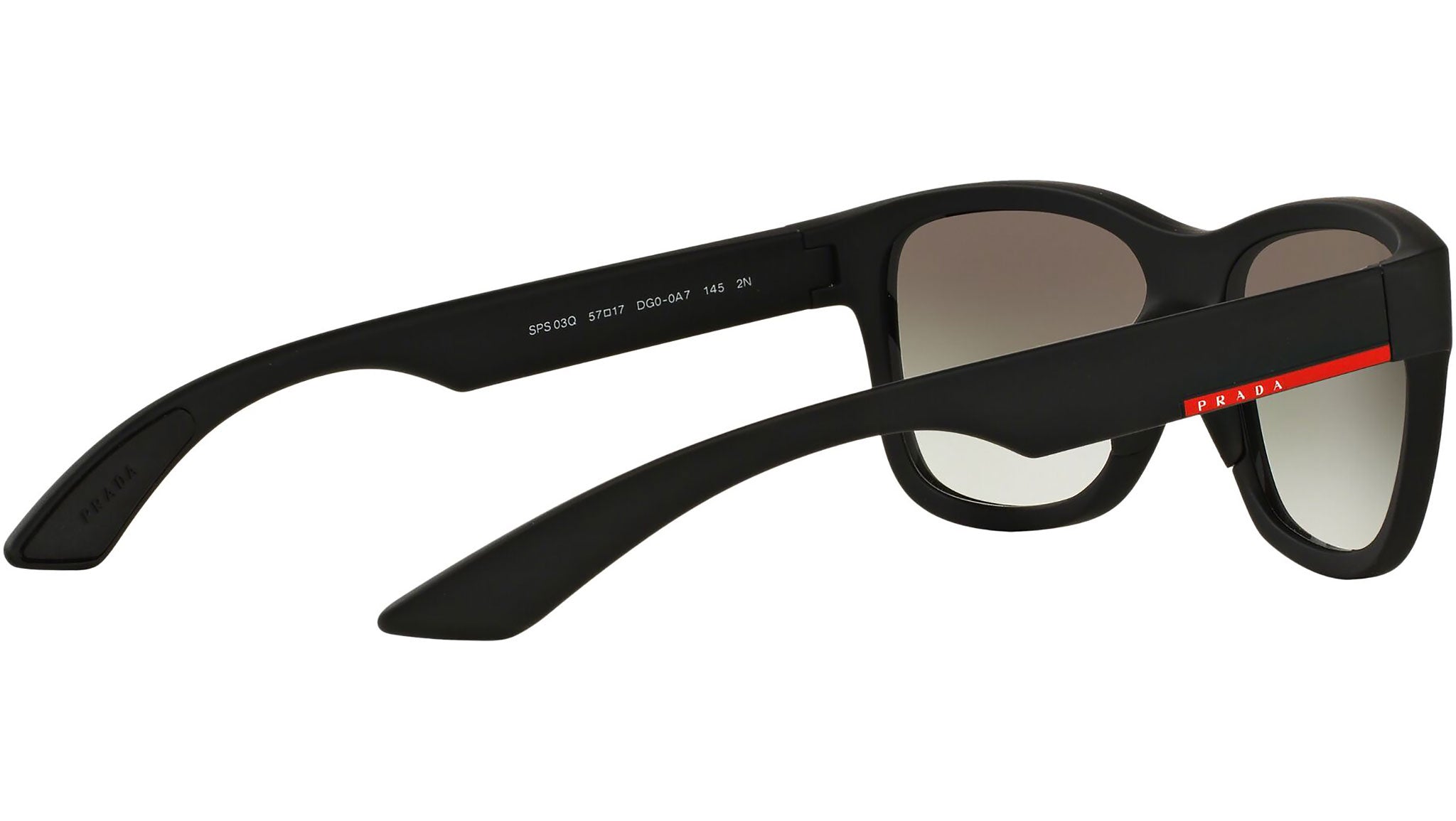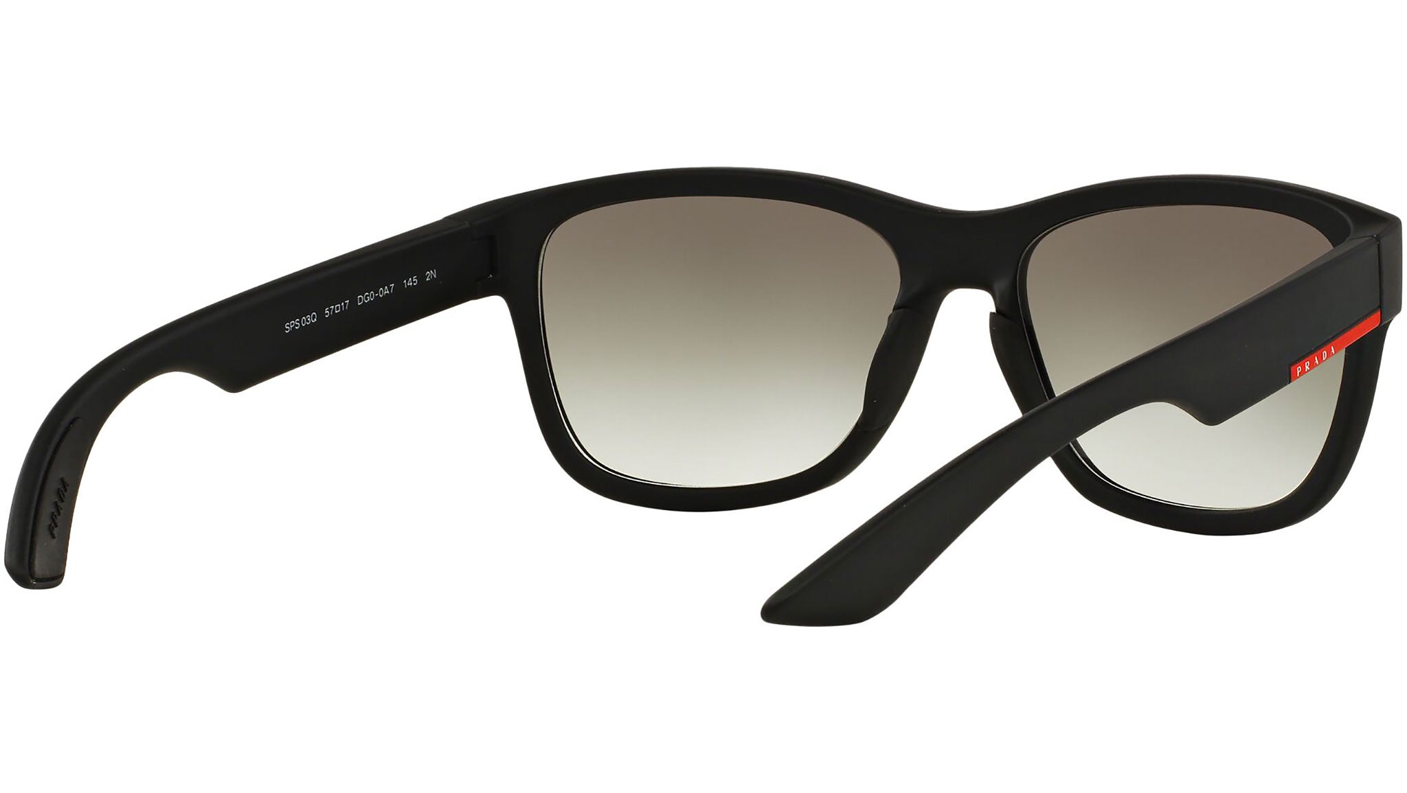 Prada Linea Rossa sunglasses model PS 03QS, black rubber frame variant, color code DG00A7 with grey gradient lens. Prada Linea Rossa Sun Collection conveys an everyday casual style with all the quality and craftsmanship of the Prada brand.
