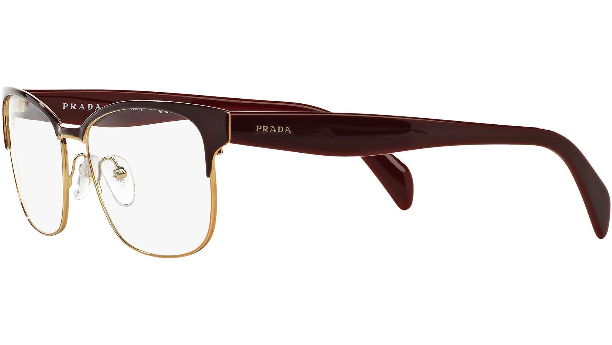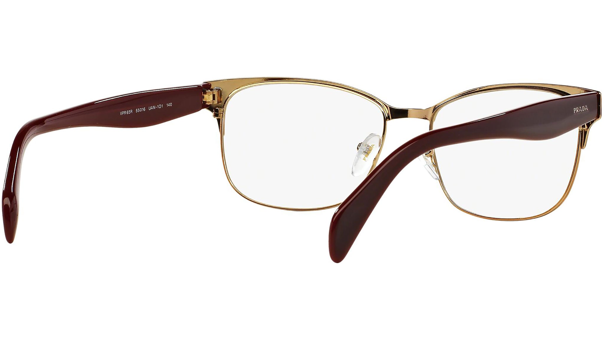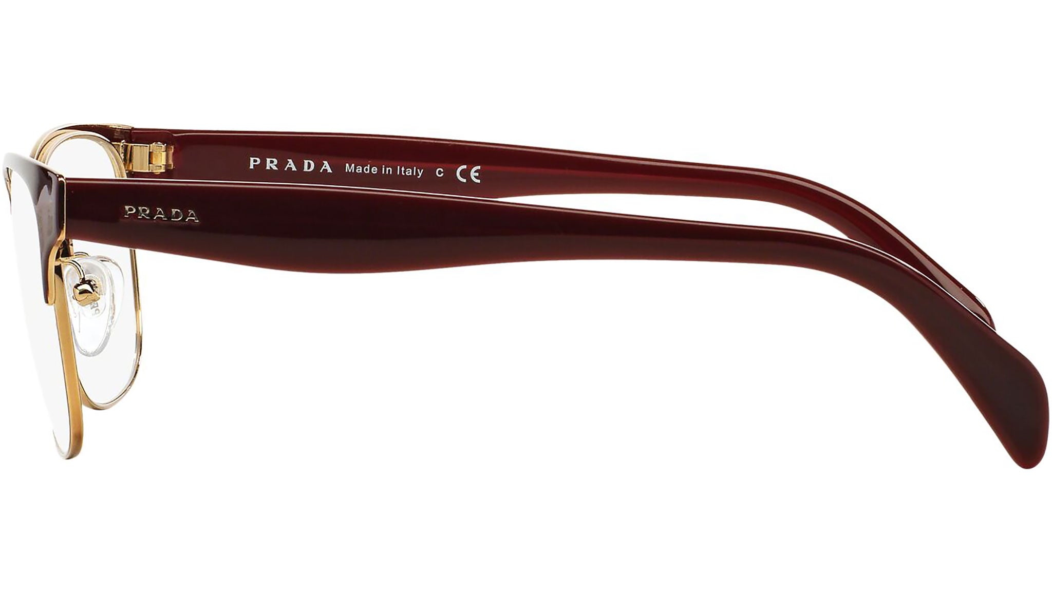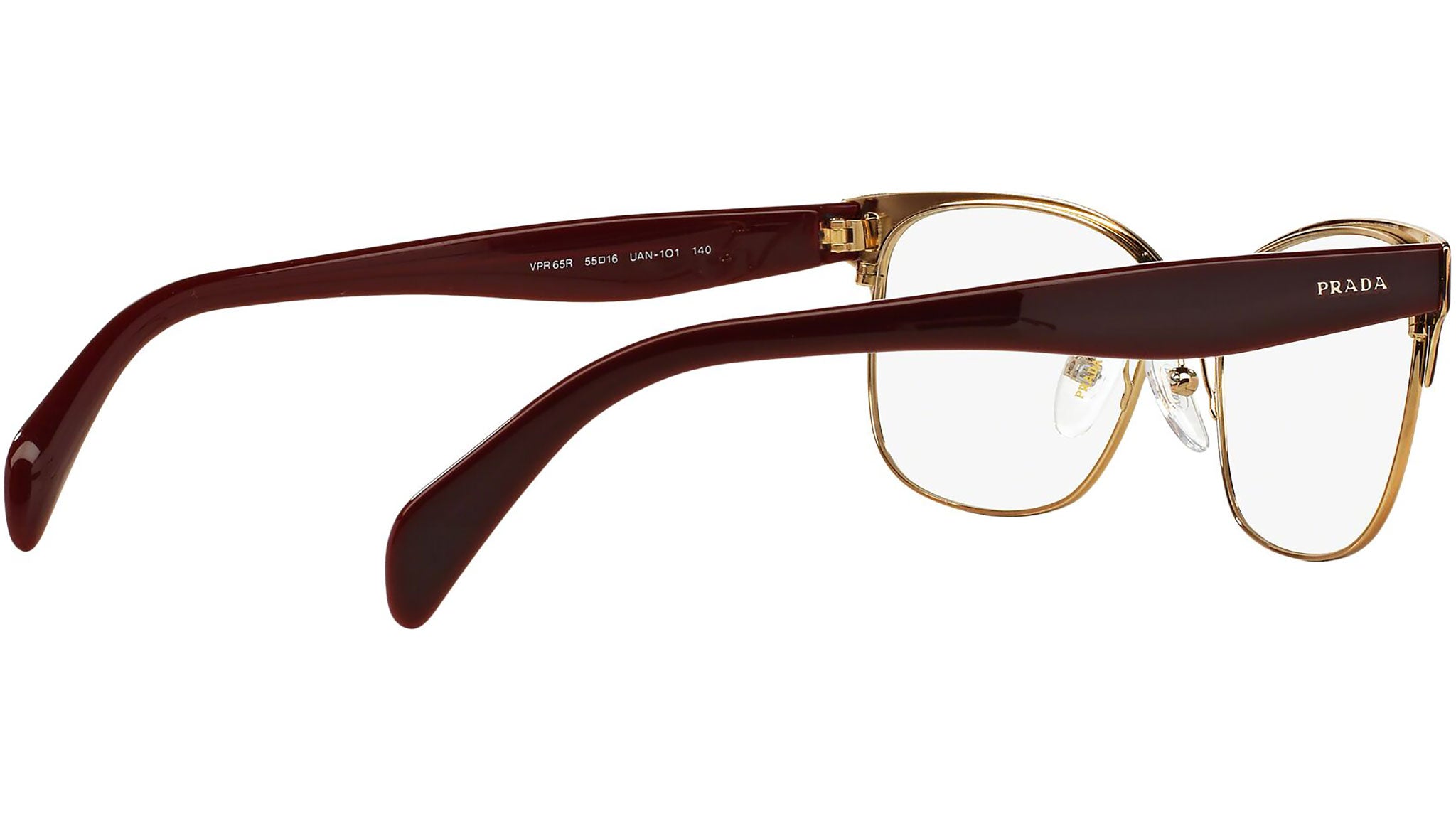 Prada Eyewear Collection model PR 65RV, bordeaux on pale gold frame variant, color code UAN1O1. Prada represents the best of Italian culture and tradition. It is one of the most innovative, prestigious and widely recognized brands in the fashion and luxury goods industries, with a keen attention to details and new trends.