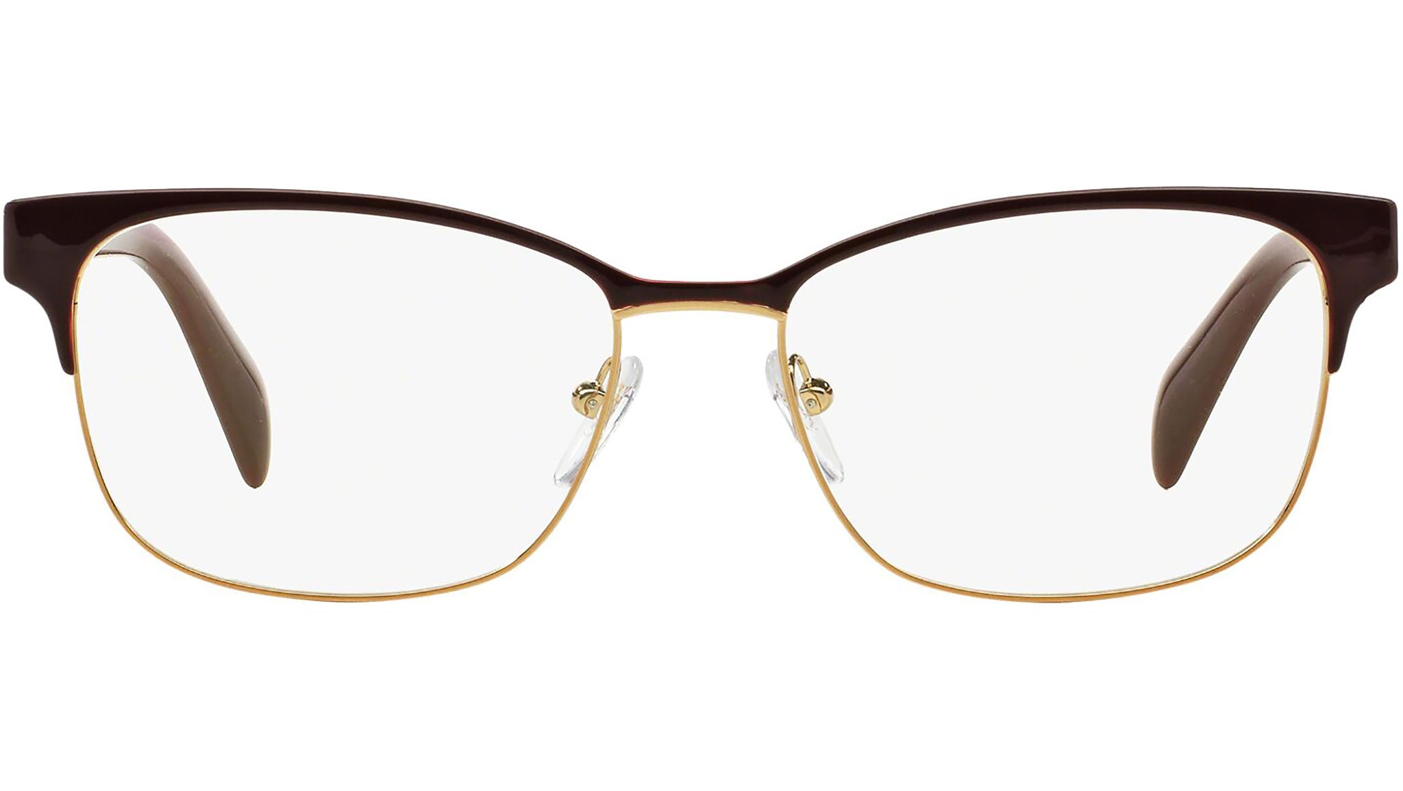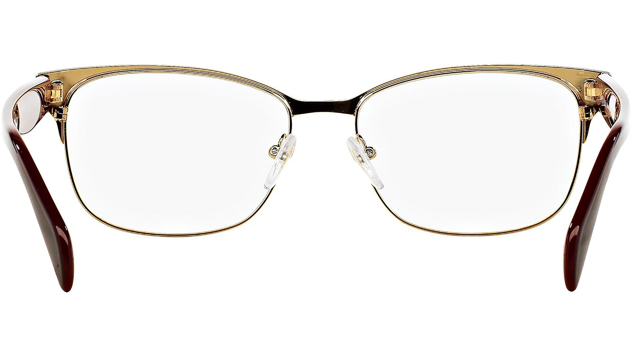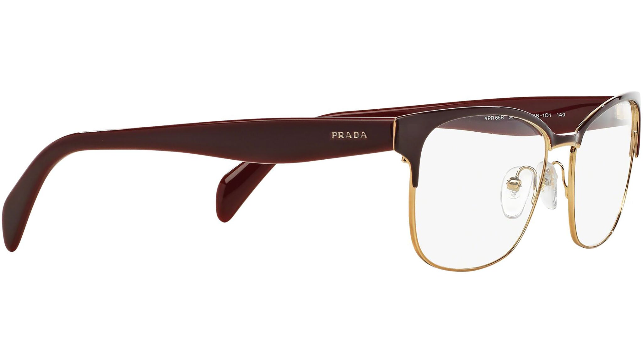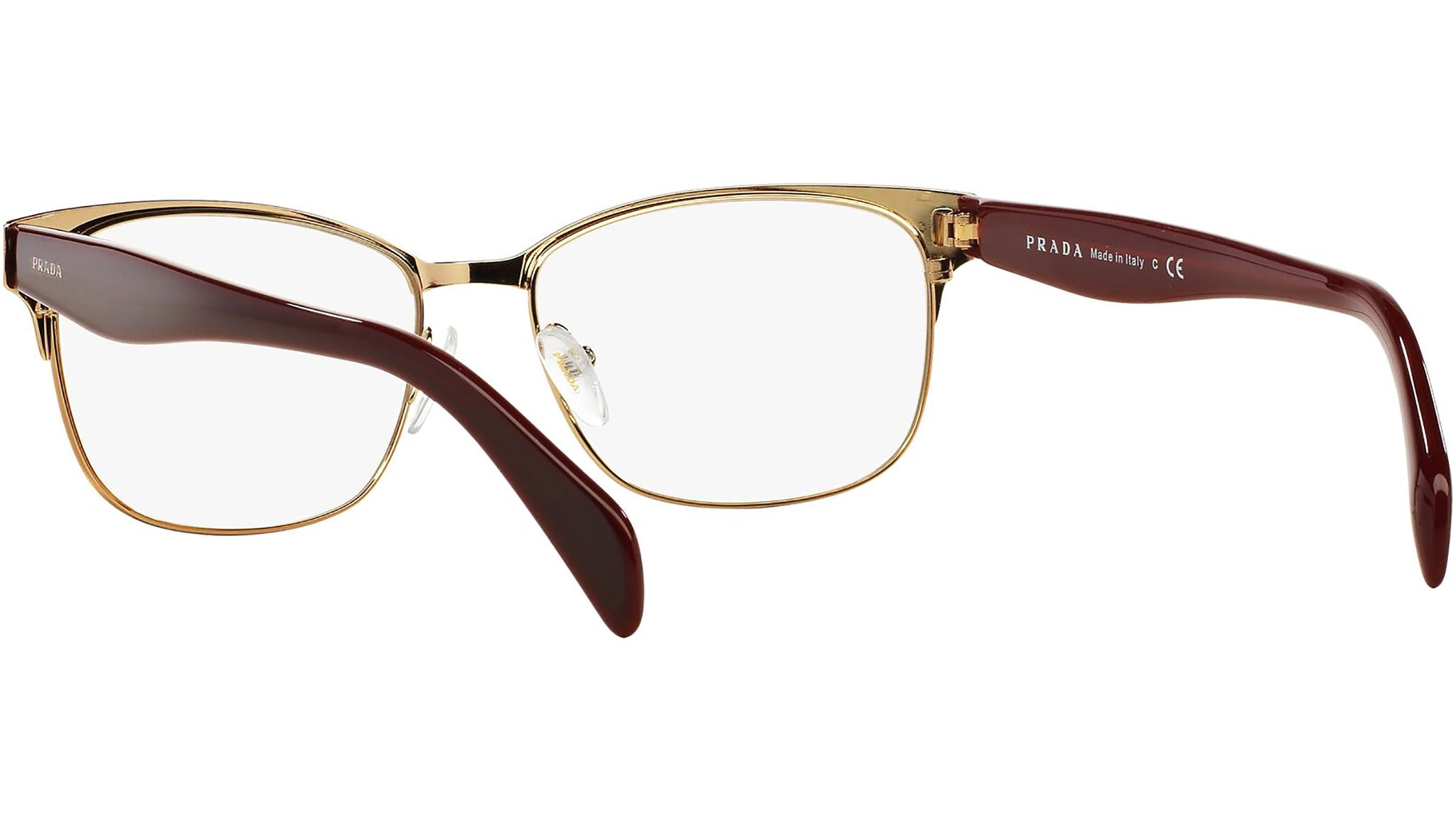Prada Eyewear Collection model PR 65RV, bordeaux on pale gold frame variant, color code UAN1O1. Prada represents the best of Italian culture and tradition. It is one of the most innovative, prestigious and widely recognized brands in the fashion and luxury goods industries, with a keen attention to details and new trends.